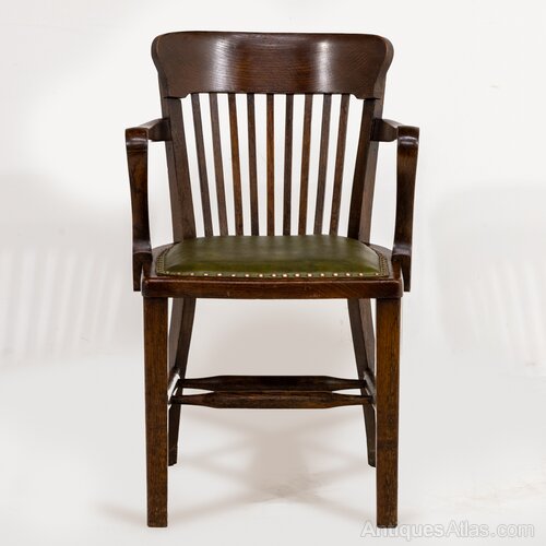 These 1940’s oak office chairs are robustly made with a great aesthetic with their spindle backs, stretchered bases, shaped arms and a green rexine studded seat. These are perfect for use with a desk in a workspace at home or the office, or seating at a dining table.We have 1 chair available, cost is per chair.