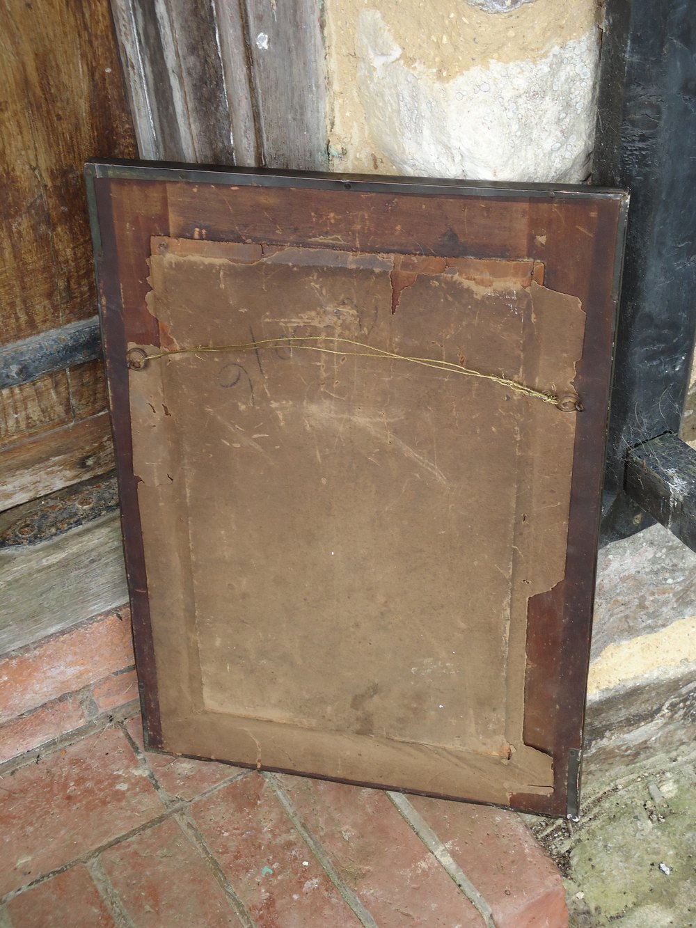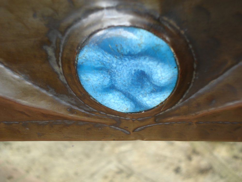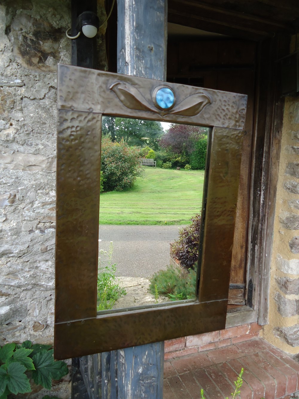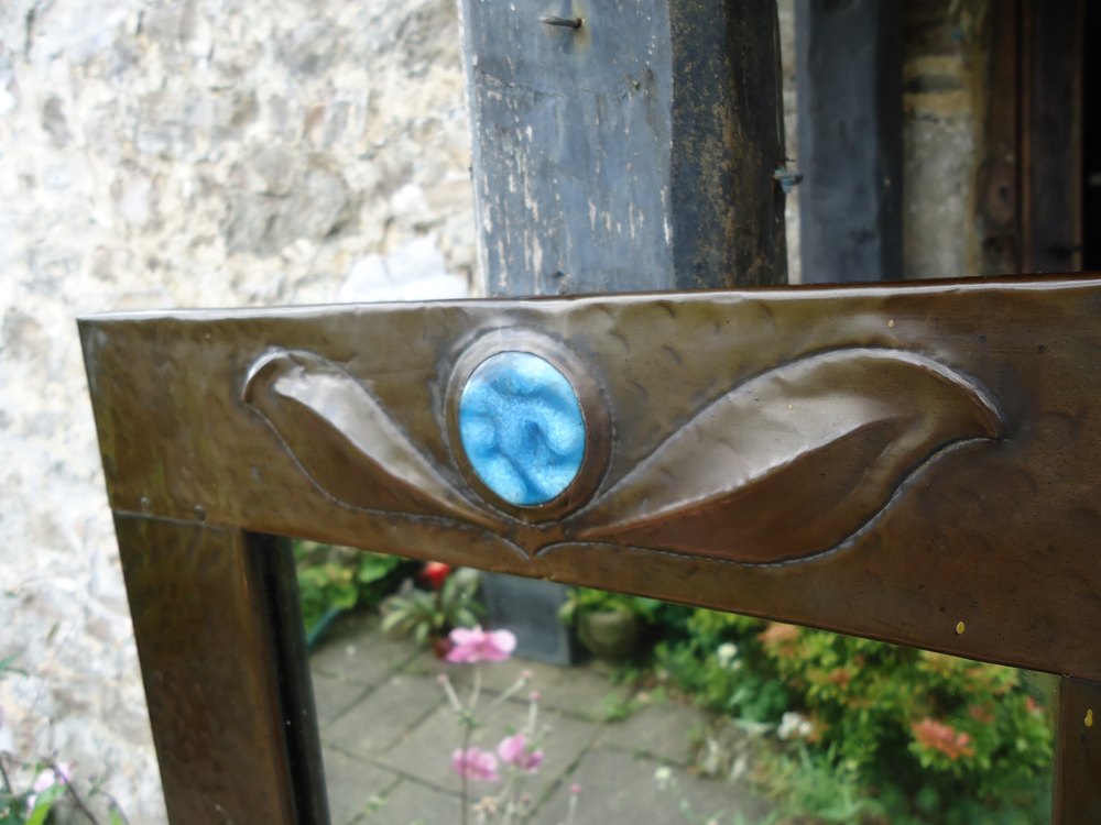 Lovely Arts & Crafts copper mirror with a ceramic cabochon set between two leaves in the liberty style. Offered in excellent original condition and perhaps has never been cleaned so has a wonderful rich patina.The frame measures 54cms x 39cms and the mirror plate which appears original and is not bevelled measures 39cms x 23cms.