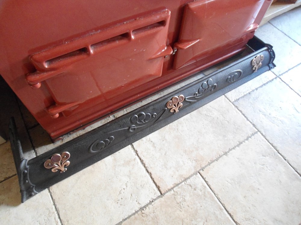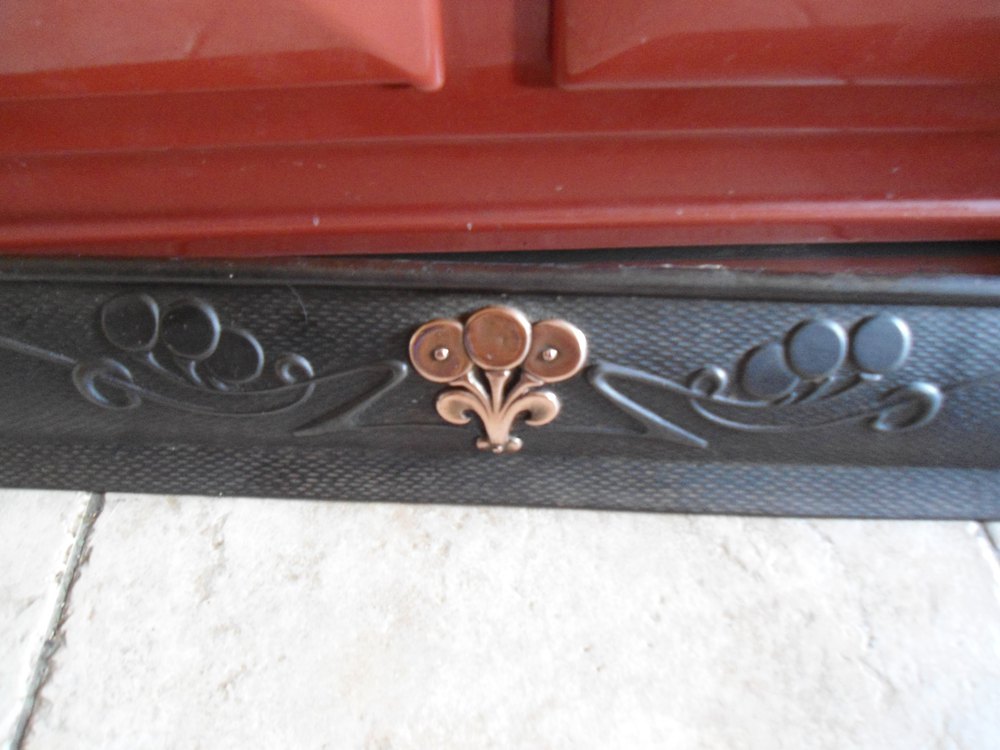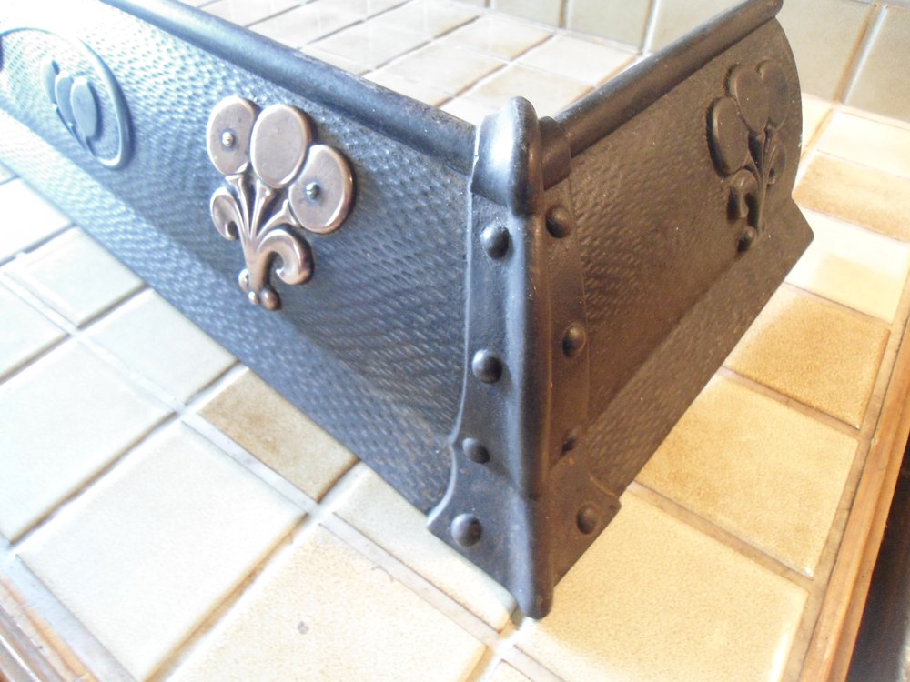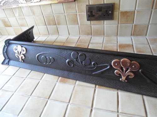 Stunning Arts & Crafts Cast Iron fender with an honestly design overlaid with copper floral motifs. A great addition to any fireplace as only the copper overlay would need to be cleaned to stand out against the darker background.Dated registration mark - late 1900 century.