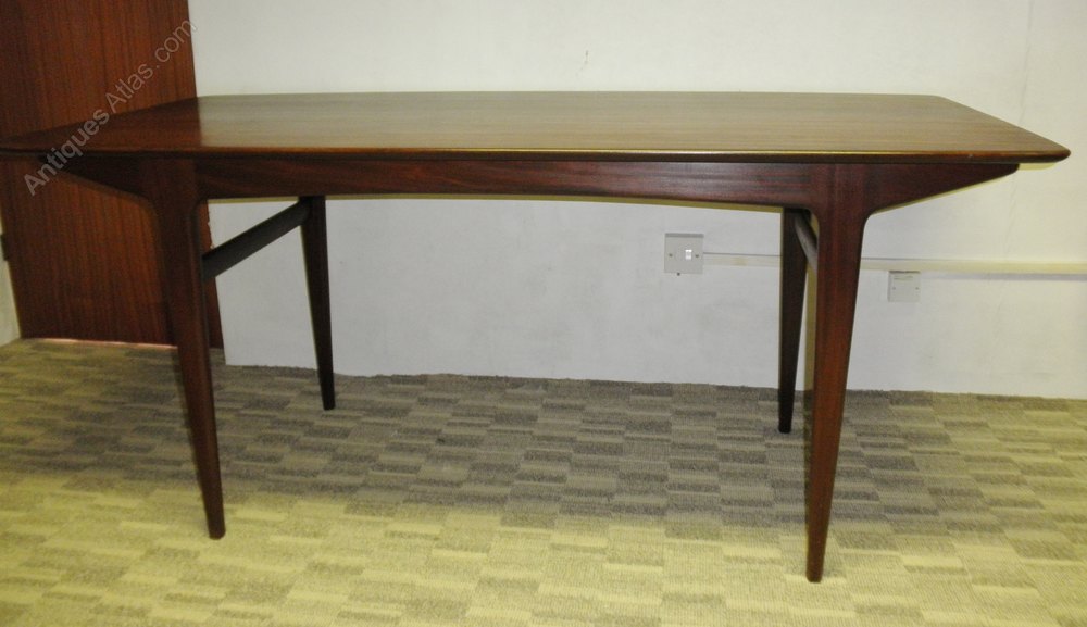 Dating from the 1960s and in the Danish style, this solid mahogany dining table designed by J Herbert for A Younger Ltd, known for their high-end fine quality furniture, this table was from one of their most popular 1960s ranges, Moselle.The beautiful rectangular dining table has a slightly tapering shaped top, raised on turned legs, constructed in Tola wood (West African mahogany) producing elegant clean, minimalist lines and is a rare find in such superb original condition.