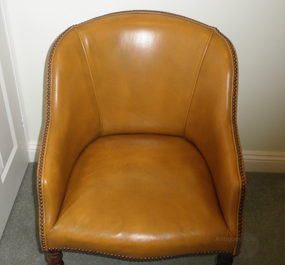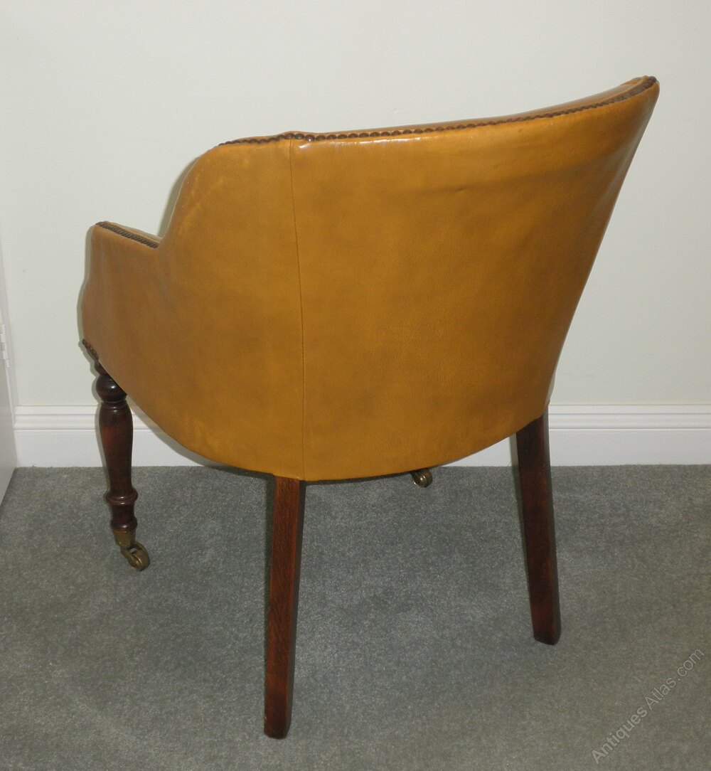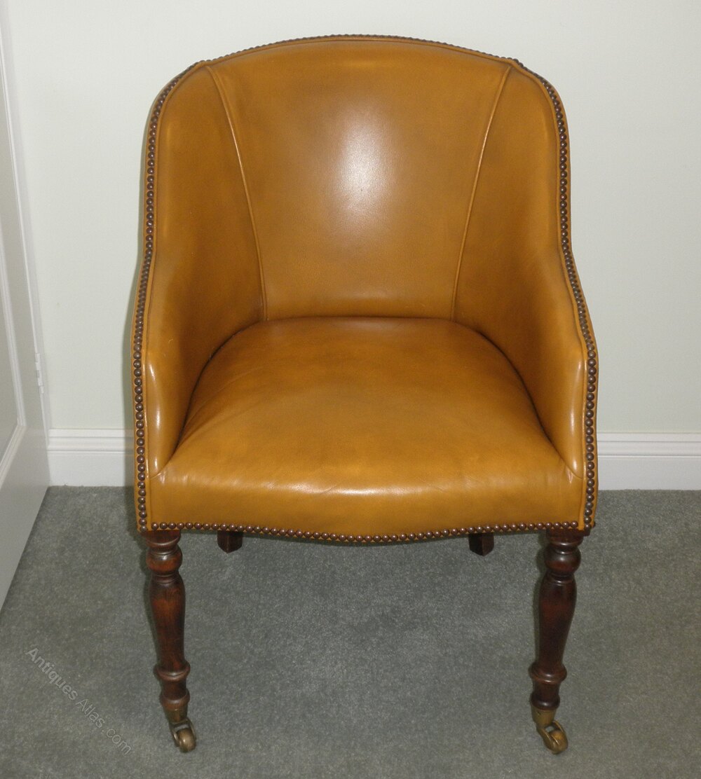 Dating from the 1950s, this vintage tub chair / desk chair covered in a sturdy cognac or mustard coloured leather has only minimal signs of creasing on the seat and features piped seaming with brass stud detailing. Raised on turned front legs with brass castors and sabre rear legs, this very attractive seat could be positioned anywhere in the home to provide a very attractive and useful addition.Dimensions: H 32”/82cm, W 23”/58cm, D 25½”/65cm, Seat H 17½”/45cm.