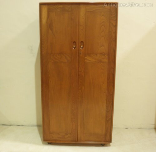 Ercol Windsor Two-Door Single WardrobeFirst introduced in 1958, this Ercol Windsor single wardrobe was made from solid elm with two attractively figured doors and has the distinctive Ercol oval handles with embossed key for the working lock. The interior comprises a solid wood panelled back, full width beech hanging rail and is raised on sturdy castors for ease of movement.