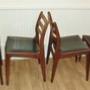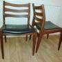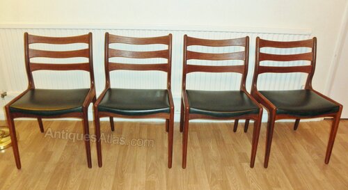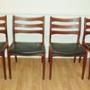 A mid 20th century classic set of four Danish style dining chairs, designed by Robert Heritage for Archie Shine and made from beautifully patterned afromosia (dark teak) in a modern ladder-back form comprising three cross bars spanning between the shaped rear upright and strong black leather inset seats. One seat pad has a very small nick (see photo) but otherwise all the leather is in excellent condition as are the chair frames.DateRetro :