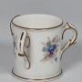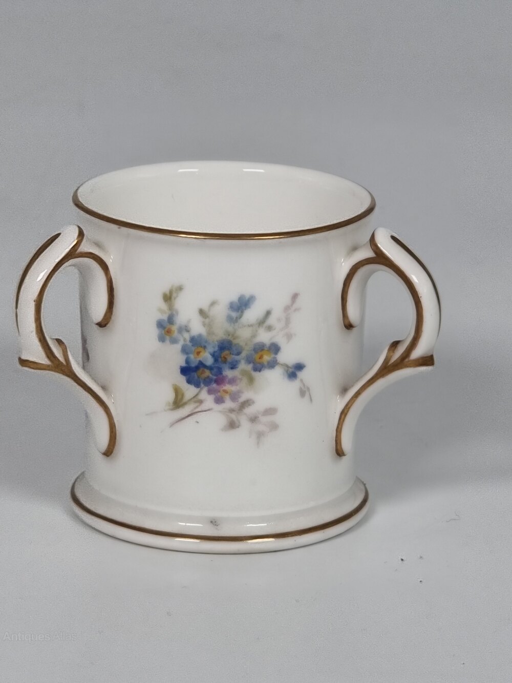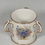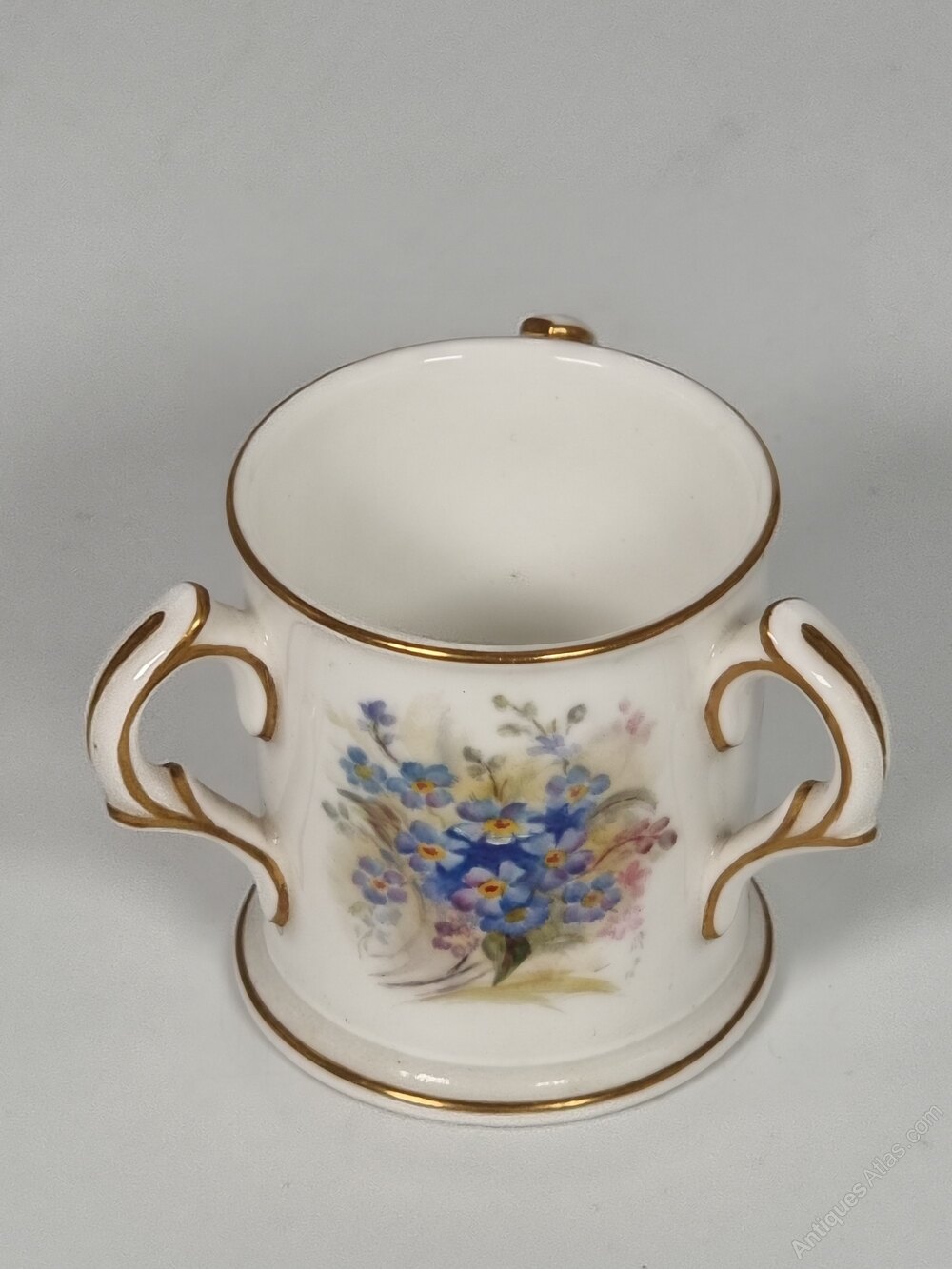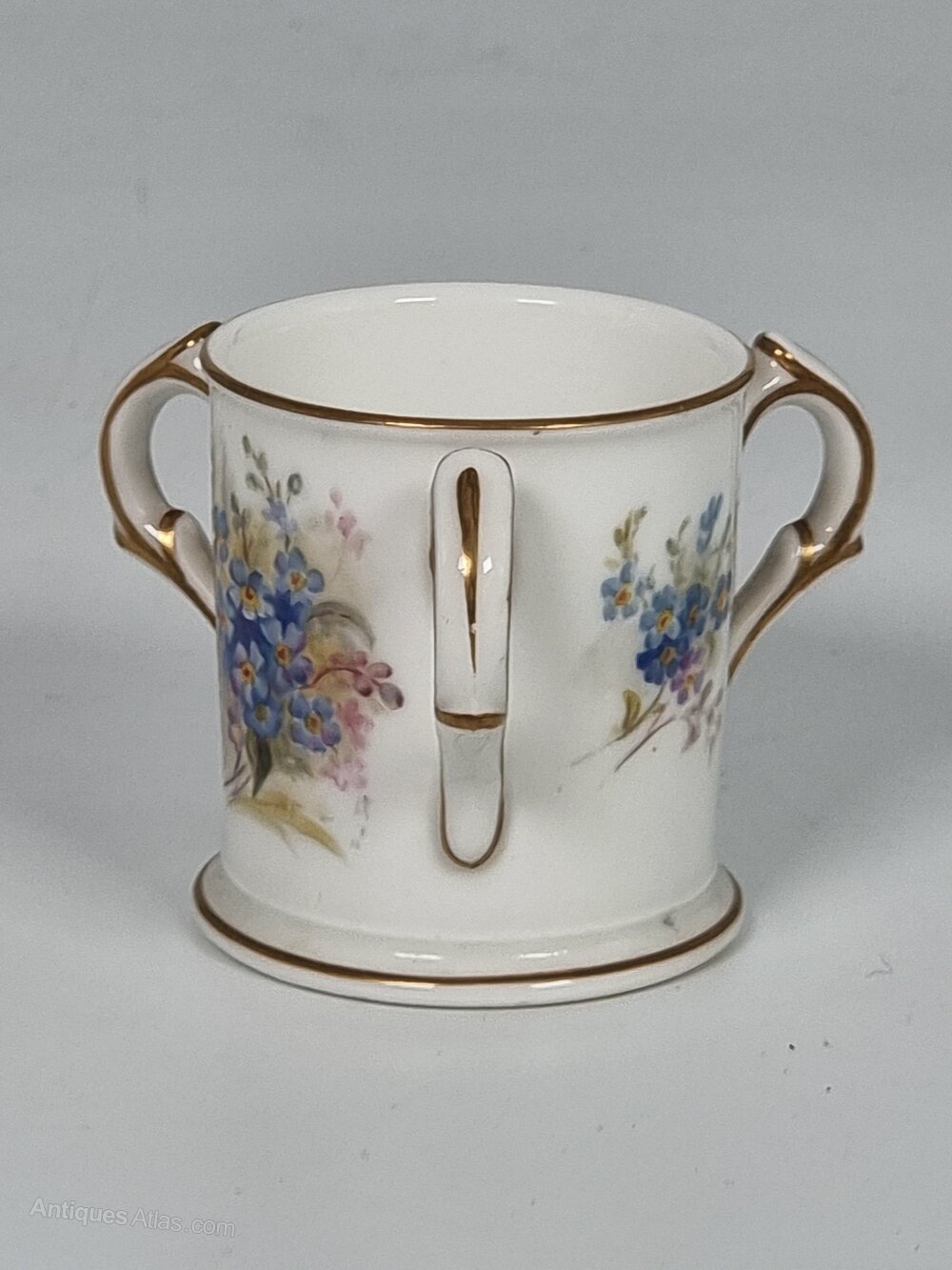 This delightful early 20th century hand painted Royal Worcester porcelain miniature loving cup has a white ground with fabulous hand painted sprays of forget-me-nots. These are centralised between the three handles, which are decorated with gilt lines, as is the foot and rim.The factory date mark is 1922.
