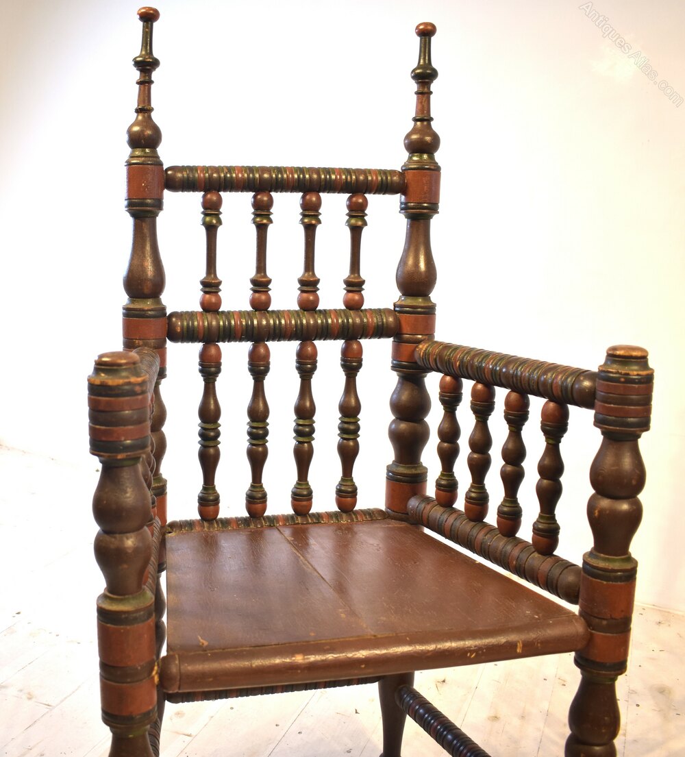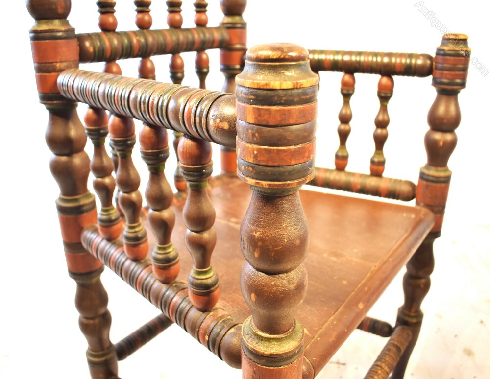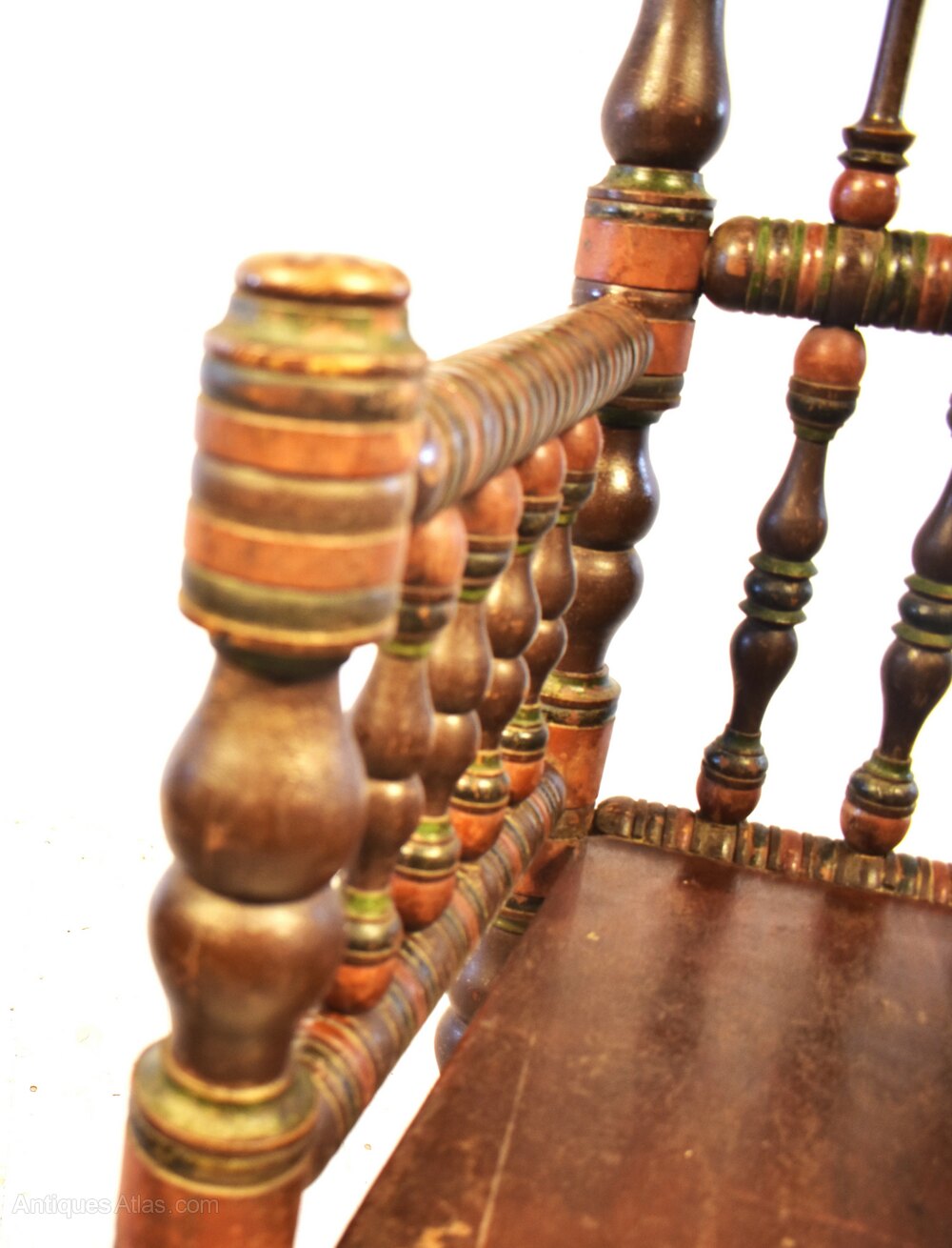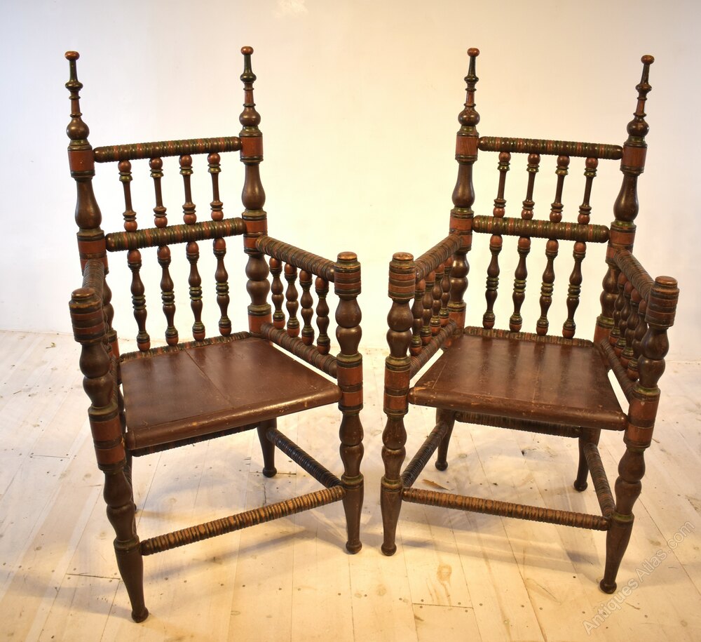 A pair of early 19th century Scandinavian turned chairs probably Swedish. Turned from a hard pine sometimes called Baltic redwood. These chairs are in their original paint in red, brown, green, and black and are in remarkably good condition. Something a bit different, great for making a statement.For more photos or a more detailed condition report on any of these pieces please contact us any time.