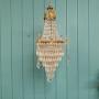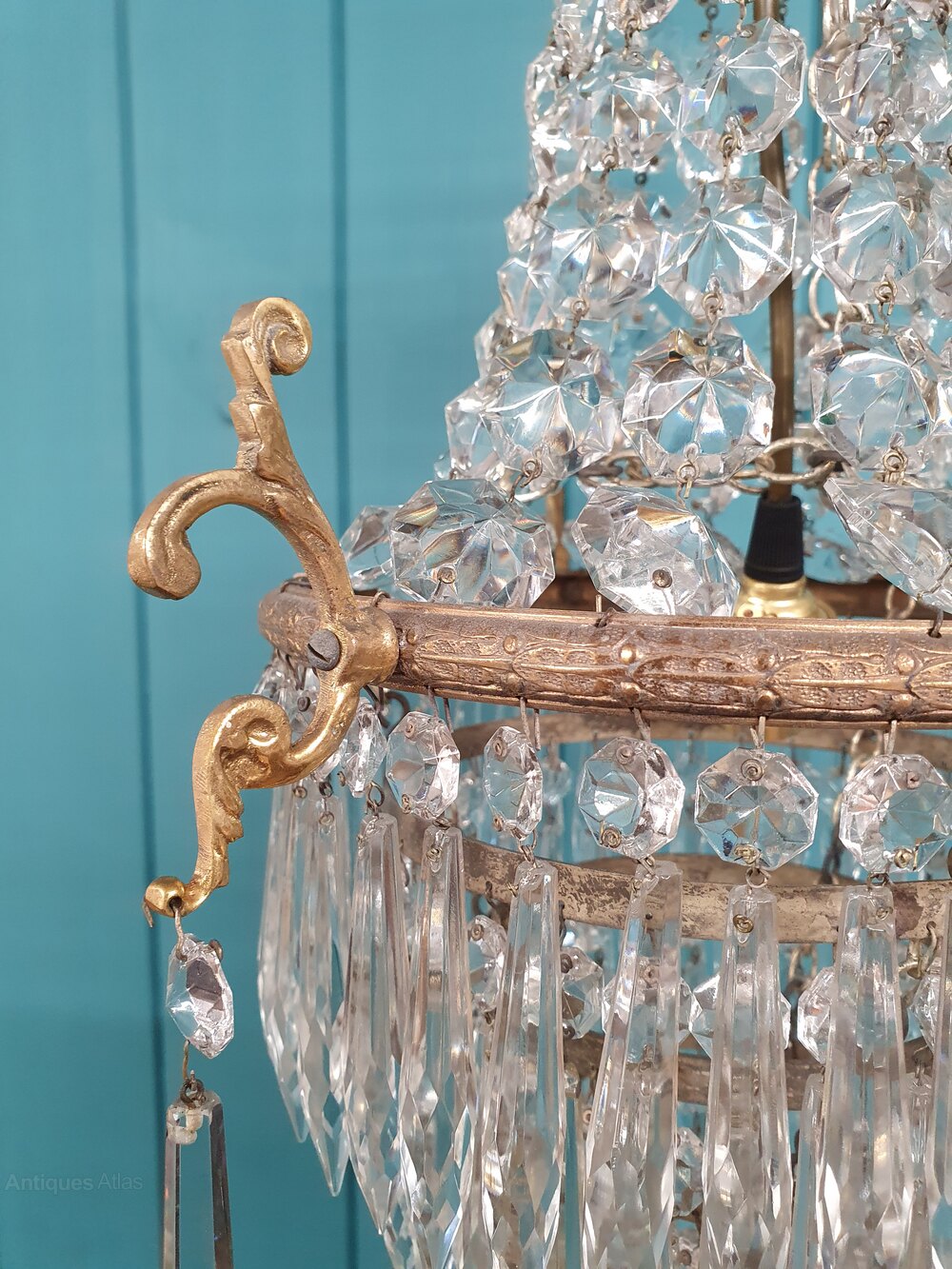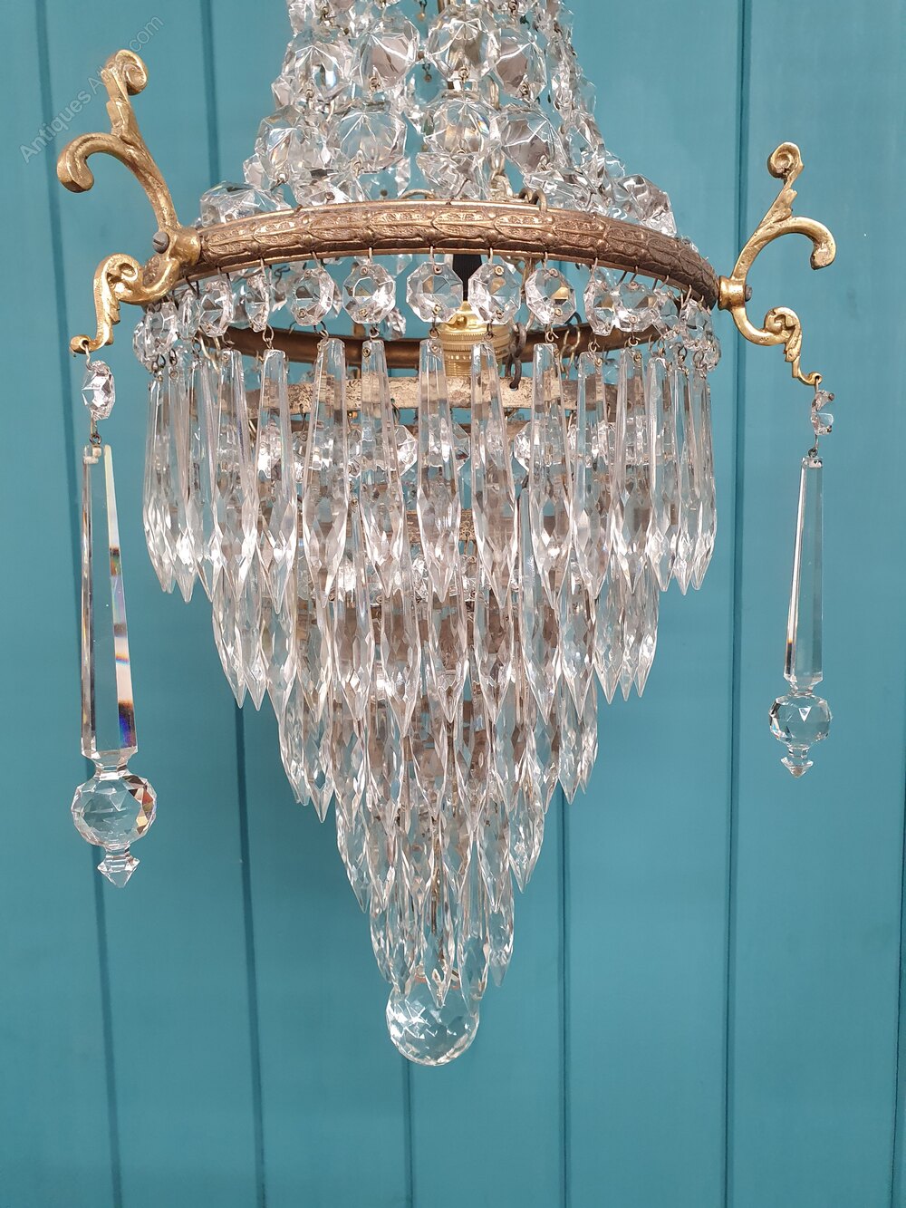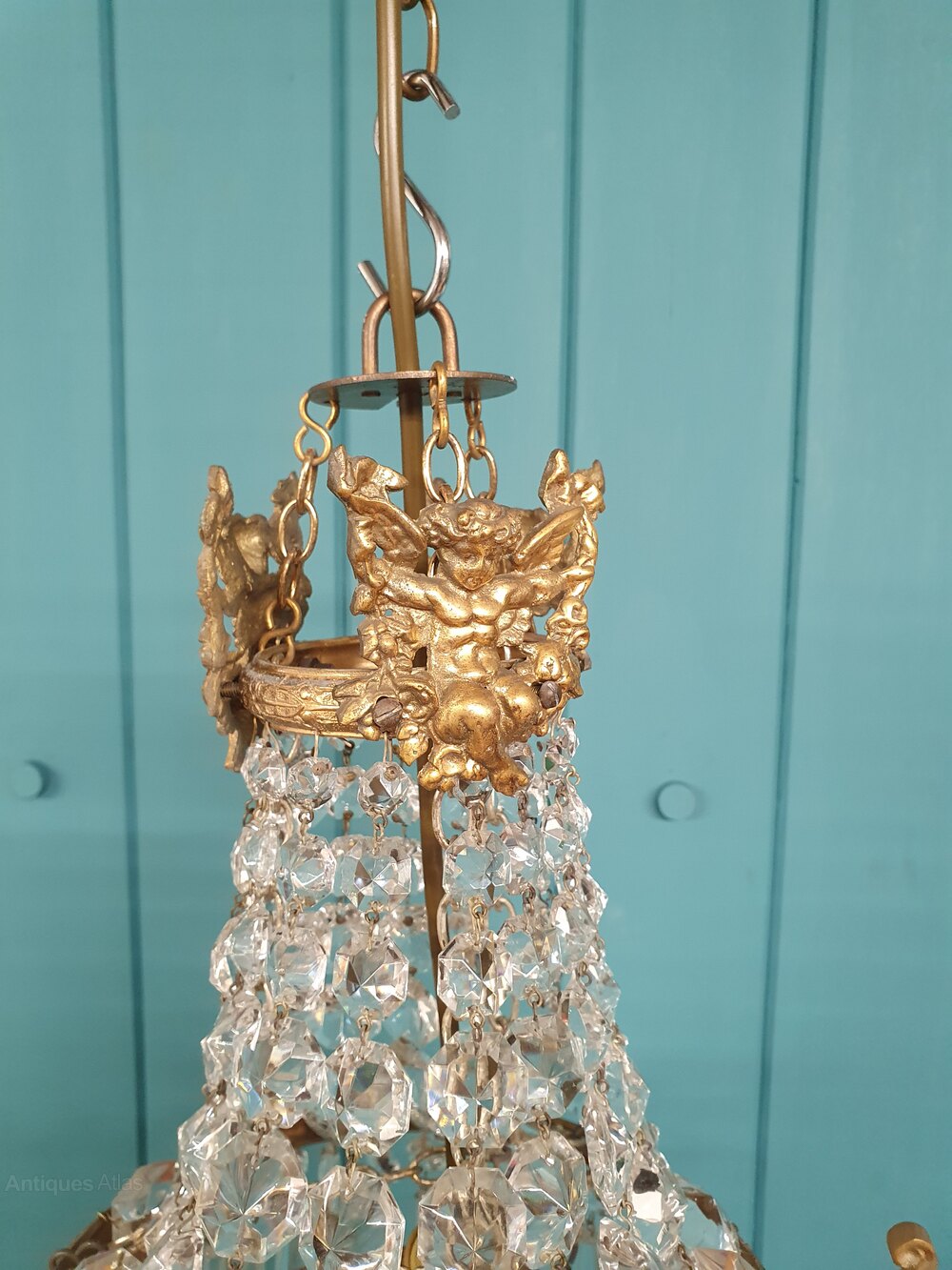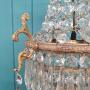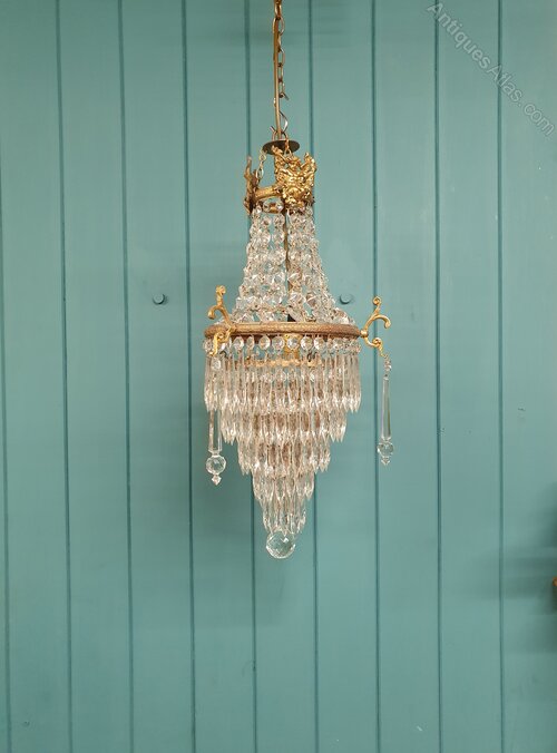 This lovely spike chandelier has swags to the top decorated with cherubs. With five layers of cut glass crystal spikes finished with a glass ball. The moulded brass ring to the centre is decorated with leaves with oversized decorative spikes. The size of the ring without the finials is 22 cm. It comes with a large bayonet bulb holder B 22.Date1930s :