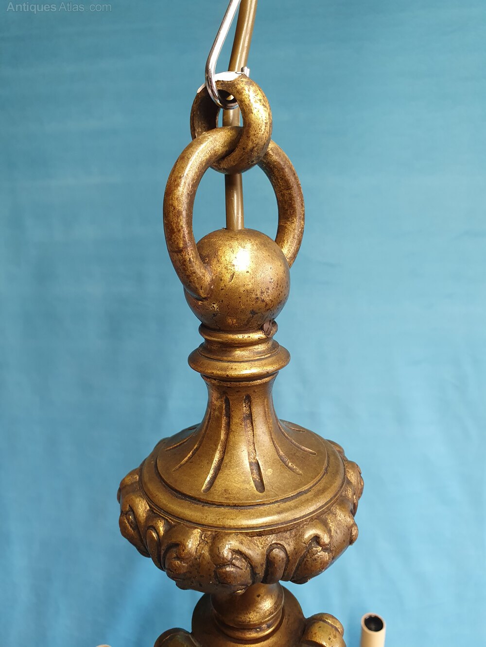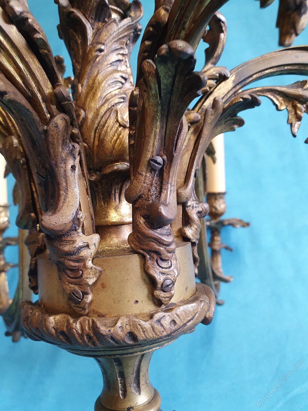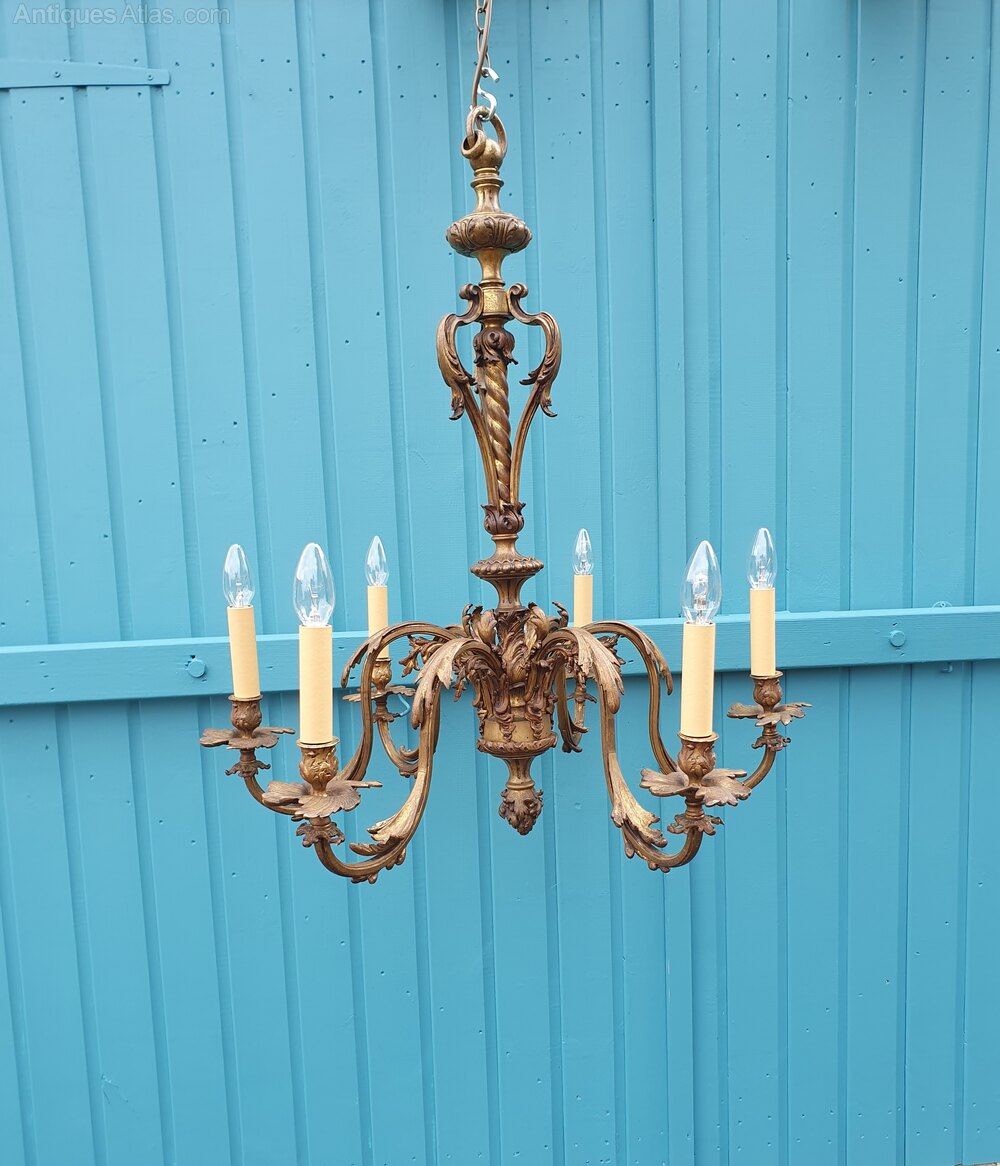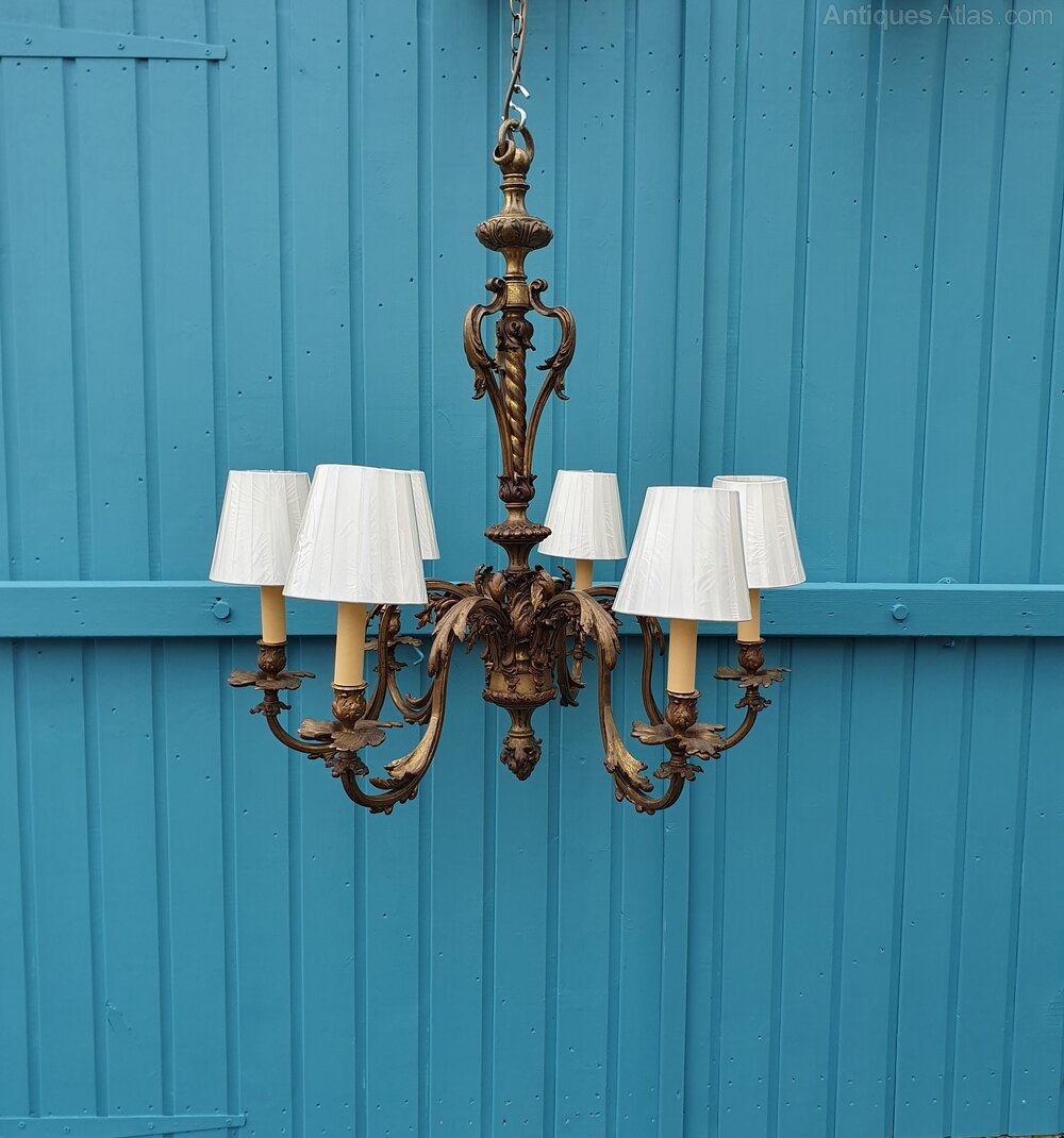 This chandelier has C scroll decoration to the main column with and a barley twist Centre. The arms are square decorated with C scroll and leaf decoration. Super quality casting with a bronze looking finish. This piece has small screw bulb holders. Please ask about clip shades.Date1930s :
