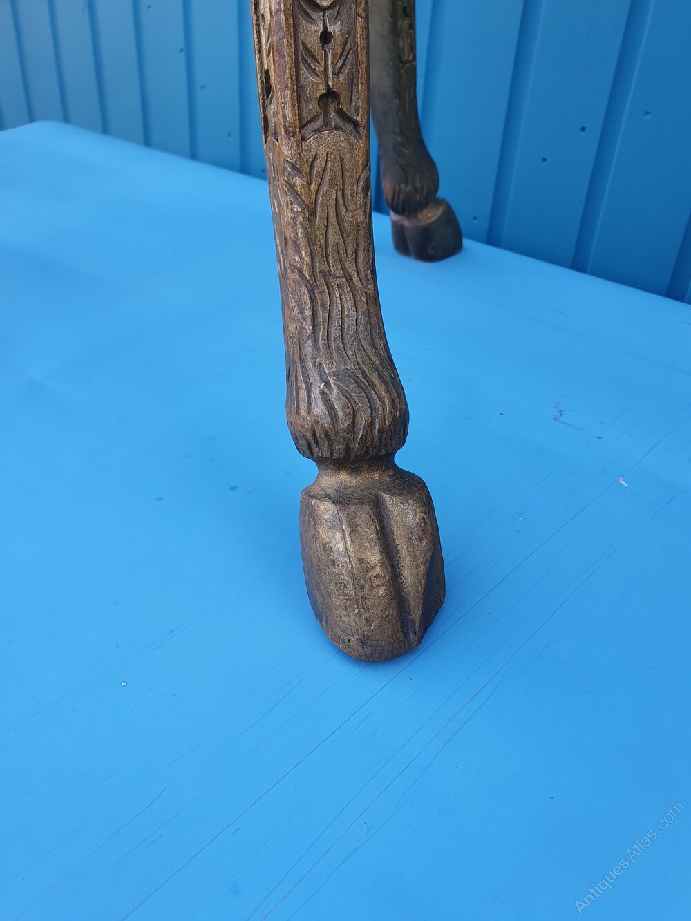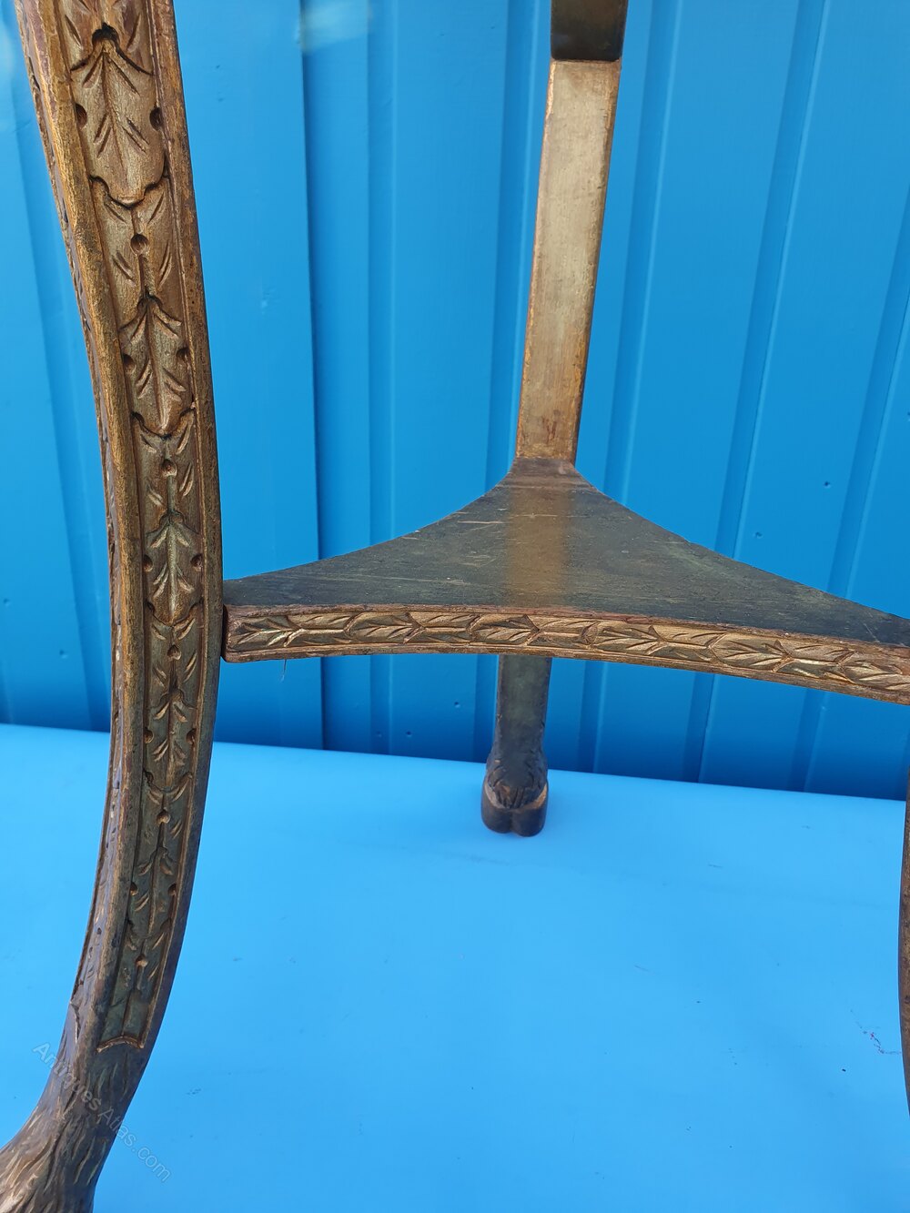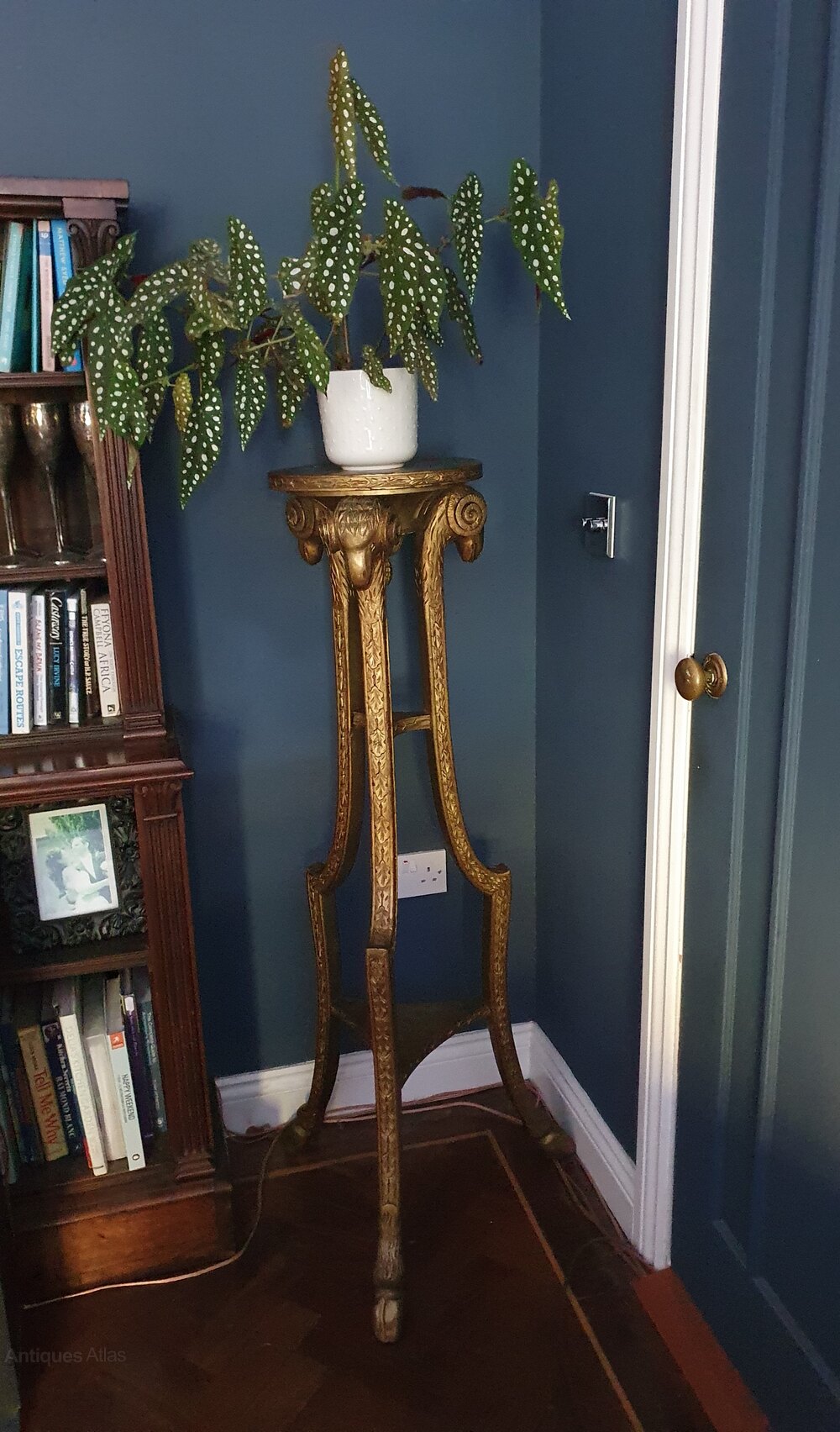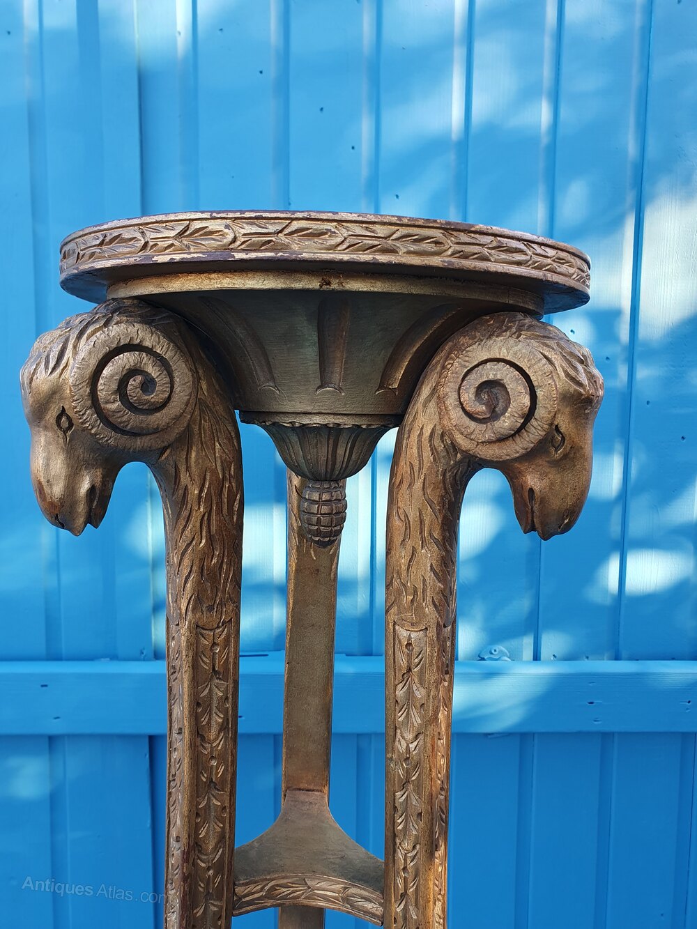 Unusual gilt torchère with ram’s heads. The piece is gilt, with carved decoration underneath the top section, finishing in an acorn. The legs are carved and stand on hooves with lead inserts to make the piece more stable. The width between the feet is 56 cm, and the top is 31 cm wide.DateLate 19th Century :