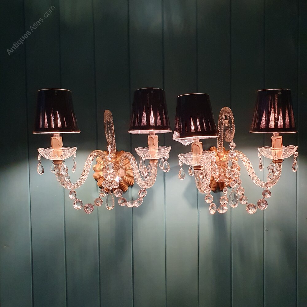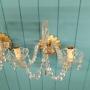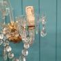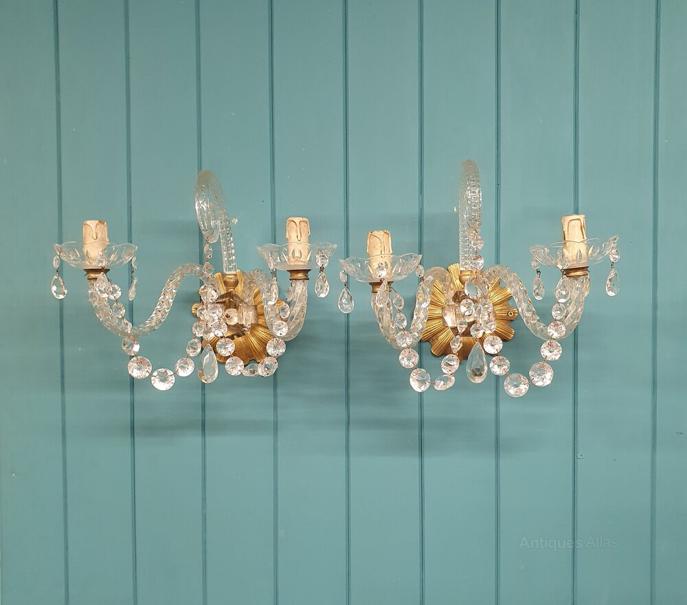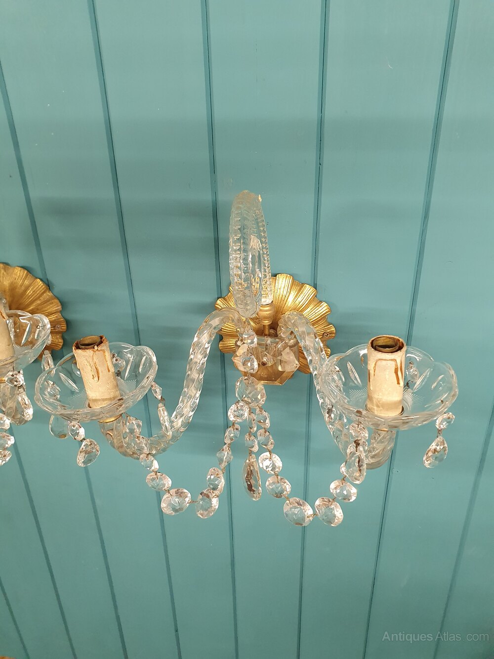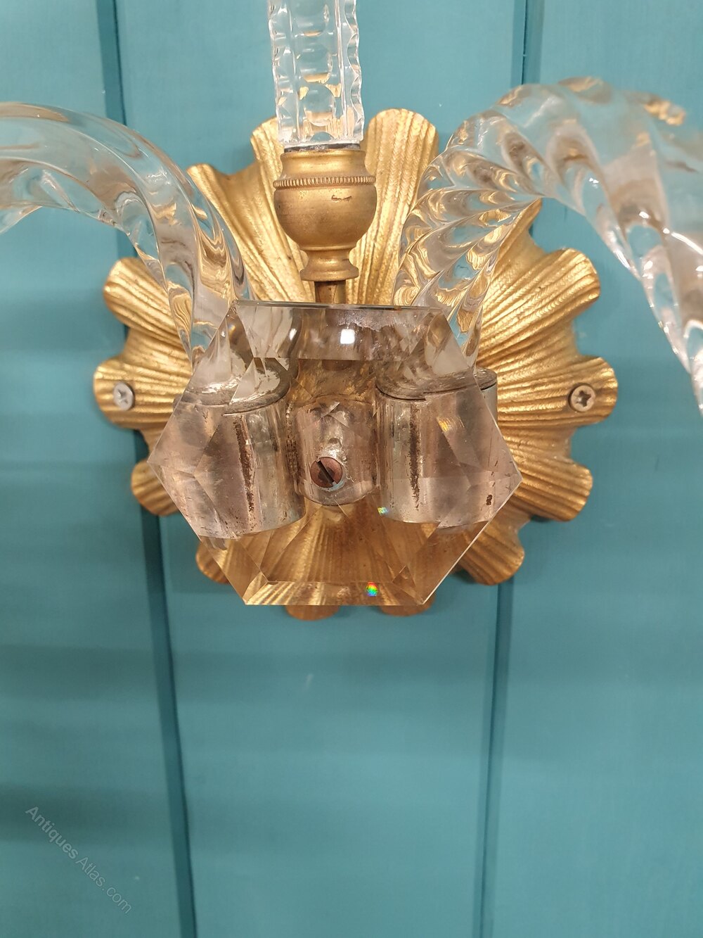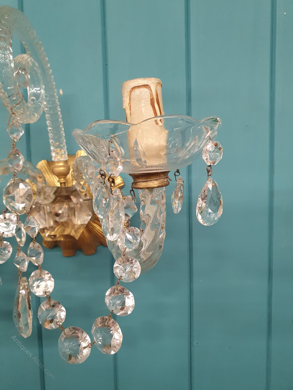 This pair of French wall lights are in glass and brass. They have brass back plates in the style of a clamshell, measuring 14 cm. From this come twisted glass arms and a decorative C-scroll in the centre. This piece has swags between the arms and candle bowls decorated with drips. These wall lights have small bayonet bulb holders B15.Dimensions in centimetres
