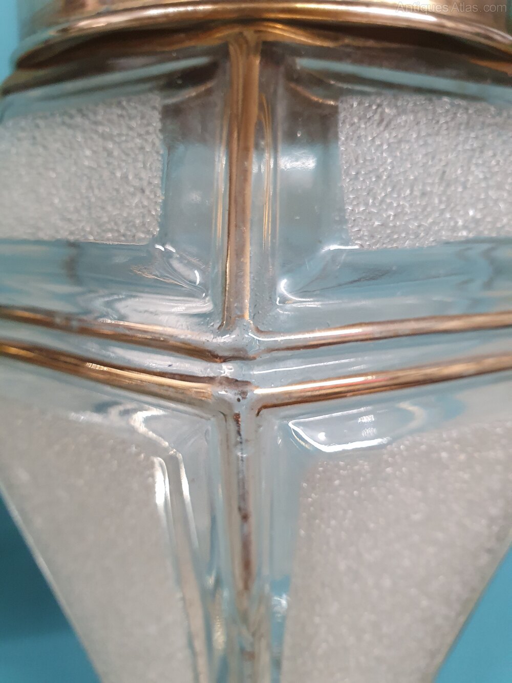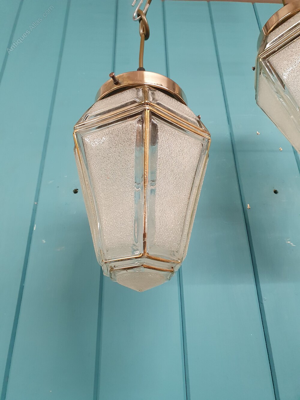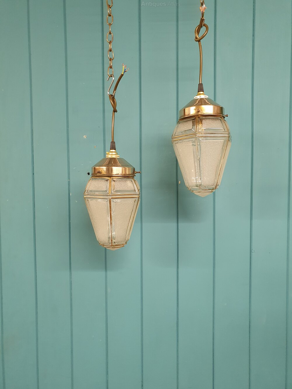 This pair of lanterns are in brass and glass. They are suspended from bulb holders. For bulb access, you undo the three screws and the glass section drops off. The glass section is framed with a brass surround. These lights come with large bayonet bulb holders B22.Dimensions in centimetres
