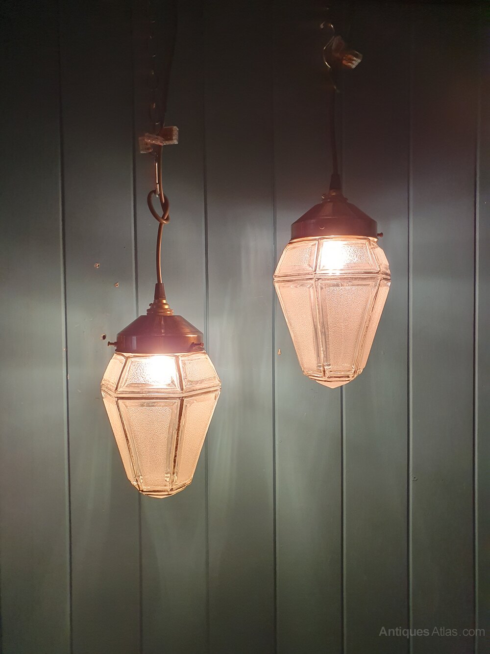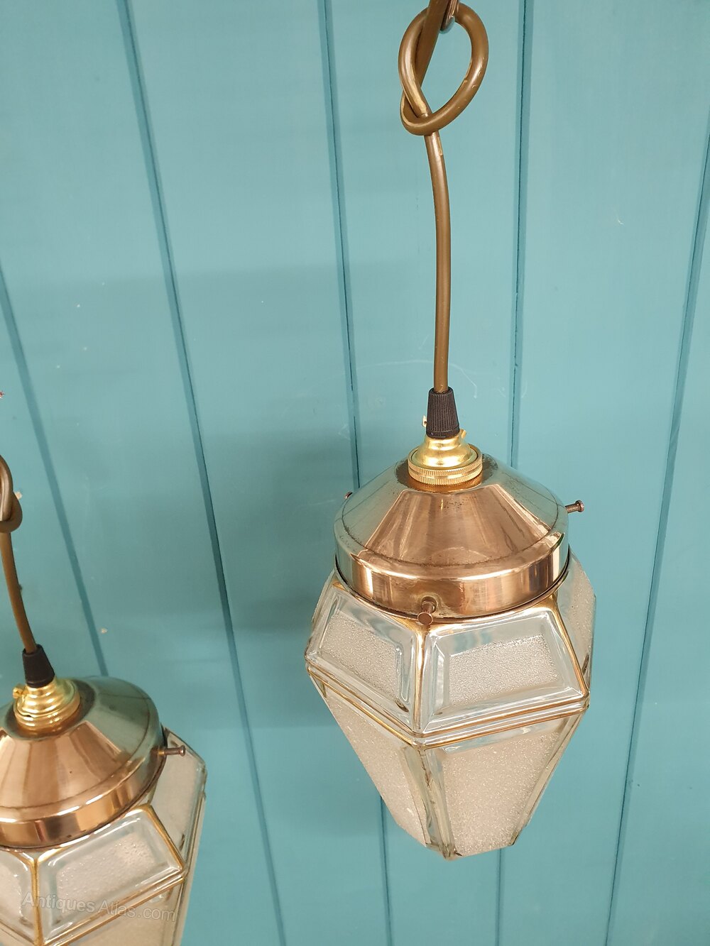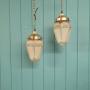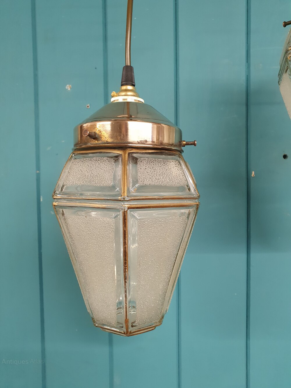 This pair of lanterns are in brass and glass. They are suspended from bulb holders. For bulb access, you undo the three screws and the glass section drops off. The glass section is framed with a brass surround. These lights come with large bayonet bulb holders B22.Dimensions in centimetres