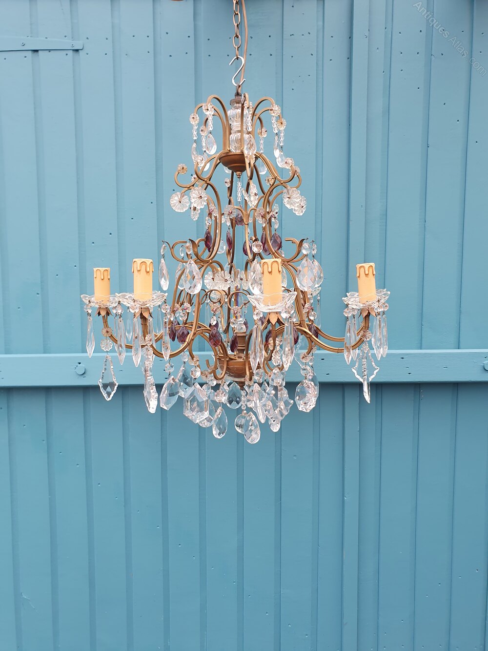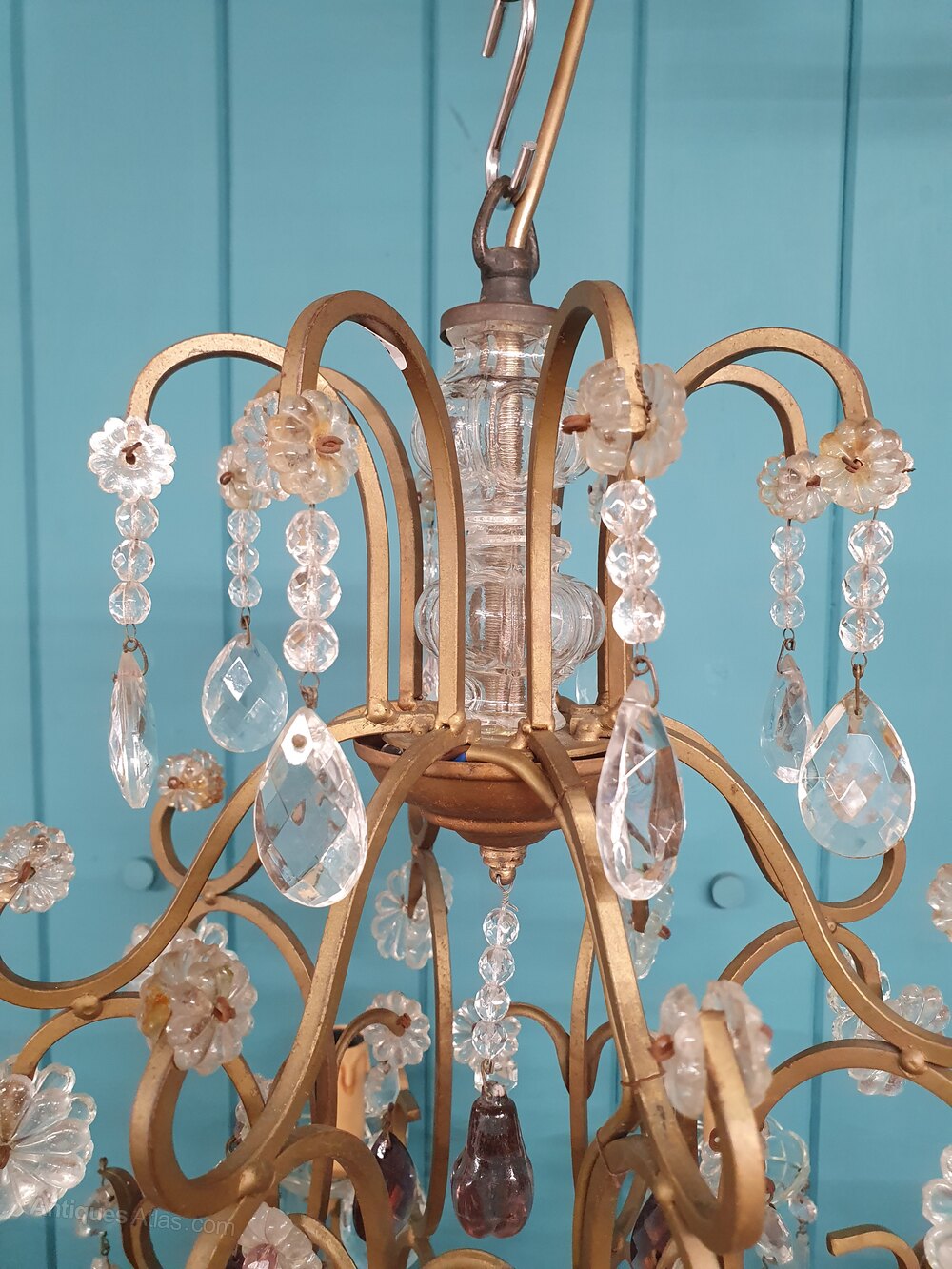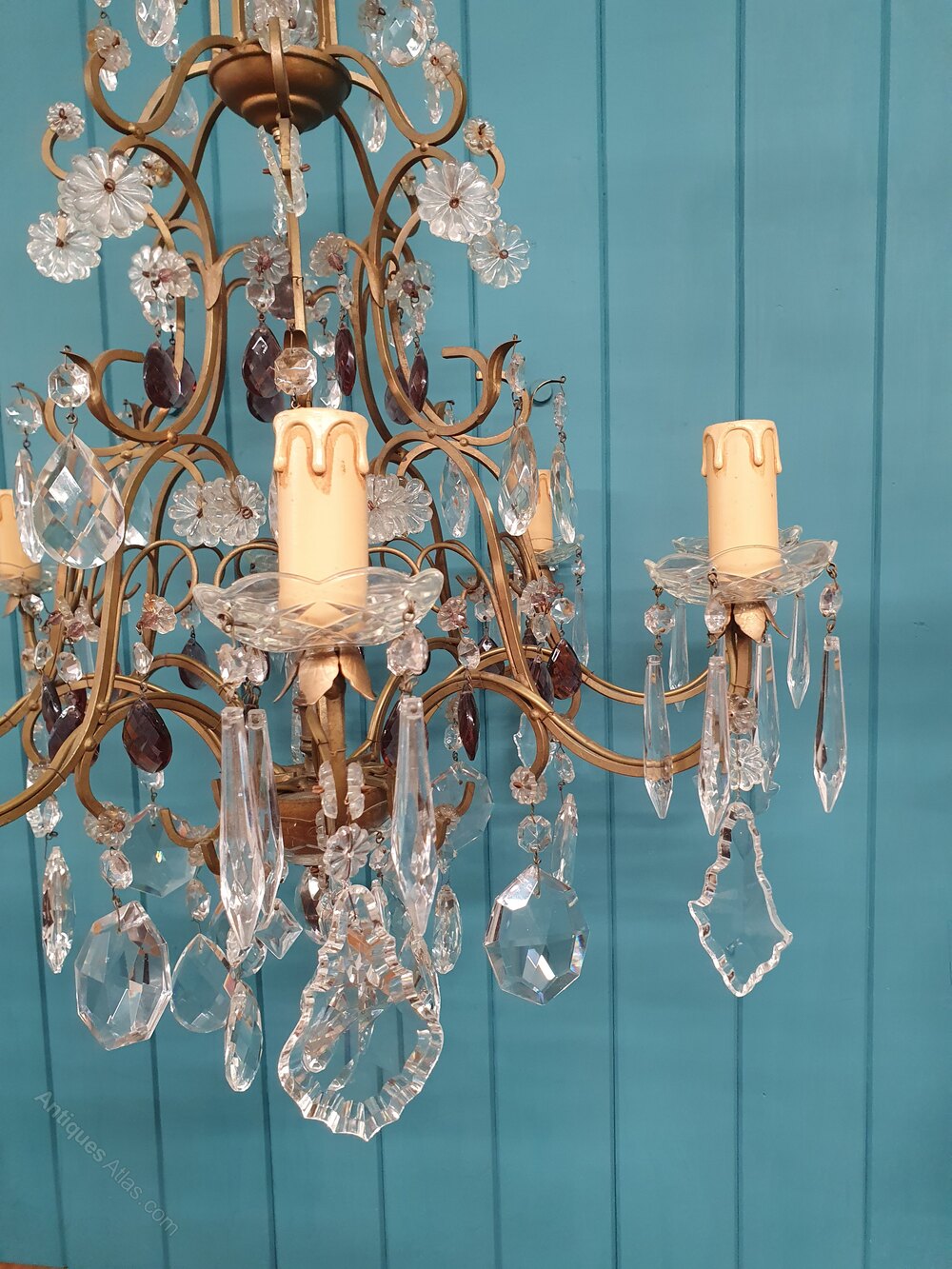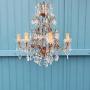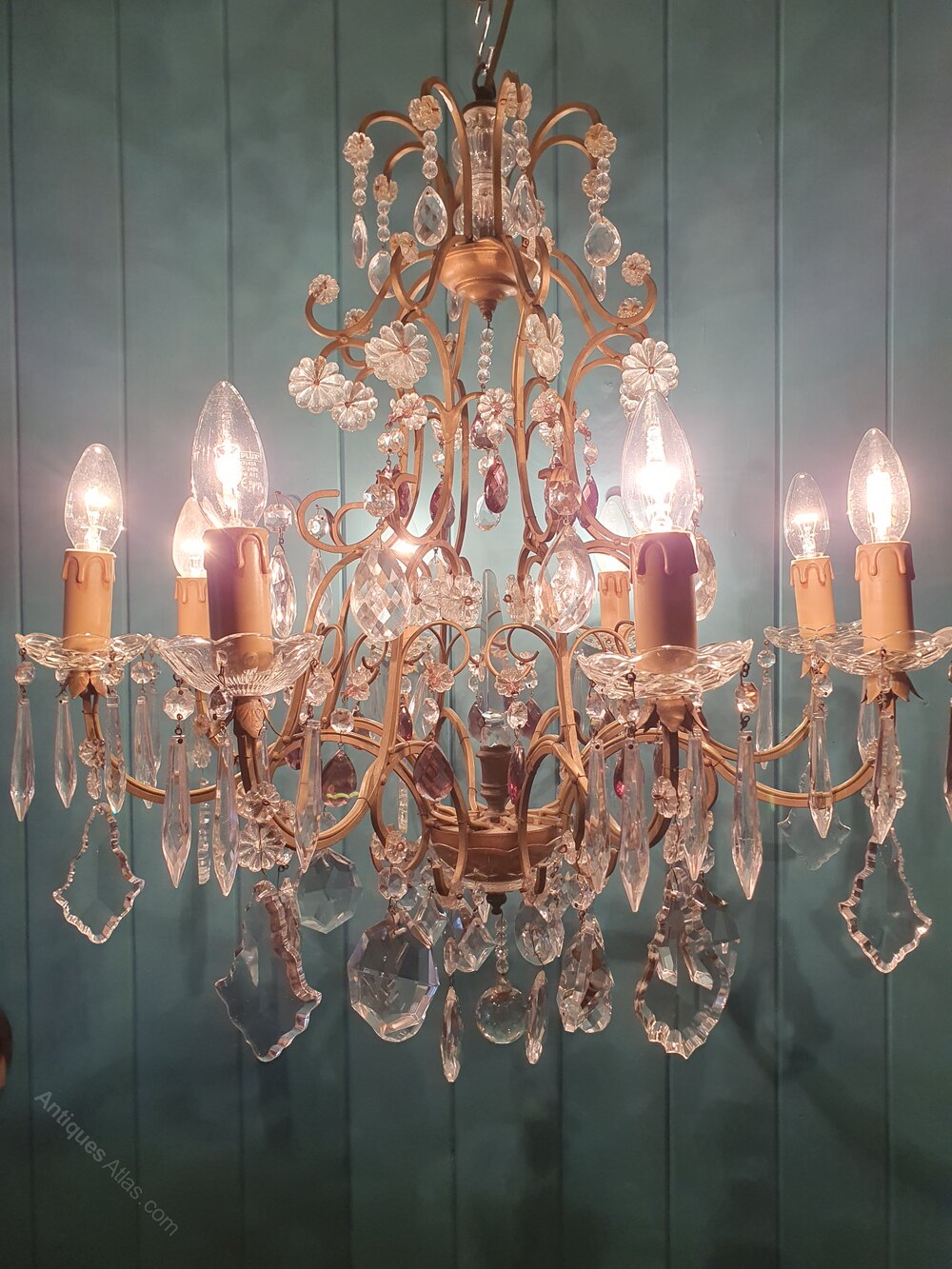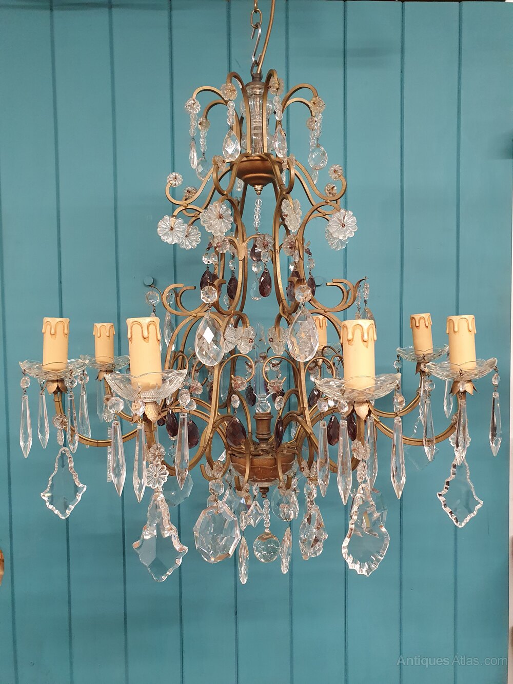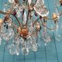 This French eight-arm chandelier is in steel, glass, and cut glass crystal. The piece has a gilt frame with glass tubes to the top and a central triangular decoration. It is decorated with swags, drips, flat drops, spikes, flowers, and coloured drops, finished at the bottom with a glass bowl. This piece has small screw bulb holders E14.Dimensions in centimetres