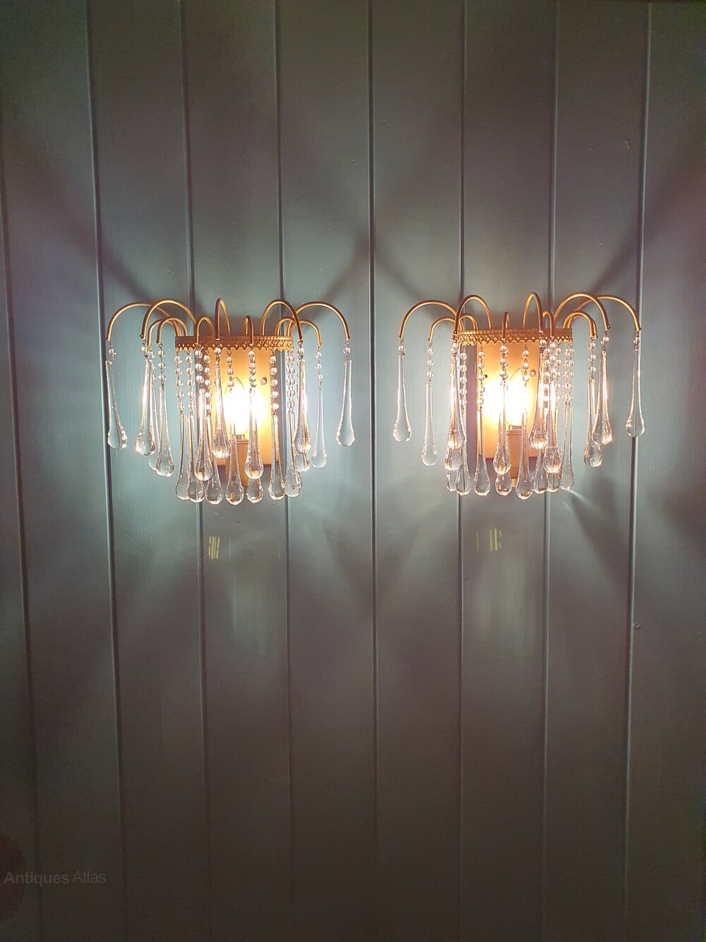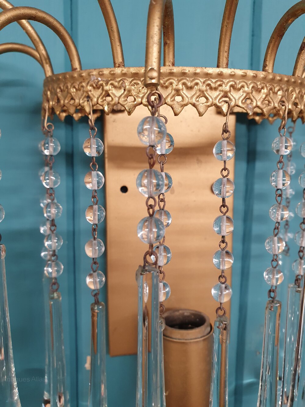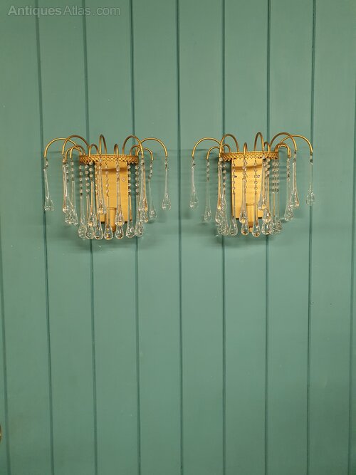 Pair of mid 20th century antique wall lights in brass and glass. This pair have two tiers of teardrop drips suspended from arms mounted on a moulded brass ring to the top. These wall lights come with B15 bulb holders.Dimensions in centimetres