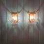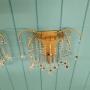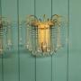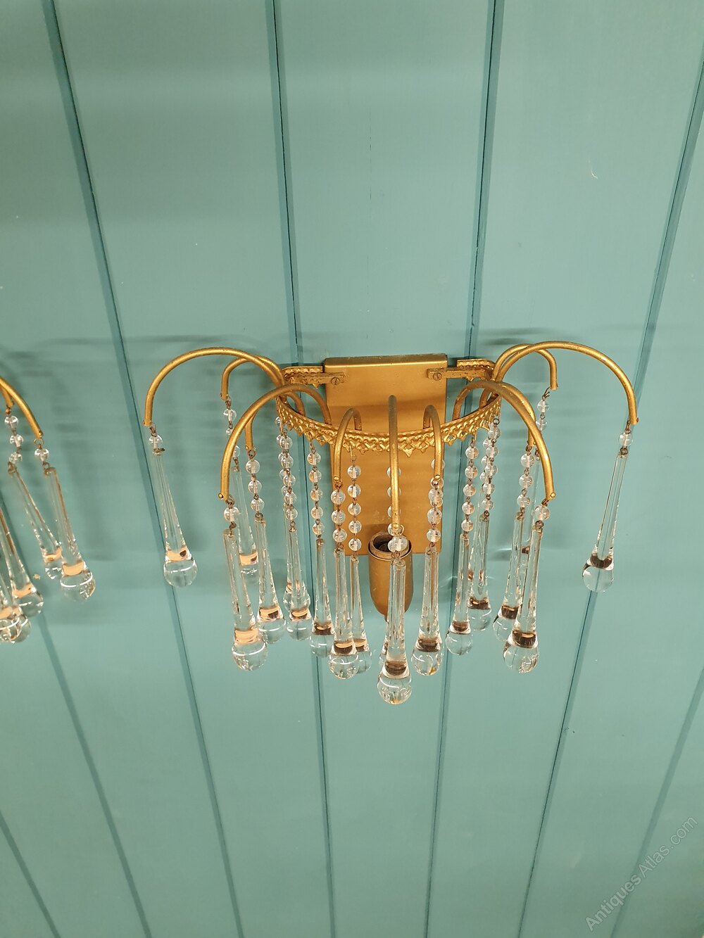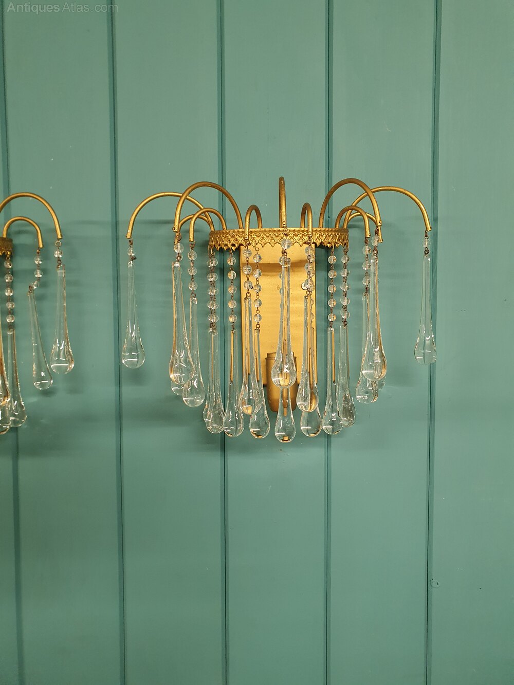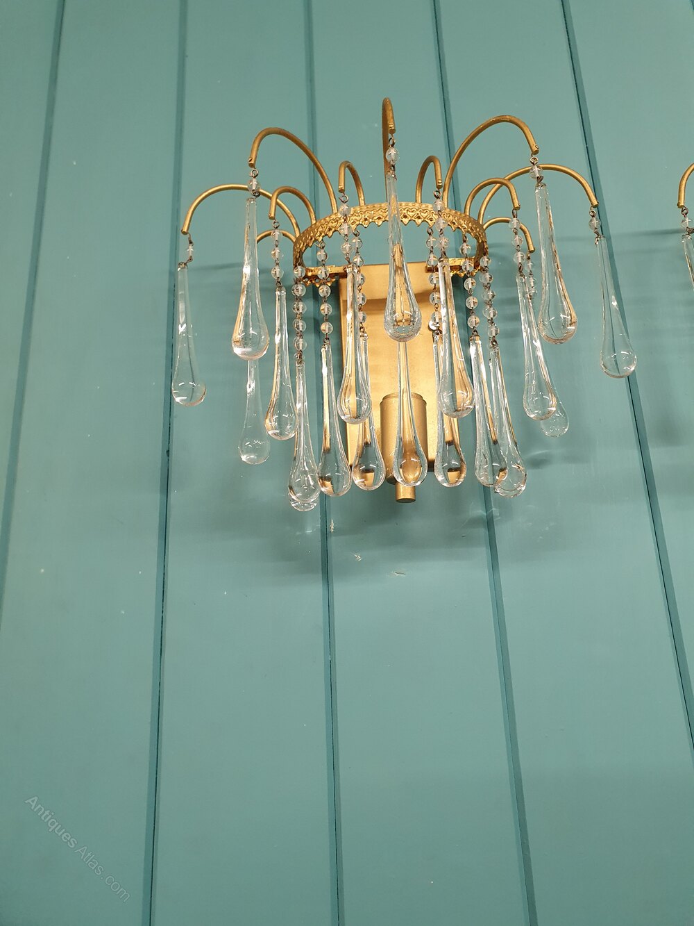 Pair of mid 20th century antique wall lights in brass and glass. This pair have two tiers of teardrop drips suspended from arms mounted on a moulded brass ring to the top. These wall lights come with B15 bulb holders.Dimensions in centimetres