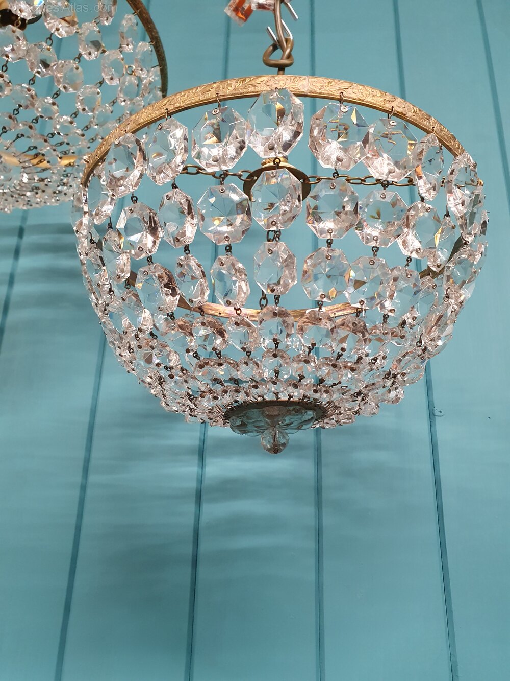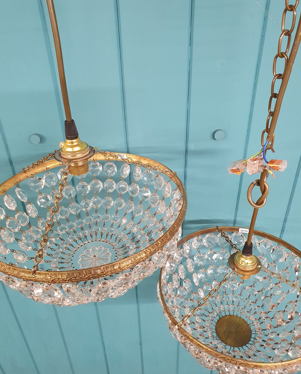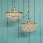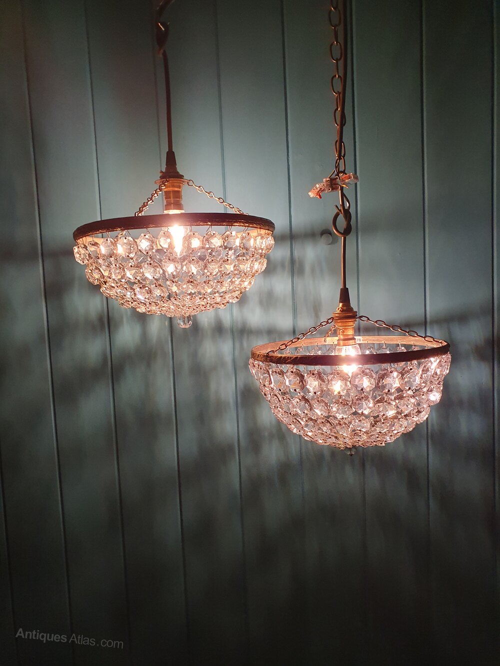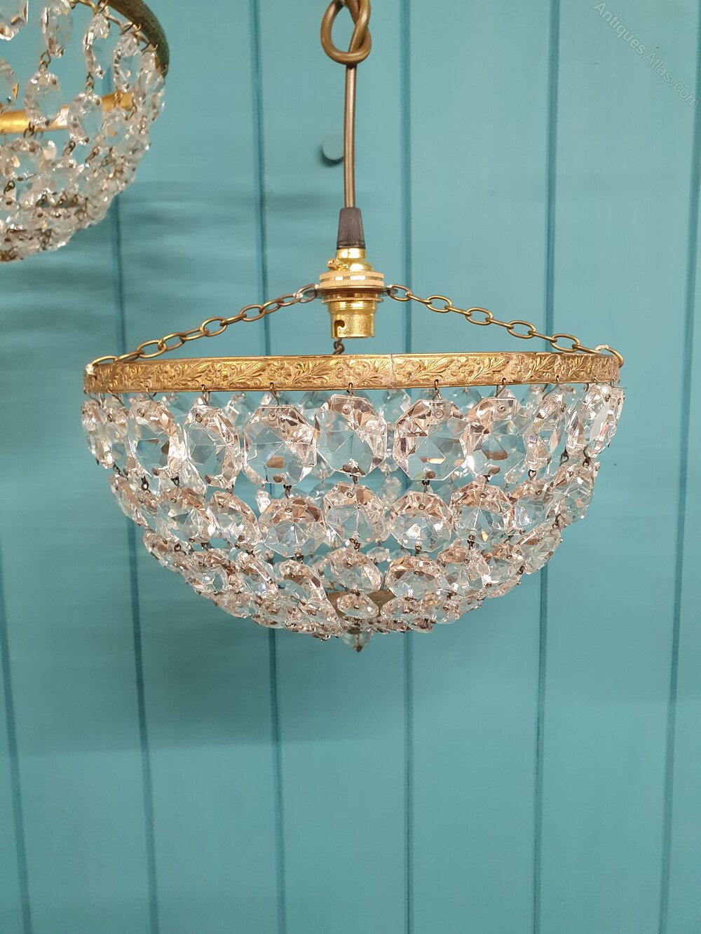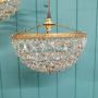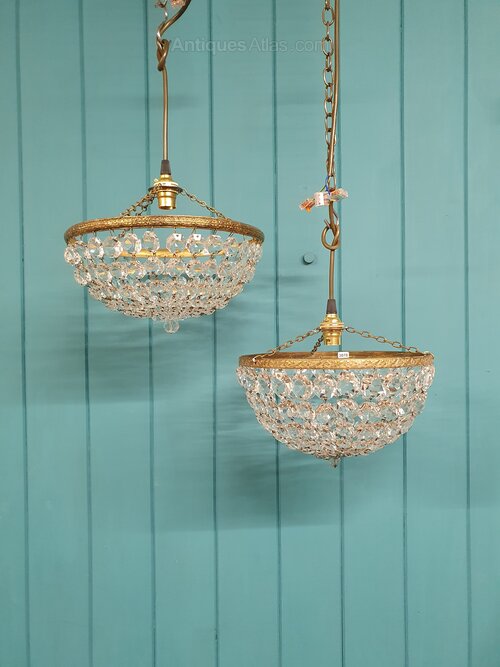 This matched pair of bag basket chandeliers are made from brass and cut glass crystal. The moulded brass ring has a different pattern on each light and the clasp at the bottom is also slightly different. They are the same size. Each chandelier has tapering crystal swags finished with a glass flower and ball. They are fitted with B22 (large bayonet) bulb holders.Dimensions in centimetres