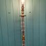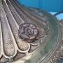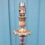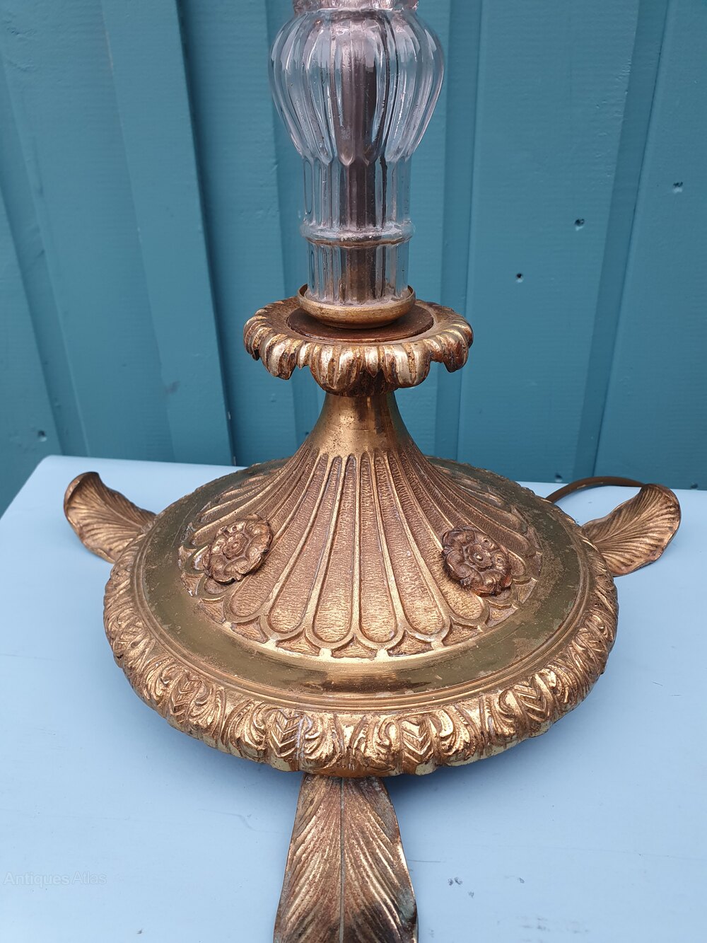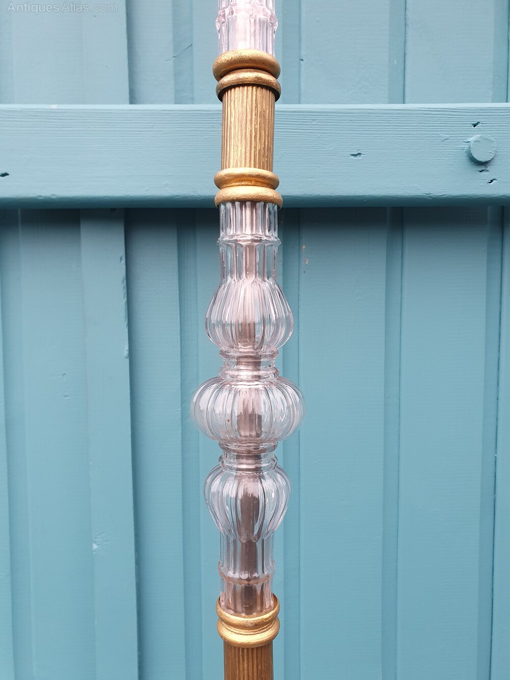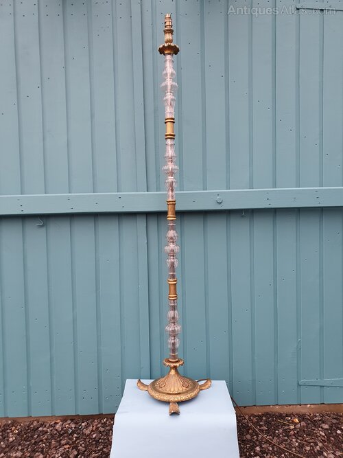 This standard lamp is made from brass and glass. The top section is tulip-shaped with a round leaf detail beneath. The glass column has three reeded sections between the brass fittings. The base is reeded and decorated with flowers, with leaf-form feet. The lamp is fitted with a B22 (large bayonet) bulb holder and comes with 2 metres of cable. The measurement across the base, taken between the centres of the feet, is 31 cm. The round section of the base measures 22 cm across.Dimensions in centimetres