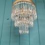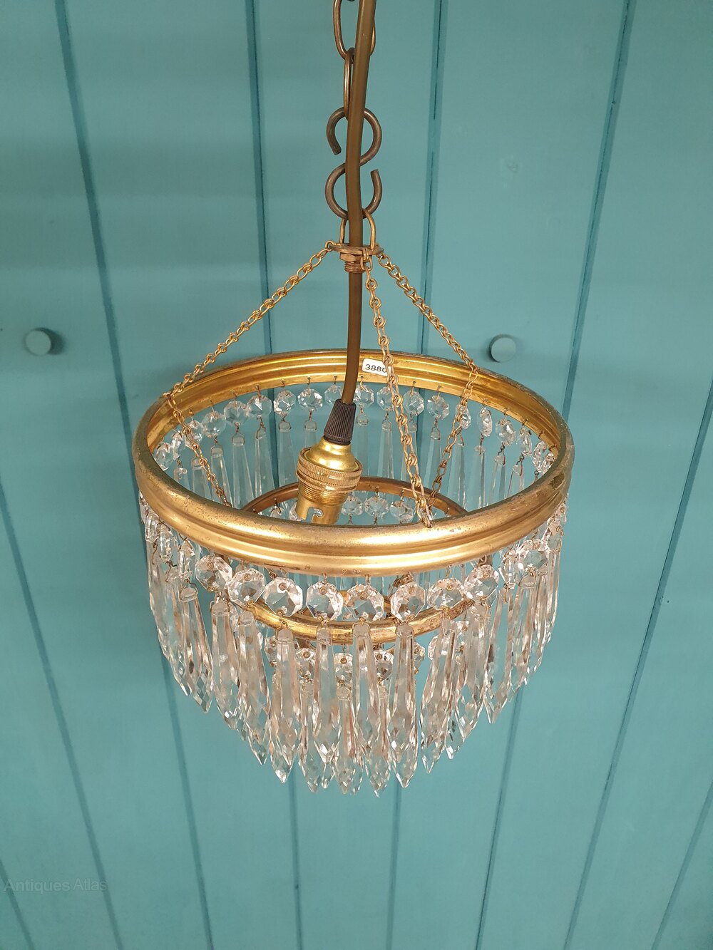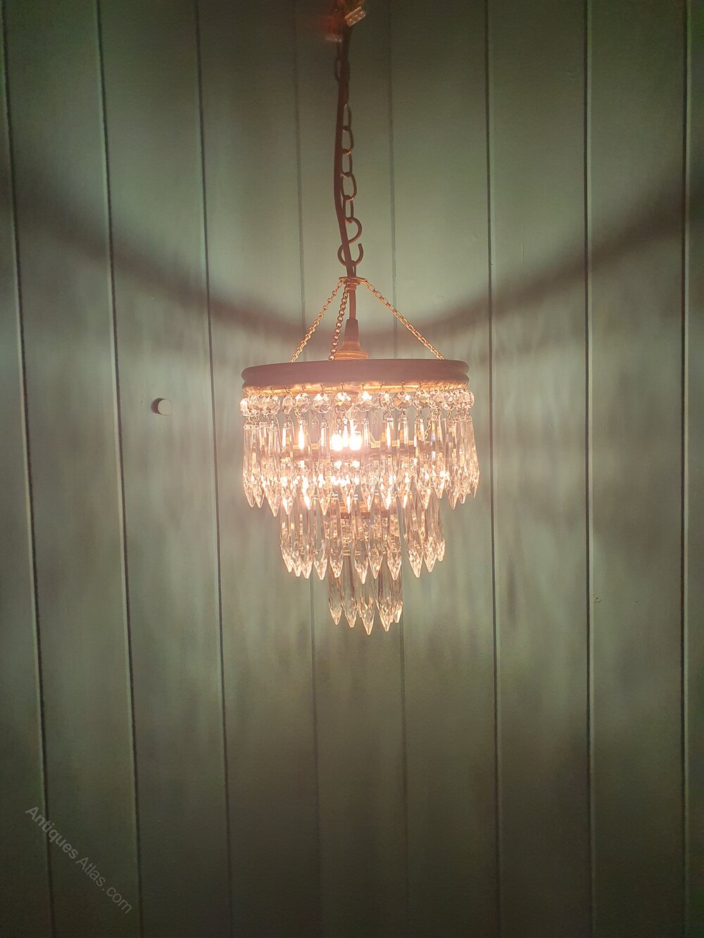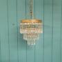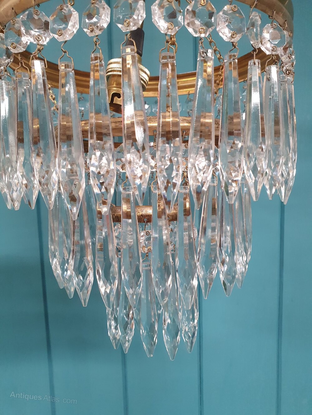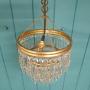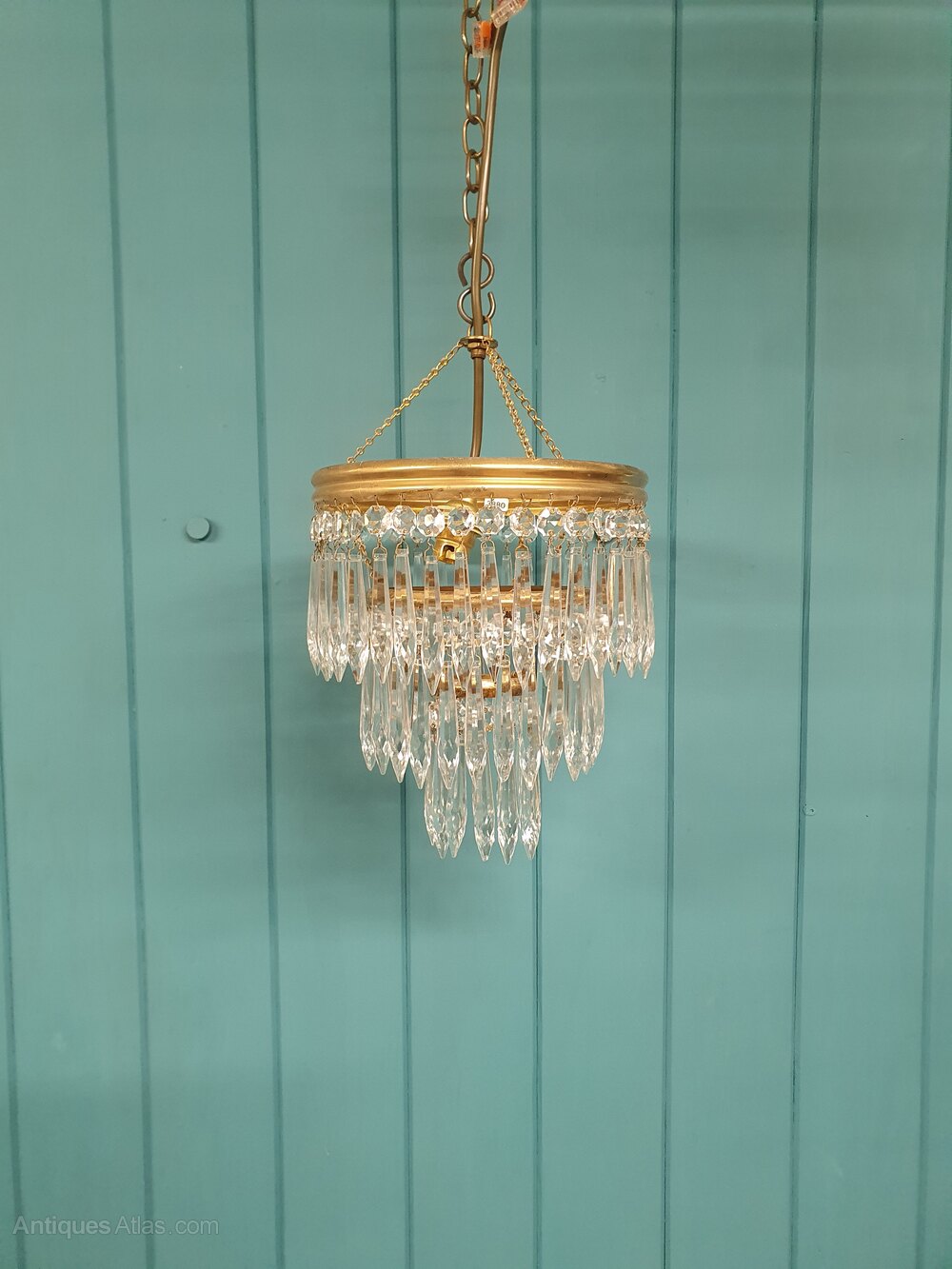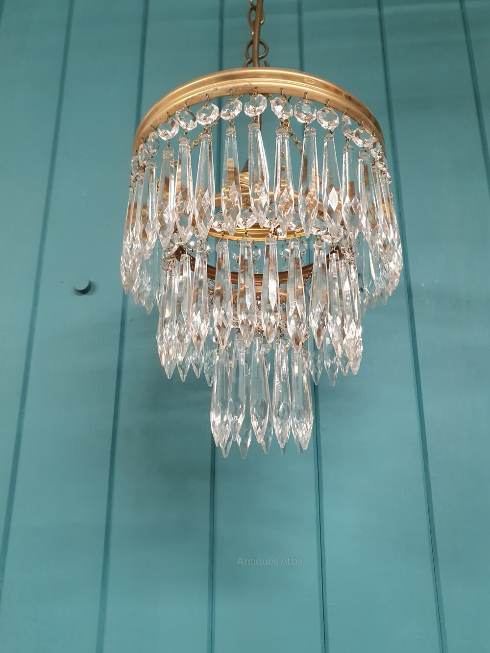 Spike chandelier in brass with icicle cut glass crystals. The chandelier has a brass ring at the top, from which three tiers of spike drops are suspended. The height of the chandelier, excluding the chain, is 25 cm. The fitting has a B22 (large bayonet) bulb holder.Dimensions in centimetres