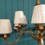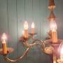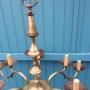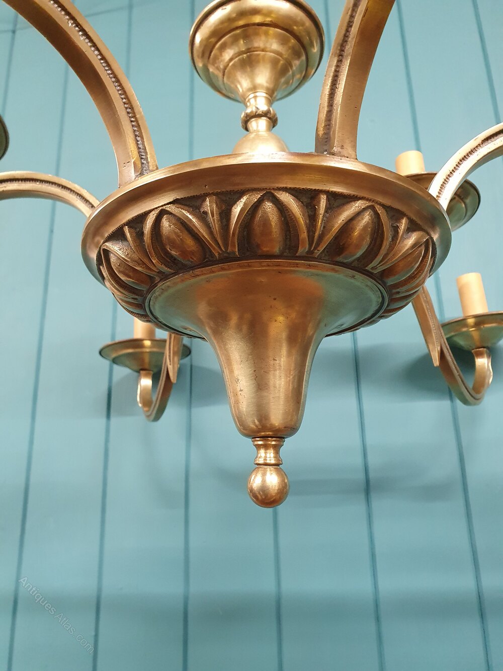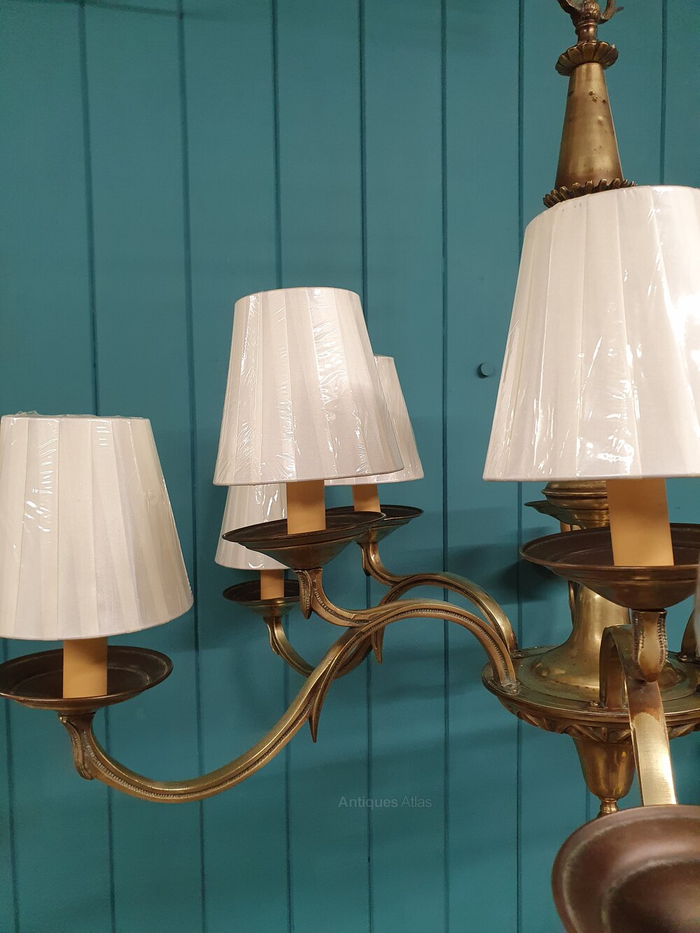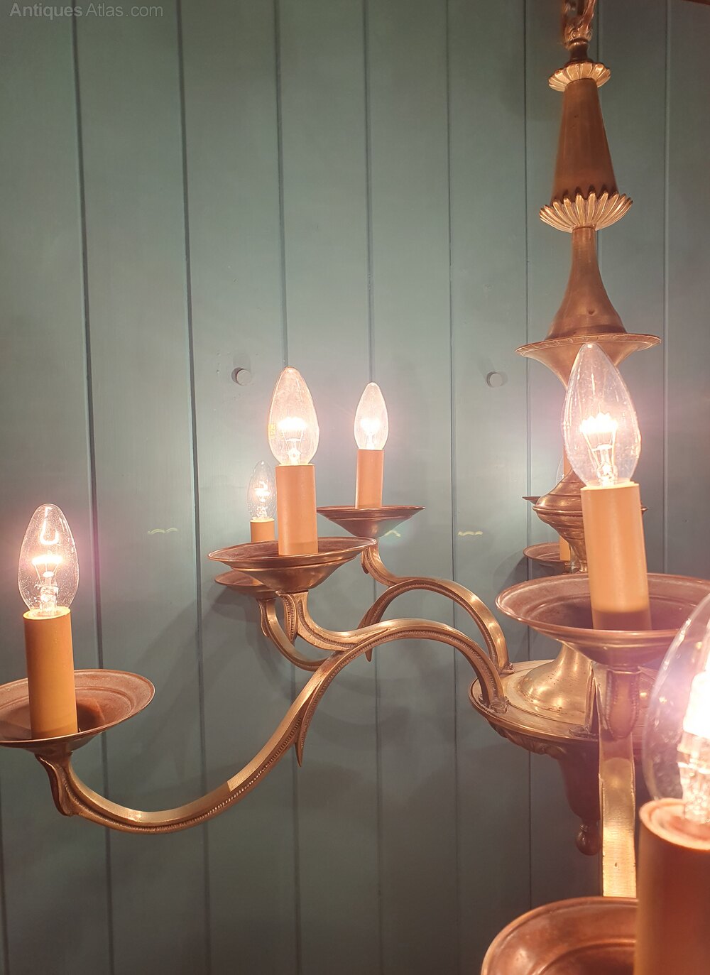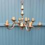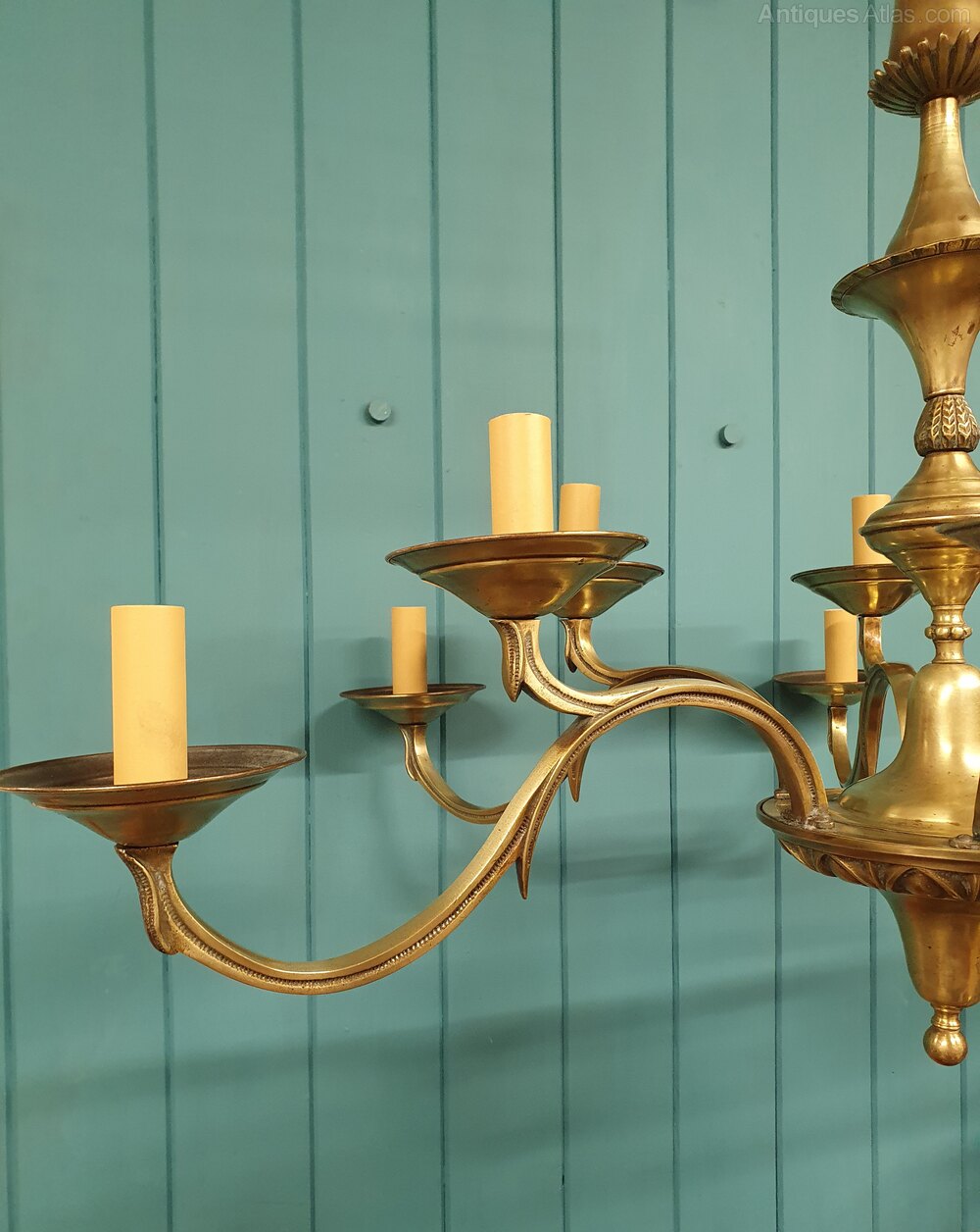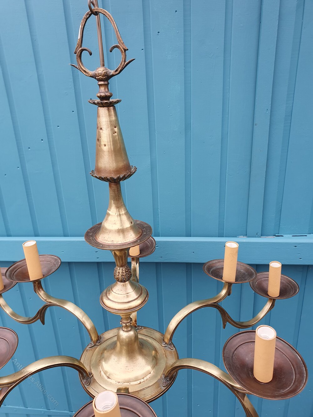 Large antique brass chandelier with a brass column featuring reeded sections to the top, and a classical lower section finished with a brass ball finial. Each of the twelve arms has two candle drip trays with dotted decoration to the sides. The chandelier is fitted with small screw (SES) E14 bulb holders.Dimensions in centimetres