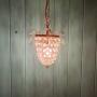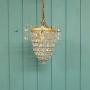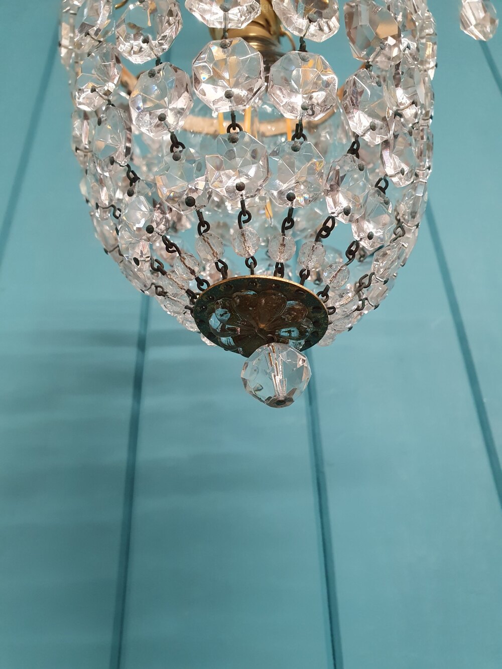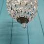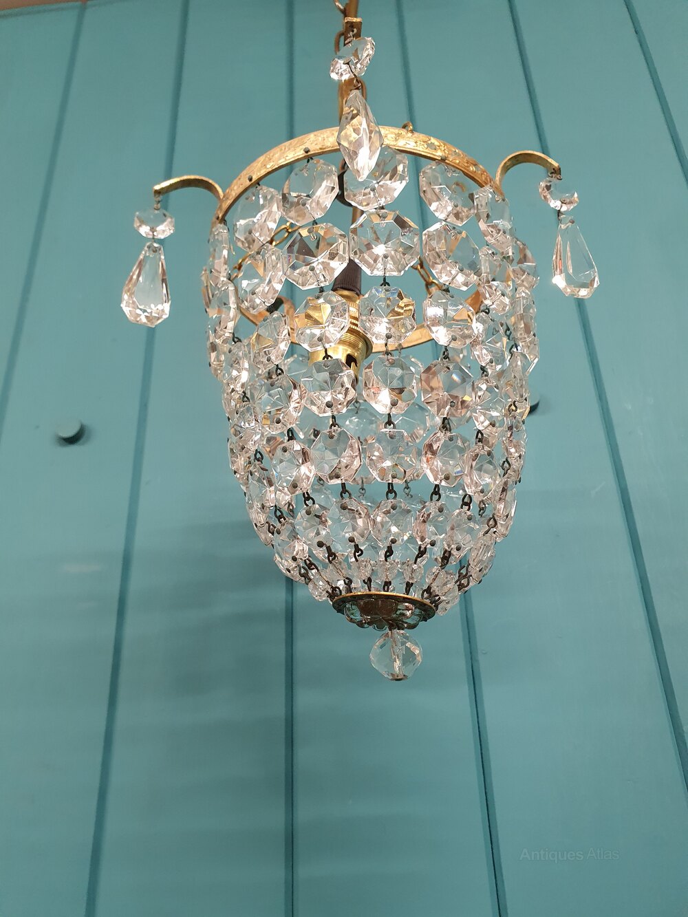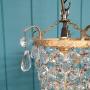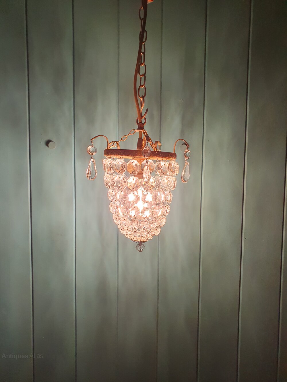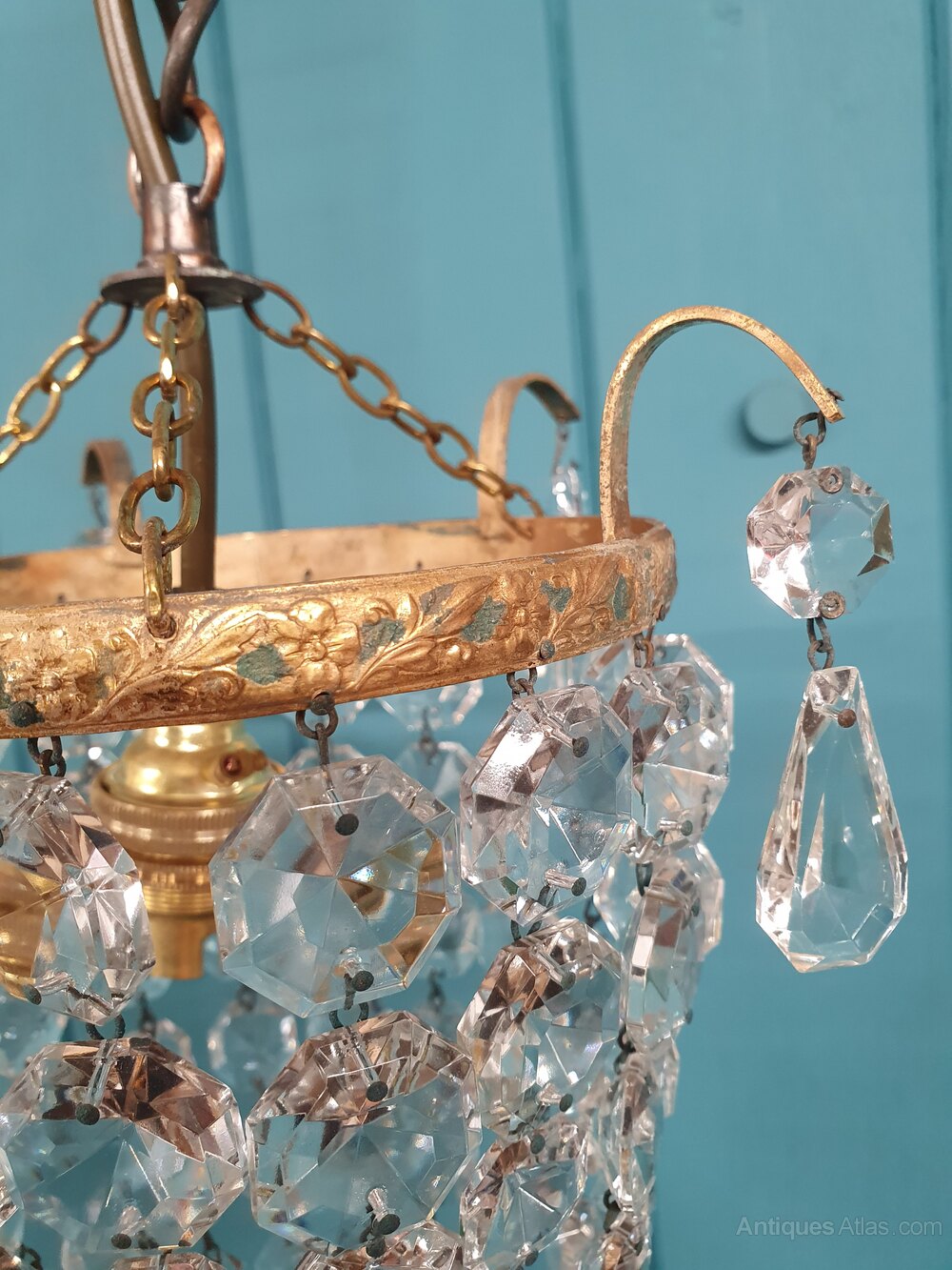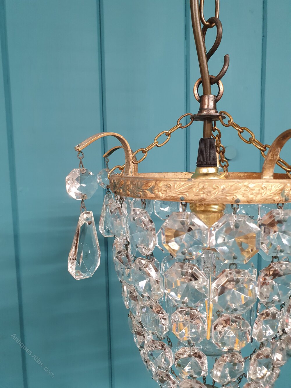 Early 20th century bag chandelier with moulded brass top ring with finials. The finials are decorated with glass drips, the bag section is hung from the moulded brass ring. The base is finished with a glass flower and brass clasp. Height excluding chain: 24 cm. Diameter of brass ring (excluding finials): 14 cm. Fitted with B22 large bayonet bulb holder.Dimensions in centimetres