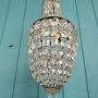 Chandelier in cut glass crystal and metal. The top section has a glass bowl with a steel ring below, from which the cut glass swags with prisms are suspended. The central section is metal, with further swags hung from it, incorporating square cut prisms and glass beads to the ends. The chandelier is finished at the base with a cut glass flower and ball finial. Fitted with a large bayonet (B22) bulb holder.Dimensions in centimetres