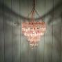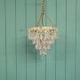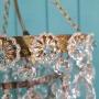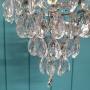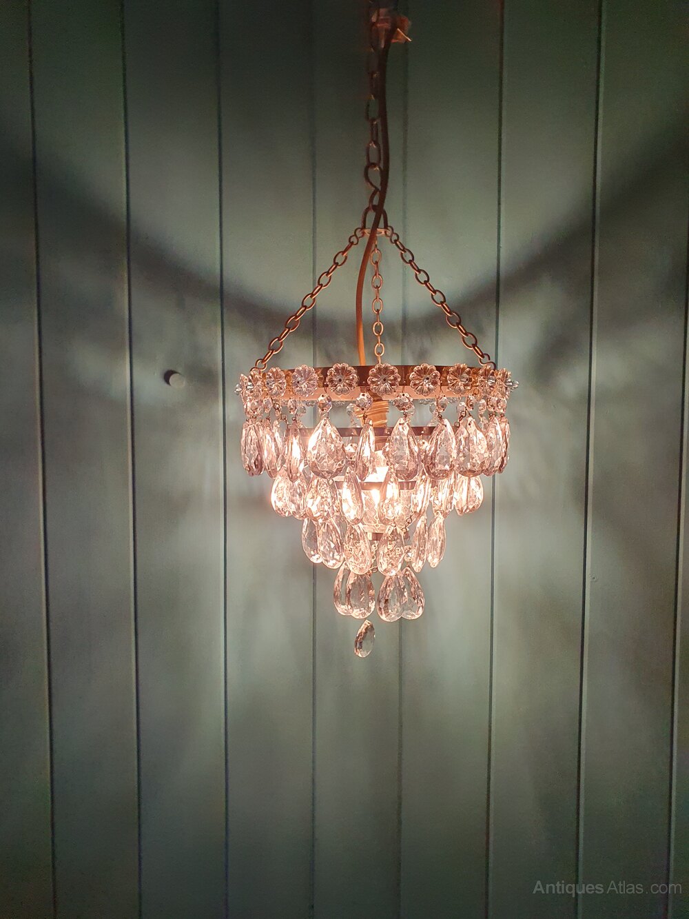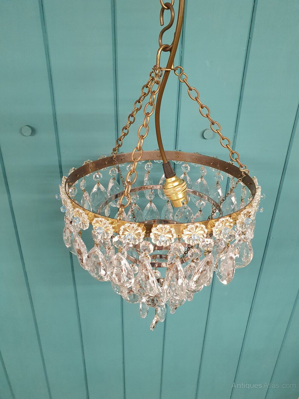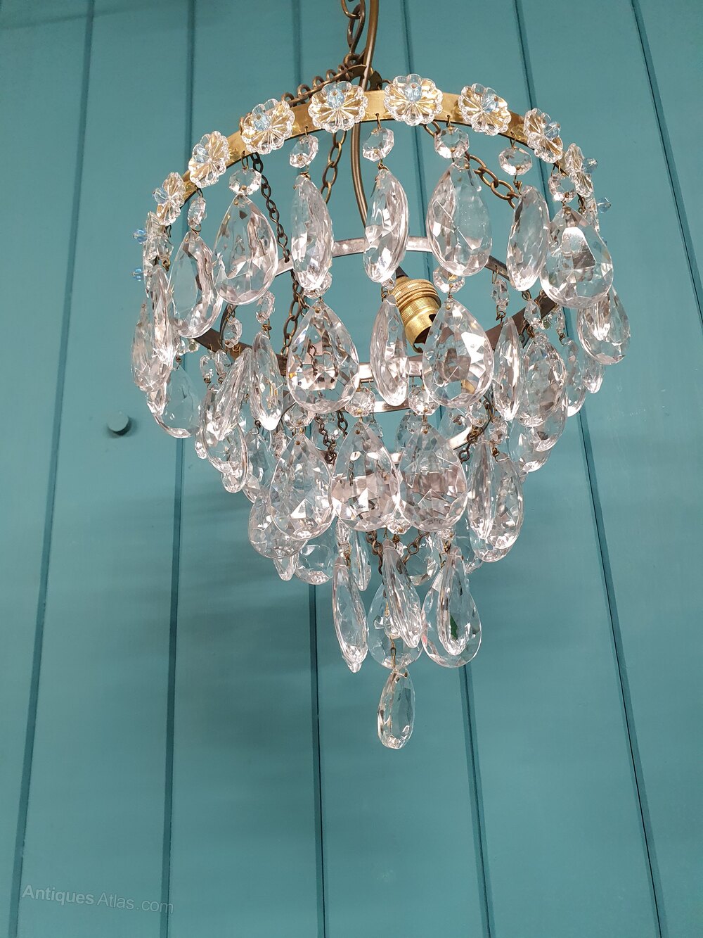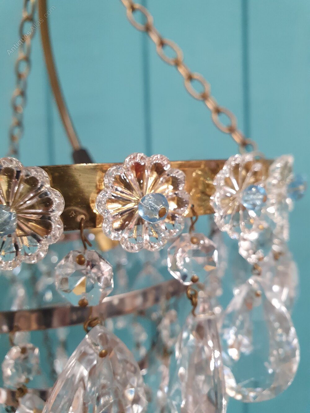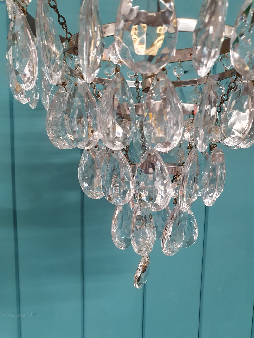 Brass chandelier with glass drips. The construction has a brass ring at the top decorated with flowers, each set with a blue glass bead holding the drips to the centre. Four tiers of glass drips hang from the ring and are finished at the bottom with a small drop. The height of the chandelier, excluding the chain, is 27 cm. Fitted with a B22 (large bayonet) bulb holder.Dimensions in centimetres