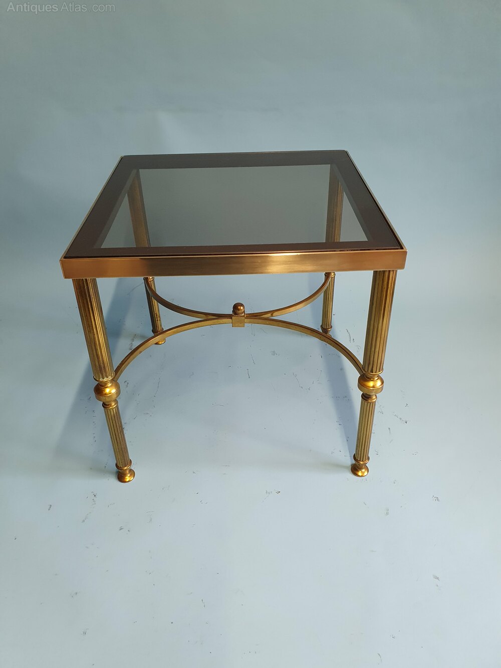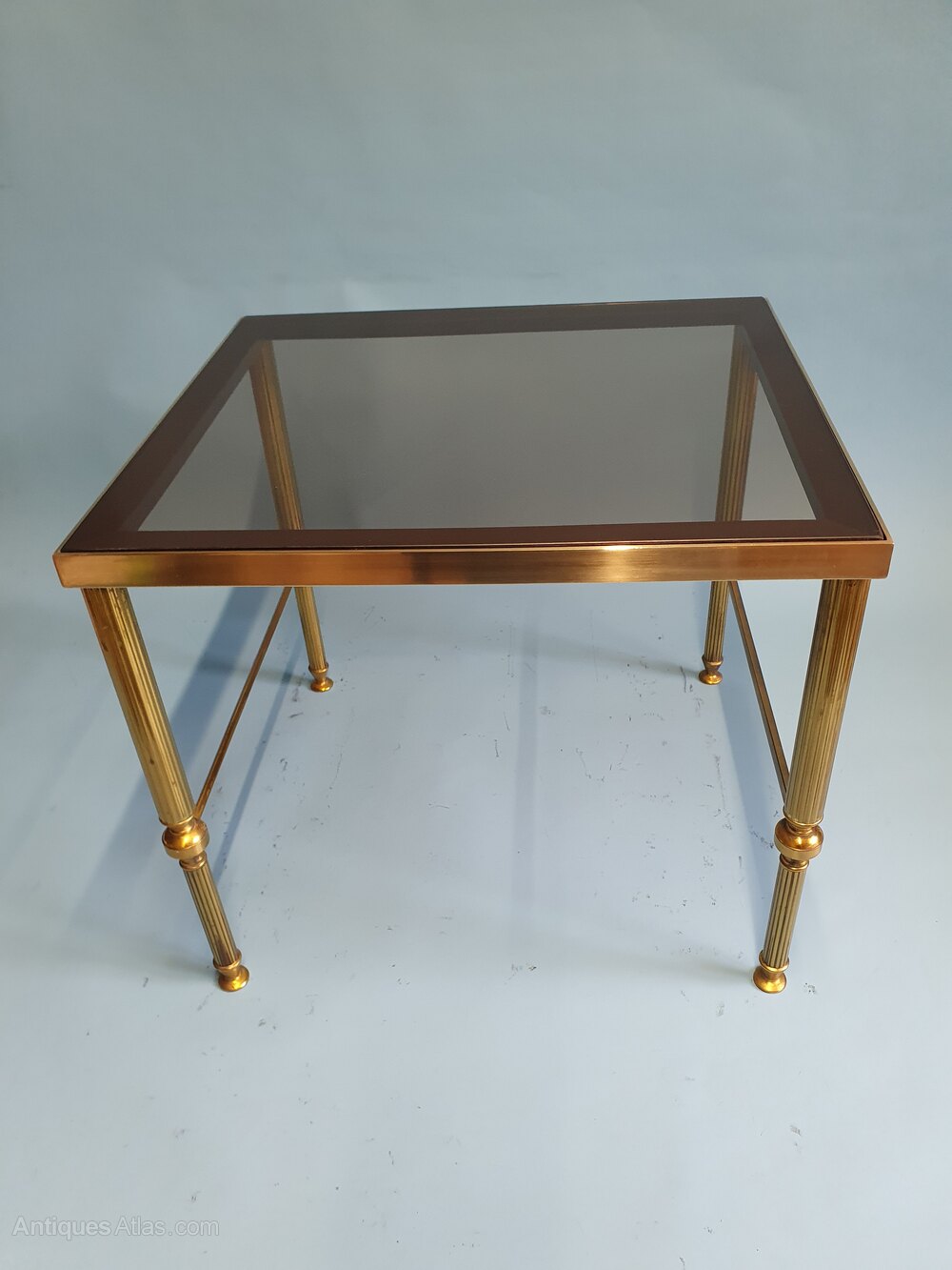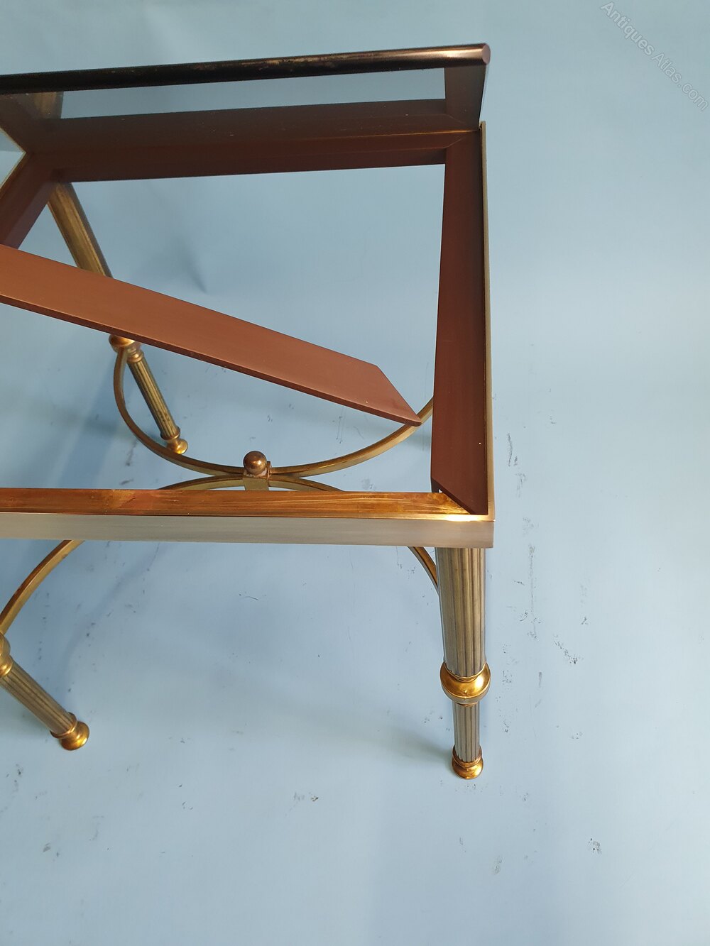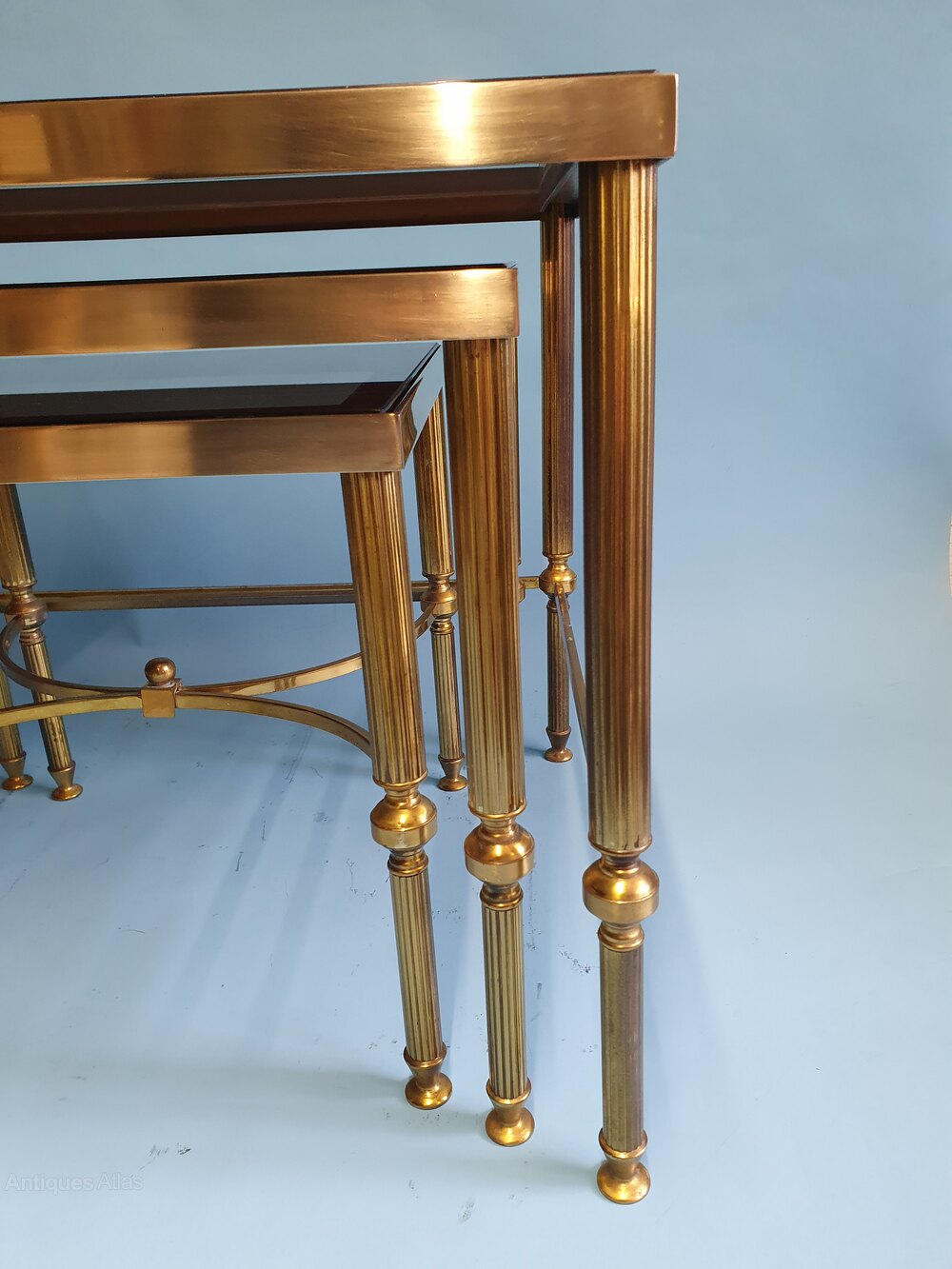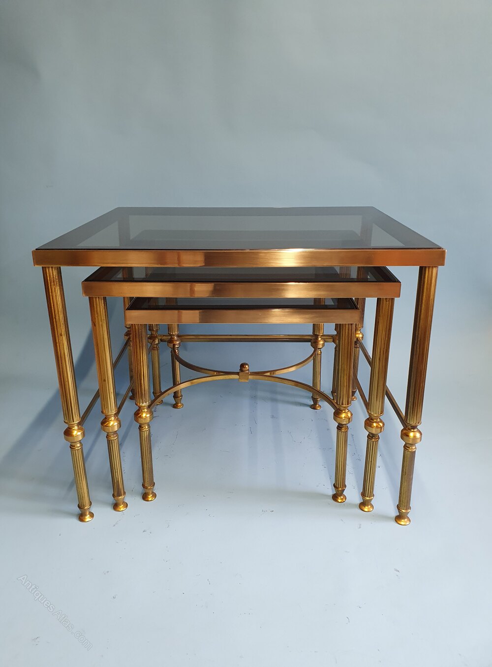 "Brass nest of three tables with original tinted glass tops in good condition, with minor light scratches the glass sits in rubber inserts within the frames. The tables have reeded brass legs with rails, the smaller table with bowed rails and a finial.Largest table: 46 cm high, 56 cm wide, 46 cm deep.