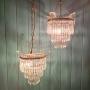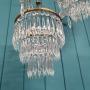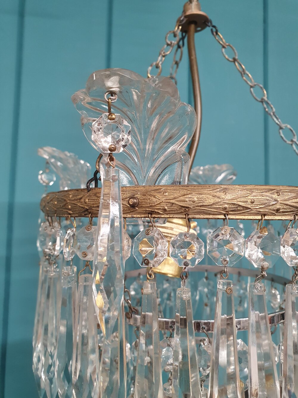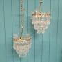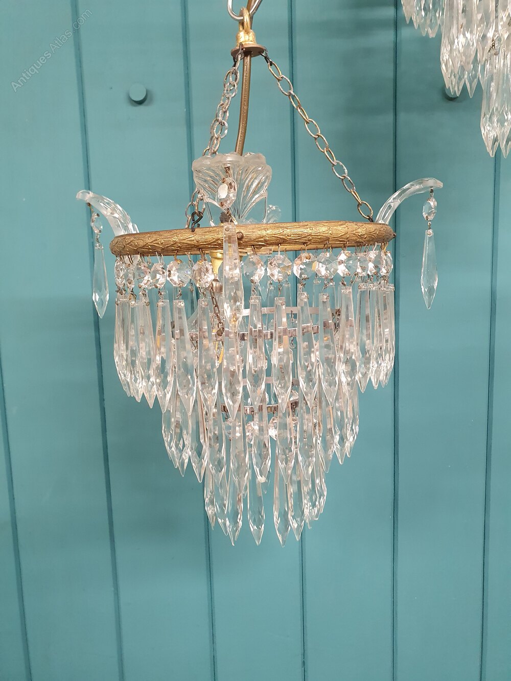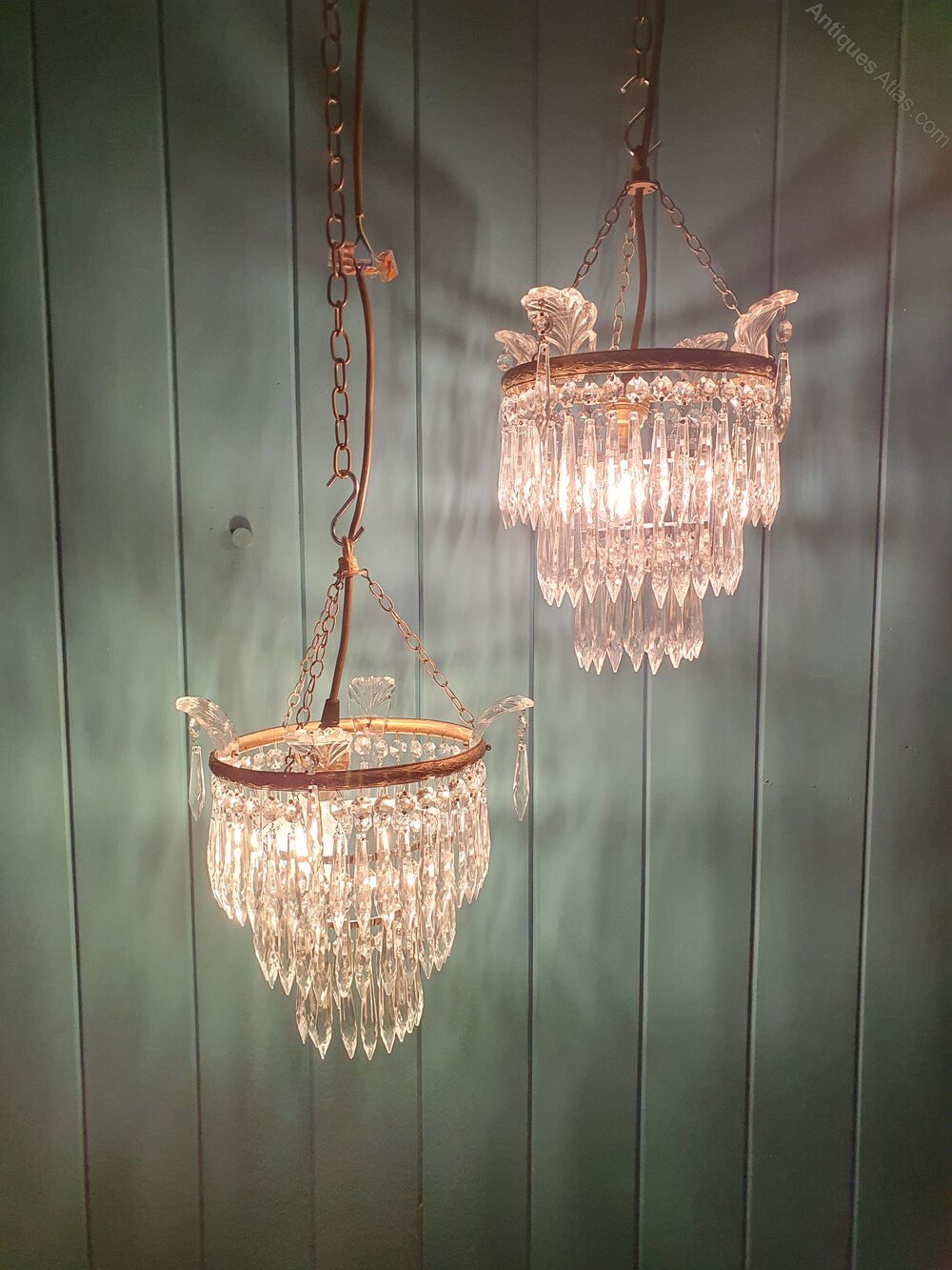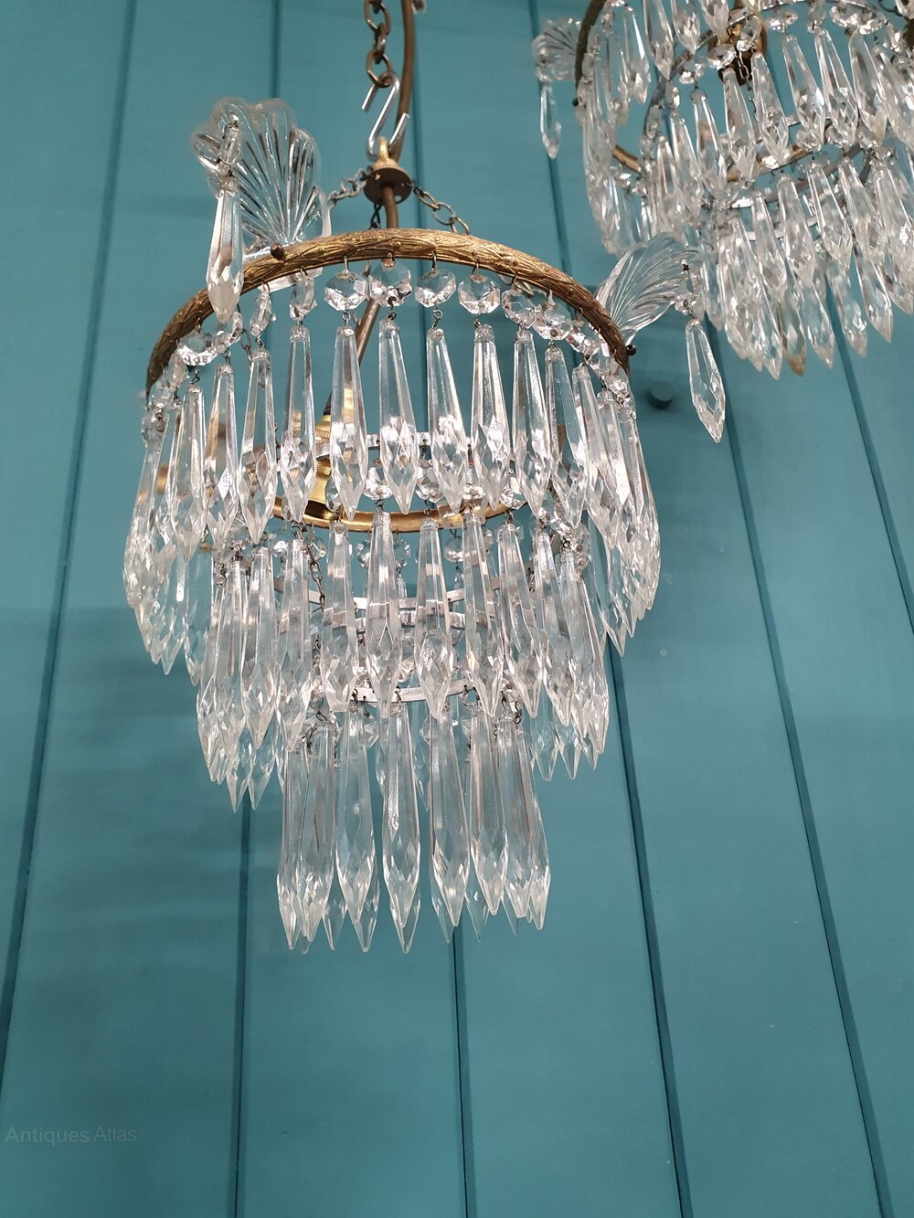 Pair of brass and glass crystal spike chandeliers with moulded brass top rings decorated with glass leaves, supporting three tiers of cut glass crystal spikes height excluding chain 24 cm width of brass ring excluding finials 21 cm fitted with large bayonet bulb holders (B22).Dimensions in centimetres