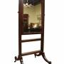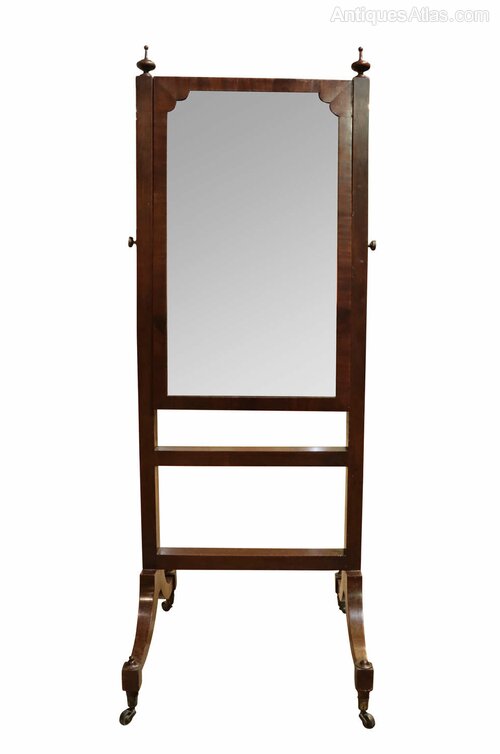 A fine William IV mahogany framed cheval mirror, the rectangular plate set within a simple moulded frame with shaped upper corners and topped by turned finials. The mirror is supported between twin uprights with adjustable brass side knobs, allowing the plate to tilt.Raised on elegant sabre legs terminating in brass sabots and original brass castors, the whole piece is well-proportioned and displays a rich, warm mahogany colour typical of the period.