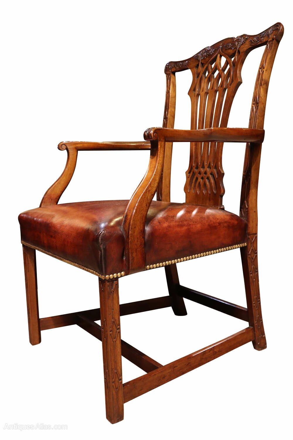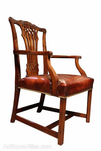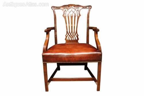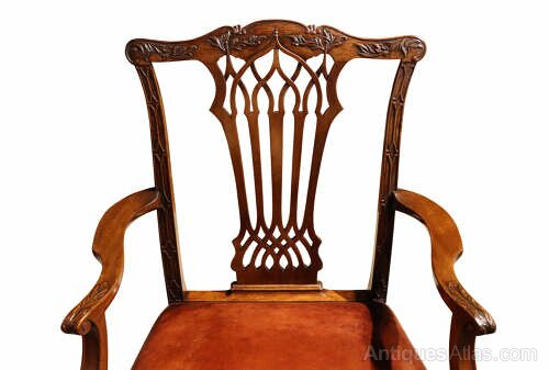 A fine quality Victorian mahogany framed armchair, English, circa 1890, in the Chippendale style.The chair features a well-shaped back with a finely pierced and carved splat, beneath a gently serpentine top rail enriched with foliate carving. The shaped arms terminate in scroll handrests and are supported on square section legs, all subtly carved with restrained decorative detailing. The legs are united by stretchers, giving the chair excellent strength and stability.