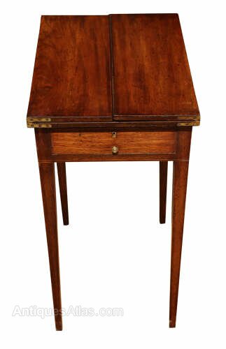 A fine and elegant Georgian mahogany twin-flap bridge table, English, circa 1820.The rectangular top is fitted with two hinged flaps, allowing the table to be used both closed as a narrow console table or fully opened for card playing or occasional use. The table is fitted with a single drawer to one side.