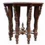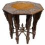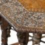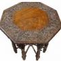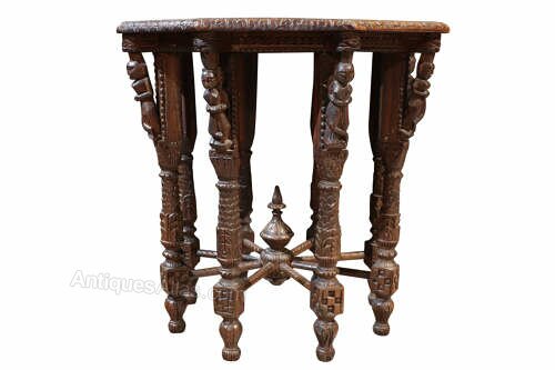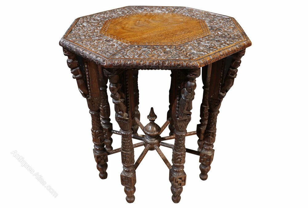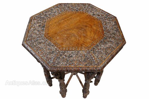 A striking 19th-century Anglo-Indian carved hardwood table, richly decorated with dense and intricate carving throughout.The octagonal top is finely worked with scrolling foliate motifs surrounding a central plain panel, framed by a deeply carved border with excellent depth and definition. Beneath, the table is supported on multiple turned and carved legs, each enriched with figural and geometric detailing, united by radiating stretchers centred on a turned finial, creating both structural strength and visual drama.