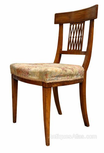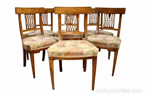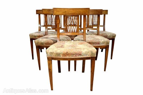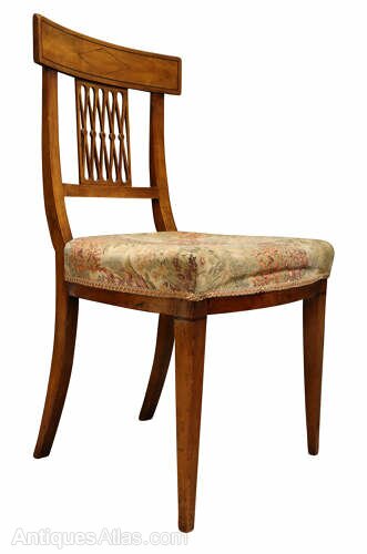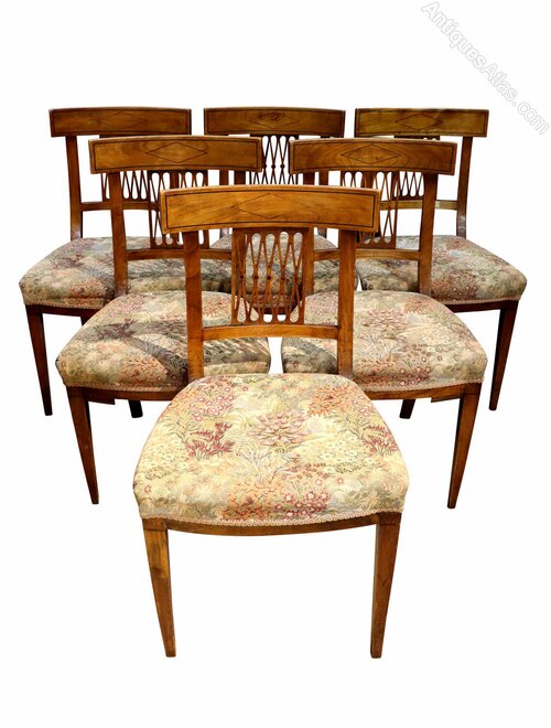 A very attractive and elegant set of six French cherrywood dining chairs, dating to circa 1880.Crafted in beautifully figured cherrywood, these late 19th century chairs display the warm, honeyed tones and fine grain that make French cherry so highly prized. Each chair features a shaped top rail with subtle inlaid diamond motif detail, above a distinctive fretted and pierced bar back incorporating delicate turned elements — a charming decorative feature typical of provincial French design of the period.