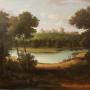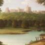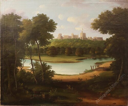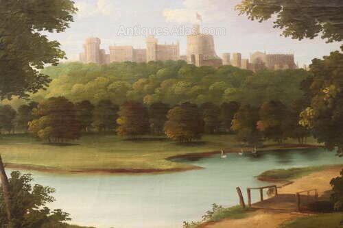 A charming mid-19th century oil on canvas depicting Windsor Castle viewed from the Eton side of the River Thames.The composition is attractively arranged with the castle rising beyond a wooded hillside, the Round Tower prominently flying the Royal Standard. In the foreground, a gently curving stretch of river reflects the soft sky, bordered by parkland, mature trees and a small rustic footbridge. Swans glide across the water, enhancing the tranquil pastoral character of the scene.