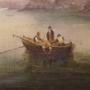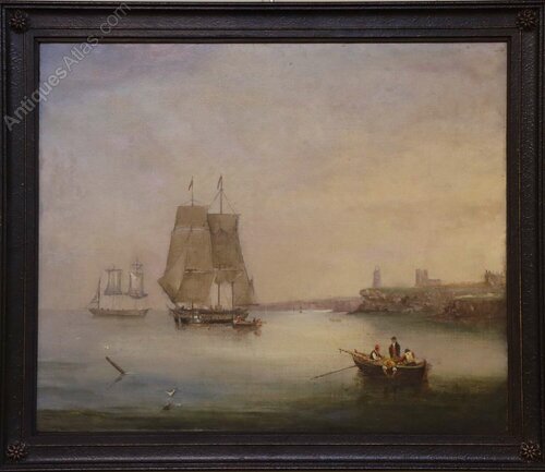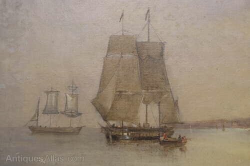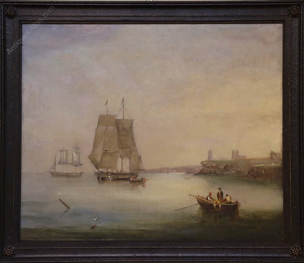 A beautifully atmospheric early 19th century oil on canvas depicting a tranquil harbour scene bathed in soft evening light.The composition centres on a two-masted vessel at anchor, its sails partially furled, with a smaller sailing ship beyond. In the foreground, a rowing boat carrying three figures drifts across calm reflective waters, while seabirds skim the surface. To the right, a rugged coastline with a lighthouse and ruined structure rises gently from the shoreline, adding both narrative interest and depth.