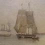 The painting displays delicate tonal handling and a restrained maritime palette typical of late Georgian coastal painting. The glassy water, subtle sky gradation, and careful rendering of rigging and sailwork demonstrate a confident hand.