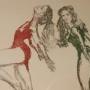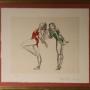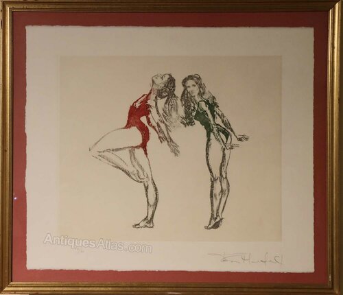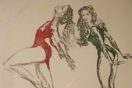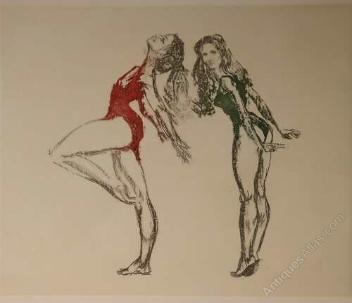 A striking limited edition print titled Ballet Dancers by John Merrifield, a powerful and expressive work by one of Britain’s most distinctive figurative artists. This example is hand signed and numbered by the artist, 44/50, from a strictly limited edition.The composition depicts two ballet dancers captured in fluid, dynamic poses, rendered with Merrifield’s characteristic economy of line and confident draughtsmanship. The figures are sensitively drawn, conveying both movement and poise, while selective use of colour — notably the contrasting red and green — adds drama and visual tension to the otherwise restrained palette. The expressive marks and slightly abstracted forms give the work an immediacy and emotional depth, typical of Merrifield’s mature figurative style.