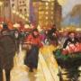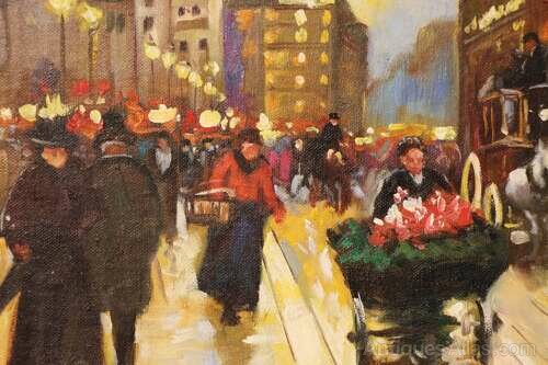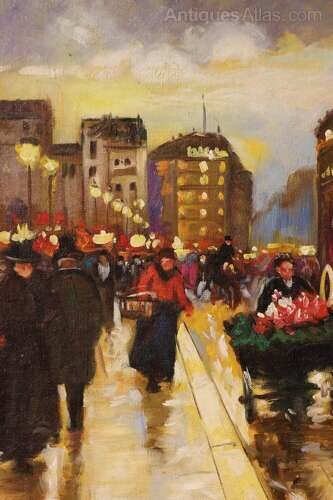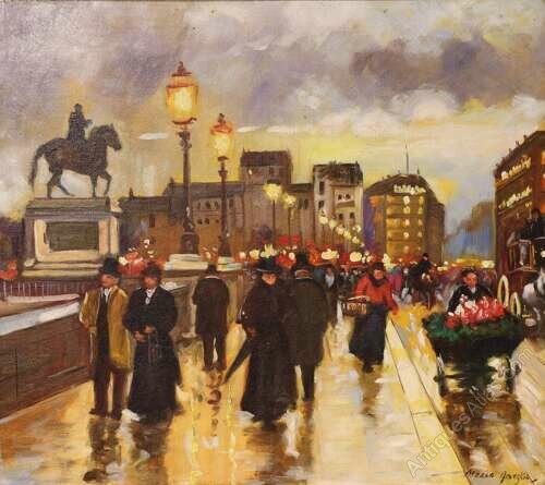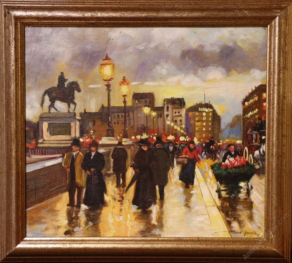 An atmospheric oil on canvas laid on board depicting a lively Parisian street scene near the Pont Neuf, with the Equestrian Statue of Henry IV visible within the composition. The work is by Merio Ameglio, well known for his romanticised views of Paris painted during the mid 20th century.The scene captures the charm of the city at dusk, street lamps casting a warm golden glow across rain-swept pavements. Elegantly dressed figures stroll along the boulevard, while a flower seller and passing carriage animate the foreground. Reflections shimmer across the ground, and the distant monument provides architectural structure and a strong sense of place.