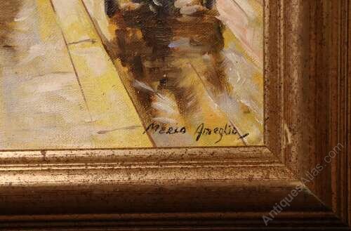 Signed lower right, the painting dates to the mid 20th century, circa 1940s–1950s, a period for which Ameglio’s Parisian scenes are particularly sought after. The canvas is presented in a complementary gilt frame that enhances the warmth and tonal richness of the composition.
