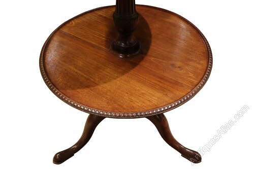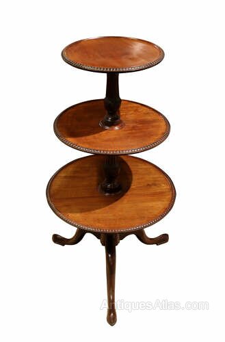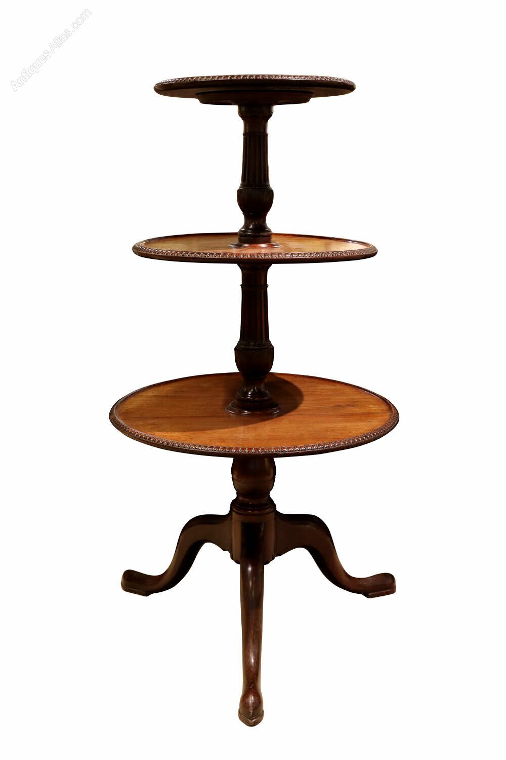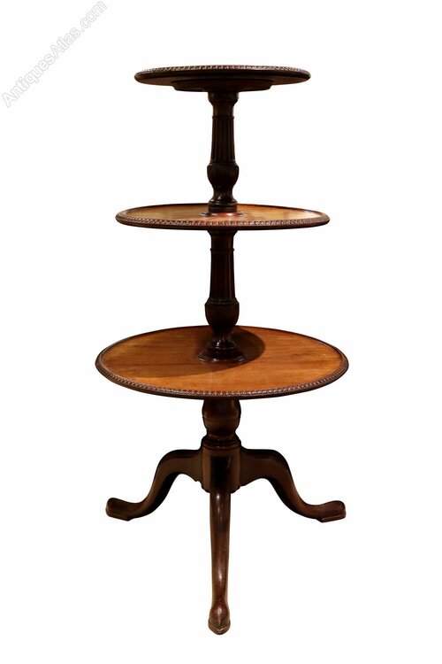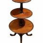 This refined early 19th-century dumb waiter is crafted in mahogany and features three graduated circular tiers, each edged with finely carved reeded moulding. The tiers are supported on a well-turned central column, allowing the upper sections to revolve smoothly, making the piece both practical and decorative.The stand is raised on three graceful cabriole legs, giving it a light and elegant stance typical of the Regency period. The mahogany displays a warm, mellow colour and attractive grain, with a well-preserved surface showing minor marks and wear consistent with age and use.