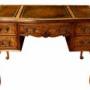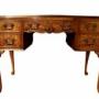 The shaped apron beneath the central drawer features a carved shell motif, adding a touch of classical elegance. The desk stands on gracefully carved cabriole legs with scroll decoration to the knees, terminating in pad feet which further emphasise its refined silhouette.