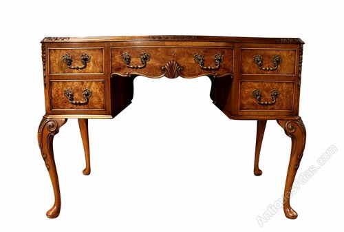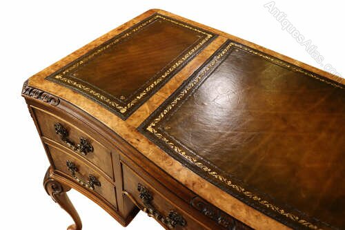 A very attractive antique burr walnut ladies writing desk of elegant proportions, dating to the early 20th century. This beautifully crafted desk is veneered throughout in richly figured burr walnut, displaying striking natural grain and warm colour that enhances its decorative appeal.The rectangular top is fitted with three inset panels of tooled brown leather, each decorated with delicate gilt tooling around the borders, providing a practical and refined writing surface. Beneath the top sits an arrangement of five drawers, including a long central drawer flanked by two pairs of smaller drawers. All drawers retain their decorative brass drop handles and open smoothly, revealing mahogany lined interiors with traditional dovetail construction.