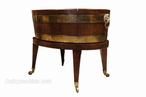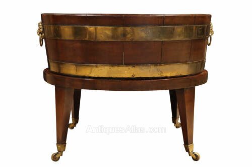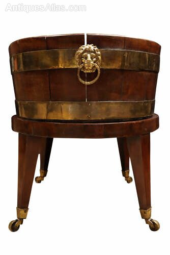A good early 19th century mahogany coopered wine cooler or planter, dating to circa 1820, of traditional form and raised on an elegant original stand.The body is constructed in the manner of a coopered bucket, formed from vertical mahogany staves and bound with brass bands, which have developed a rich, mellow patina over time. The sides are fitted with attractive cast lion’s head ring handles, adding both decorative appeal and practicality.