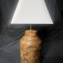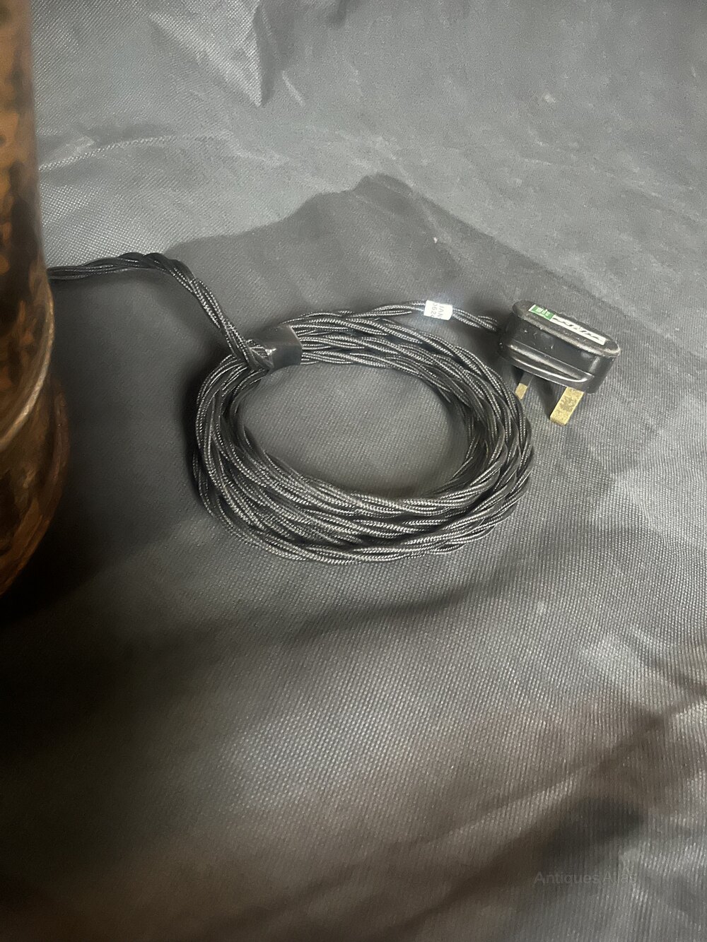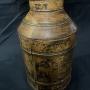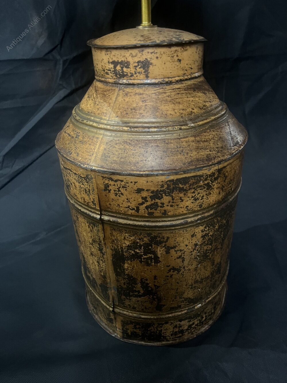 Antique tin tea canister, 36 cm tall. Converted to a table lamp with brass fittings and black flex. Fully PAT tested. With lampshade.Total height with shade, 65 cm.