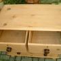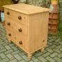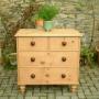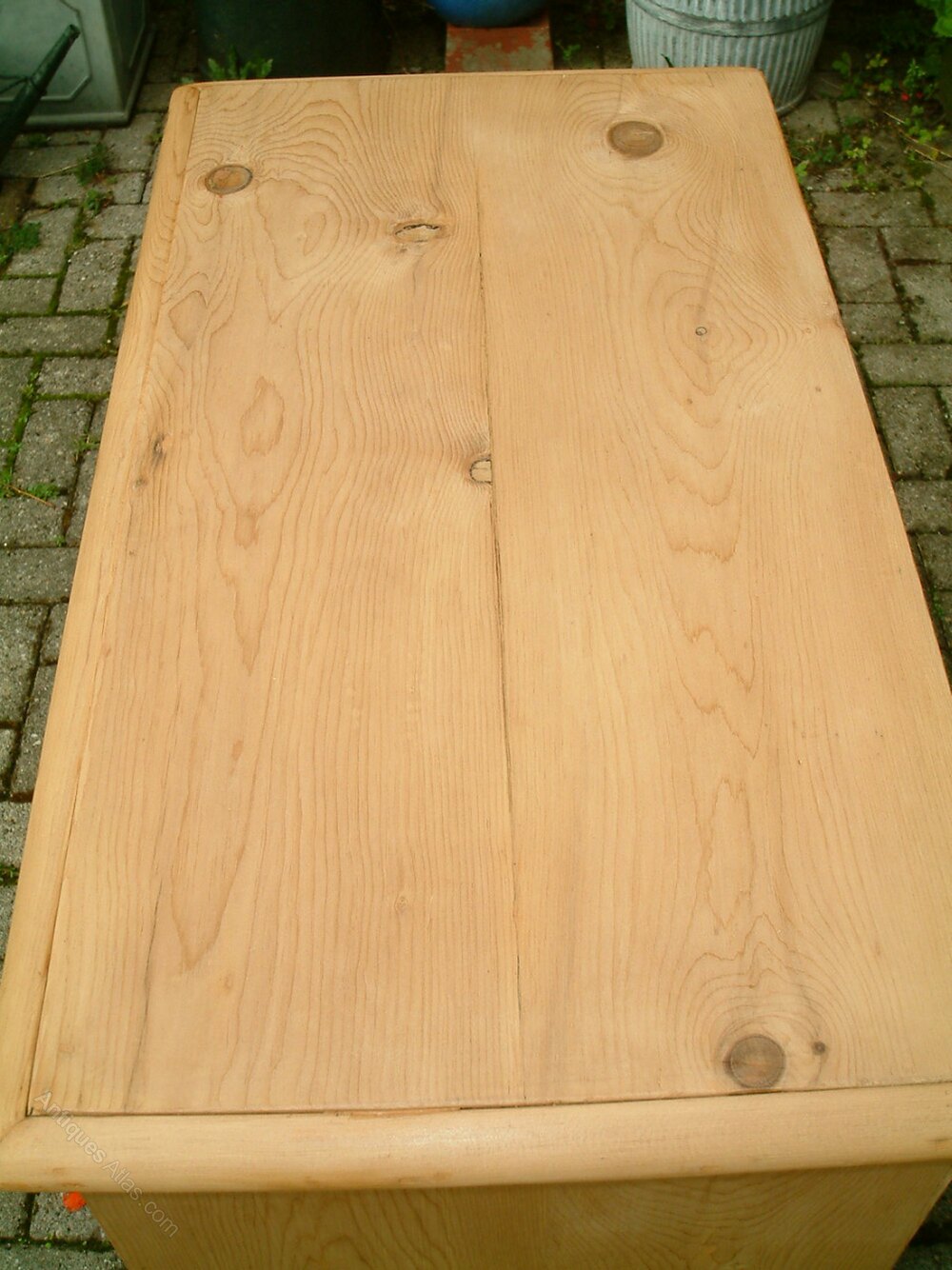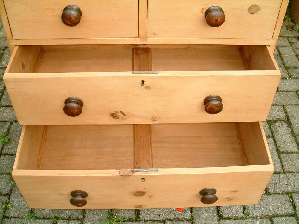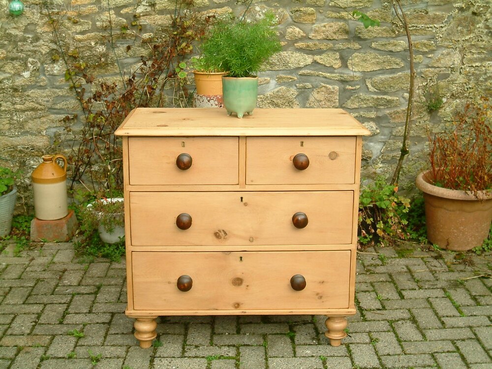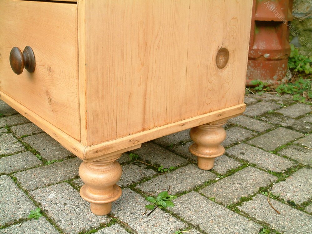 A beautiful, restored Victorian pine chest of drawers, circa 1870, on heavy turned supports. An excellent, sturdy chest. Restored runners and bearers, so drawers glide easily in their recesses. Drawers with all round dovetail construction and timber bases. Original escutcheons and feet. Fine panelled back. Wax finish. A superb old pine chest.Width 43″