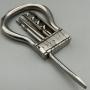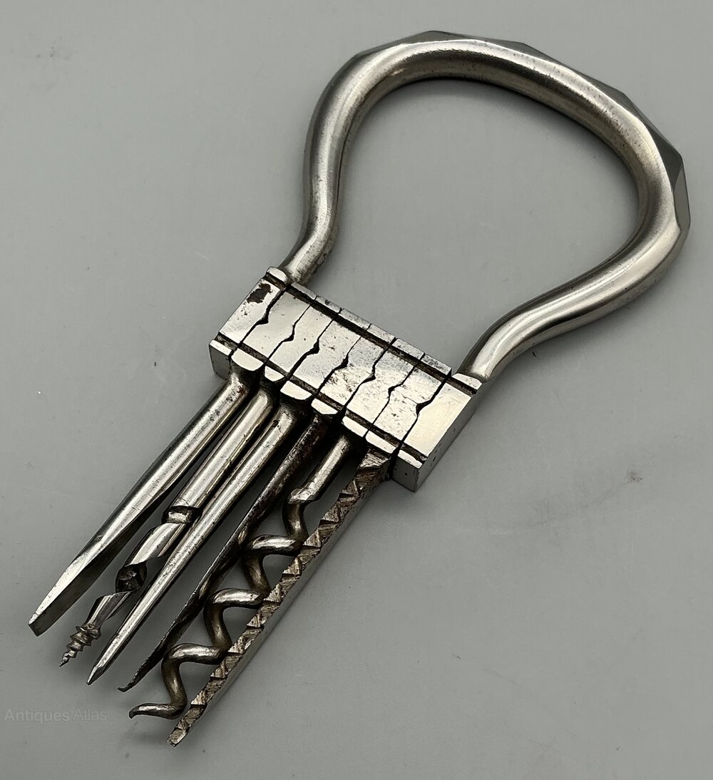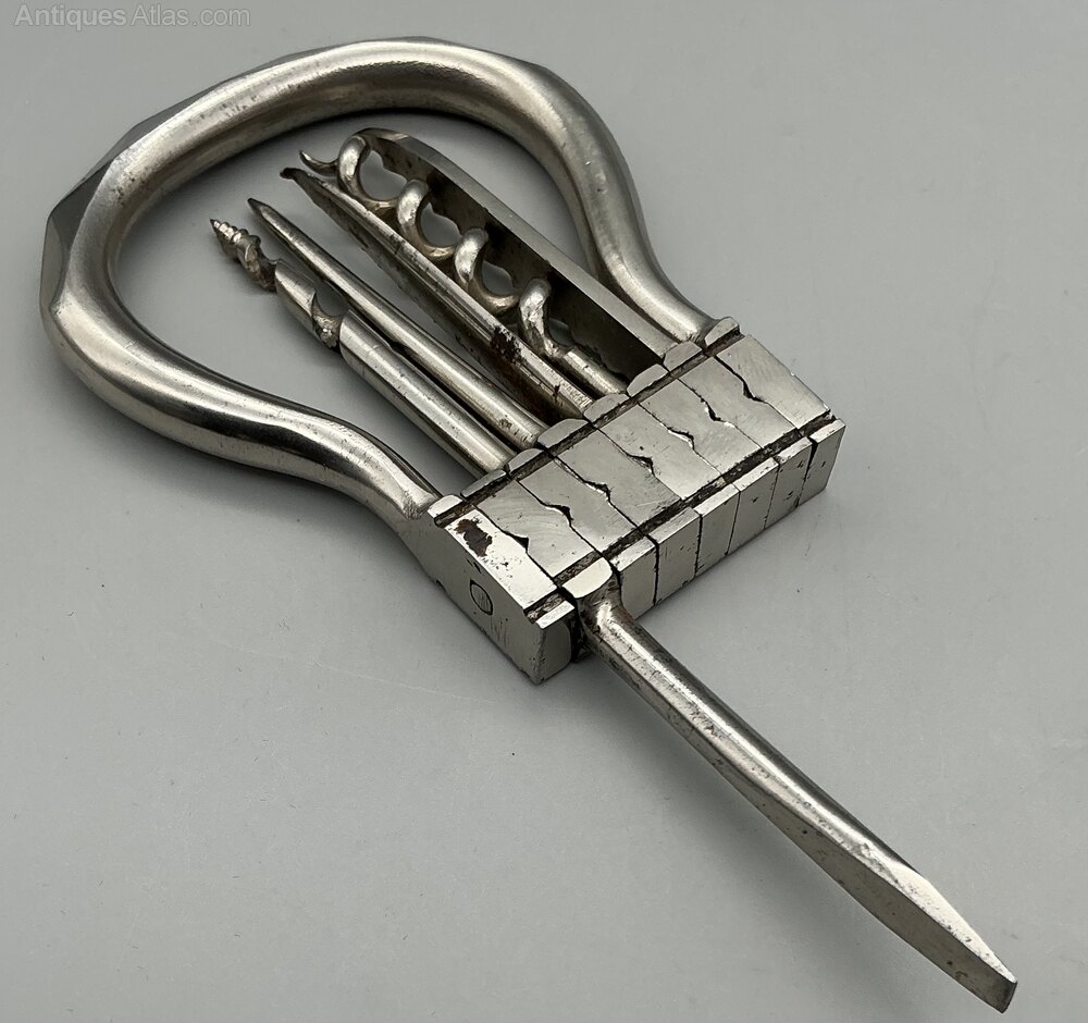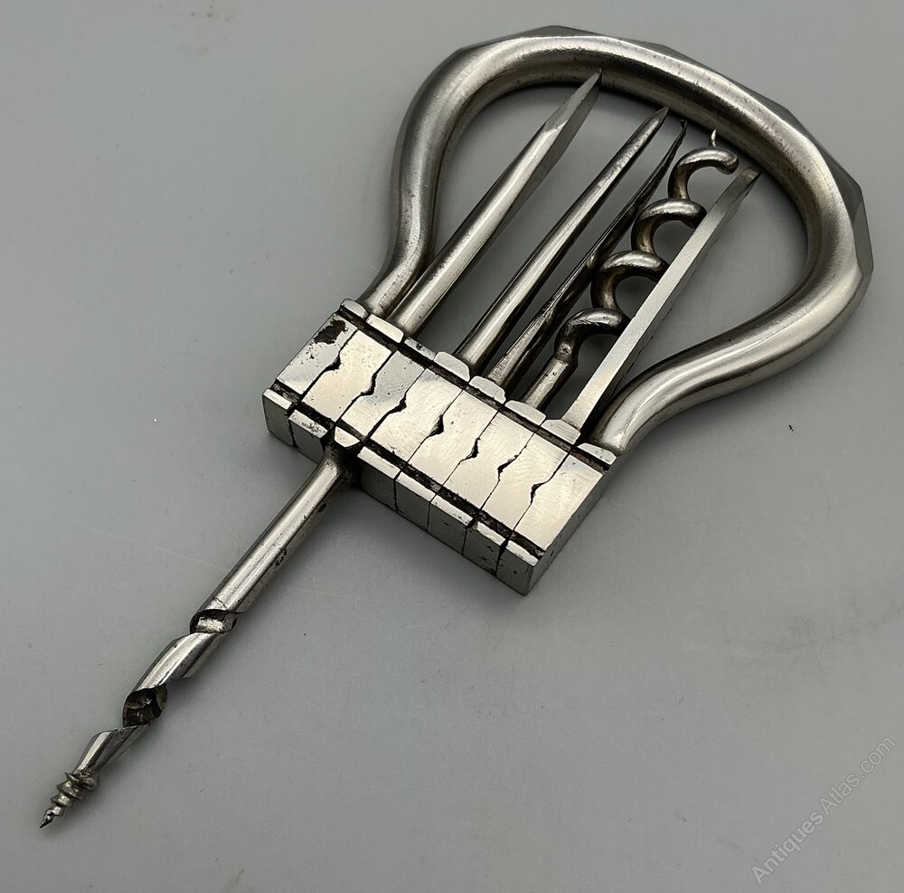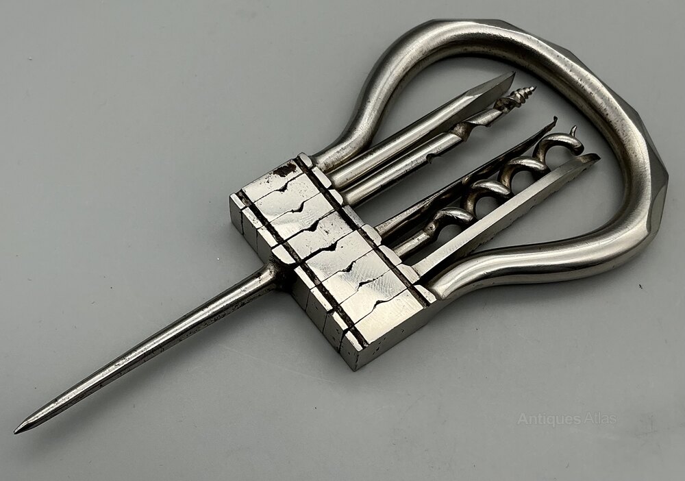 A rare and highly desirable late 19th-century bow corkscrew, an exceptional six-tool combination example and a particularly hard-to-find form. Crafted in iron with a classic bow handle, it features multiple fold-out tools demonstrating the ingenuity and skilled workmanship of the period.This example comes complete with its original leather pouch, displaying beautiful surface character and a rich aged tone. The corkscrew sits neatly within, retaining a pleasing patina and good function. Early multi-tool corkscrews of this type are scarce, and even more so when accompanied by their original case.