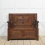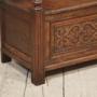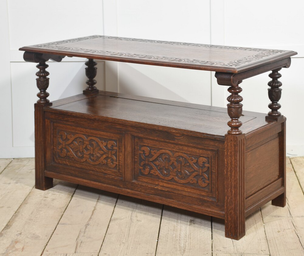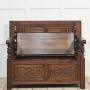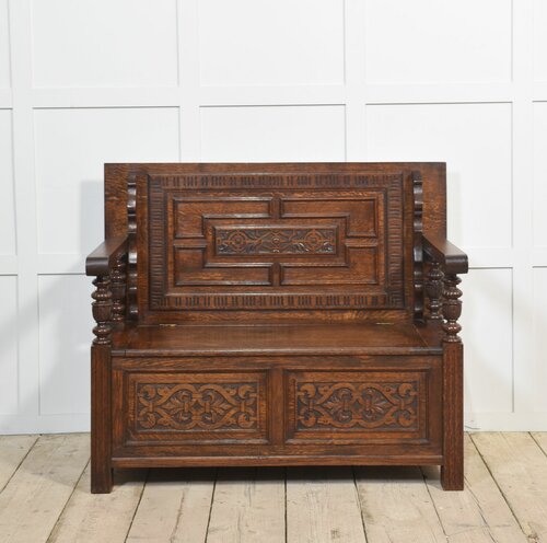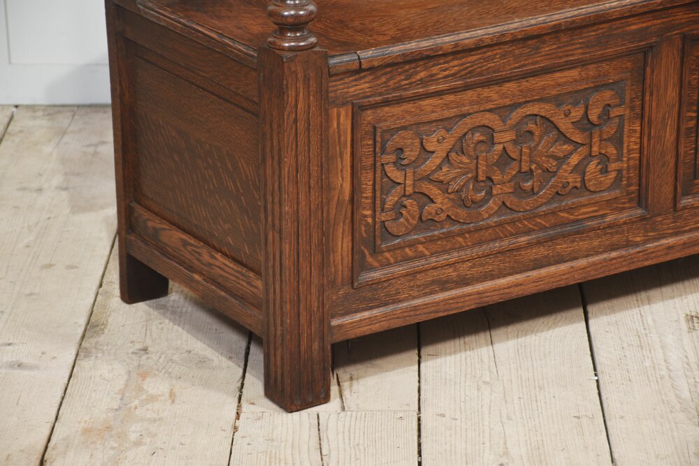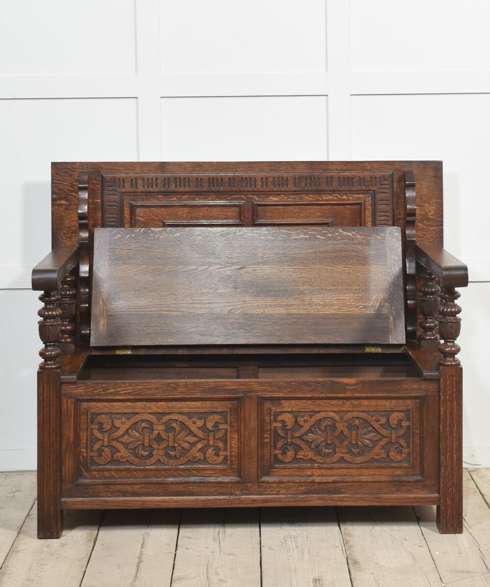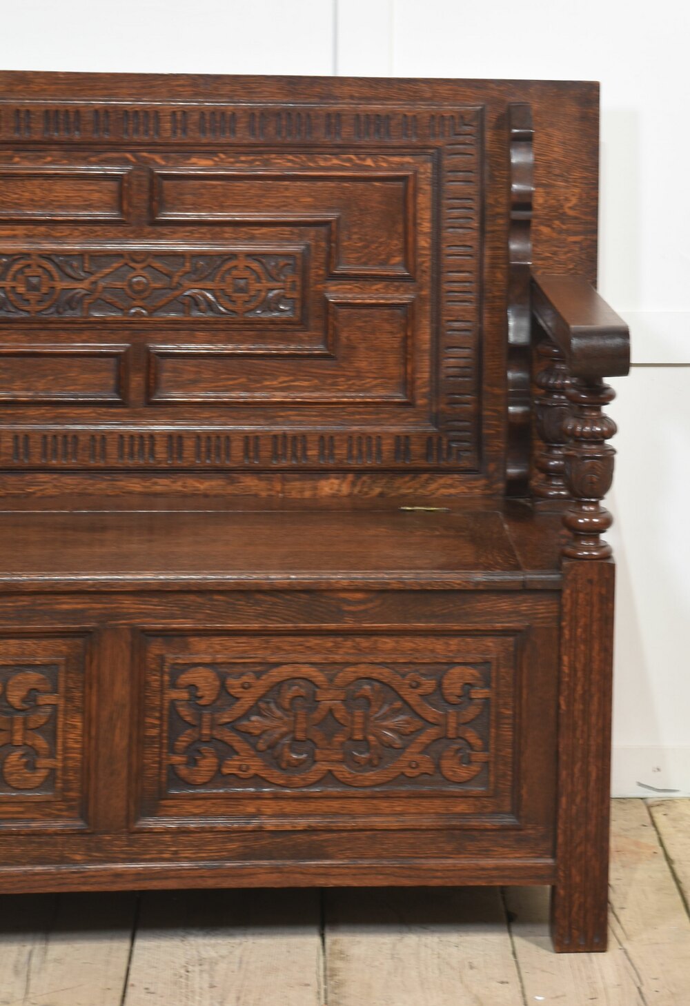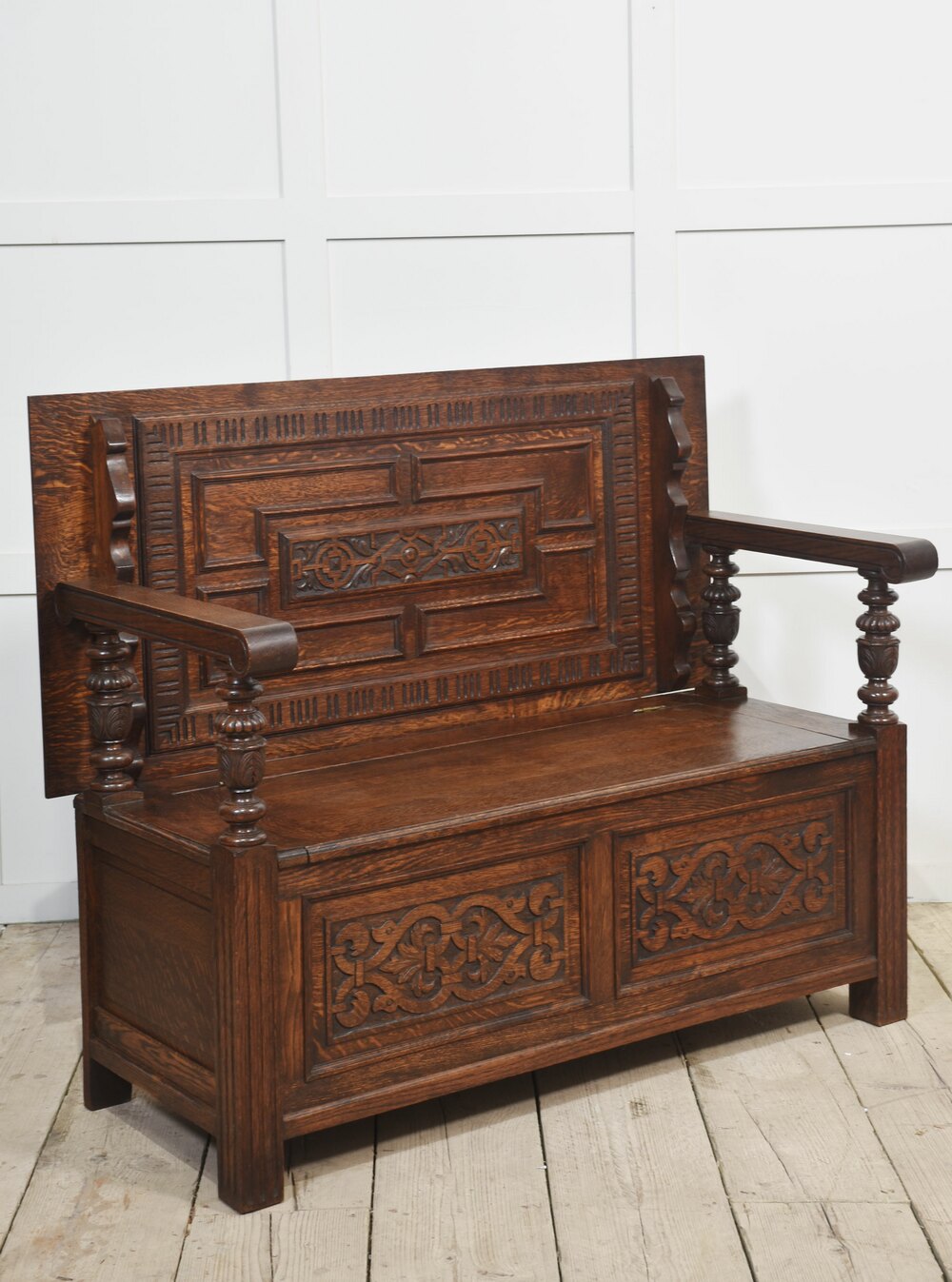 Carved oak monk’s bench/hall bench. The solid oak hinged top with geometric carvings. To the raised scrolling arms with turned uprights. The solid oak seat is hinged and opens to reveal the uninterrupted storage space inside.Dimensions