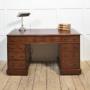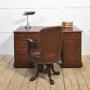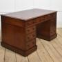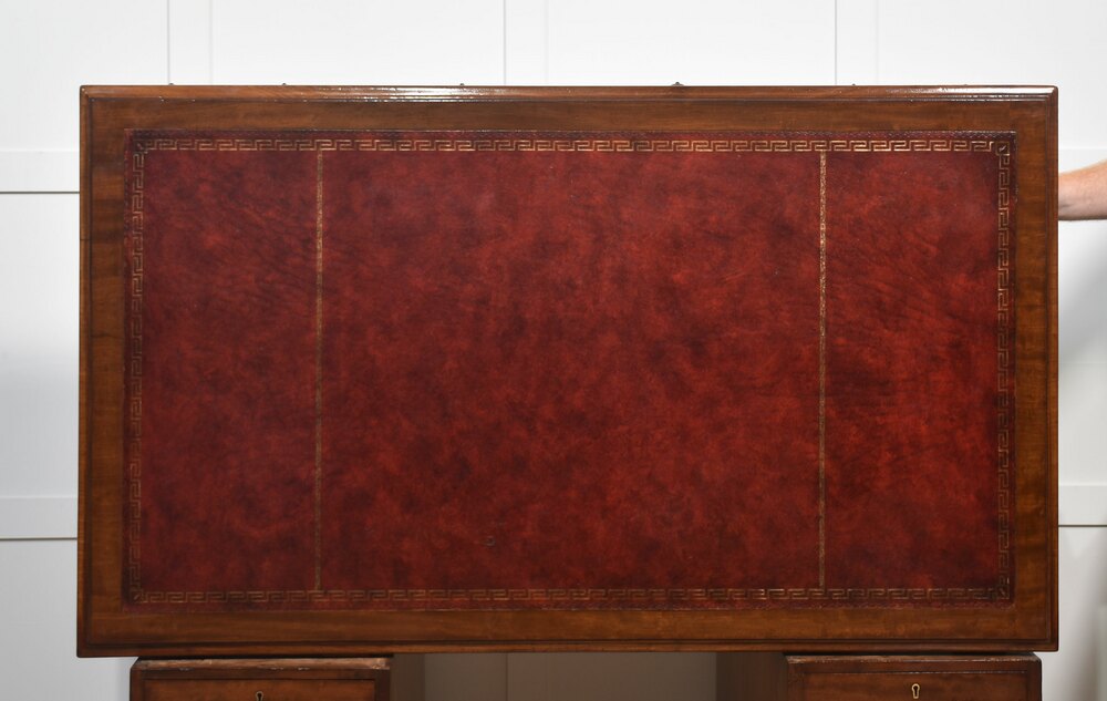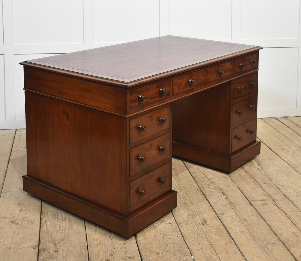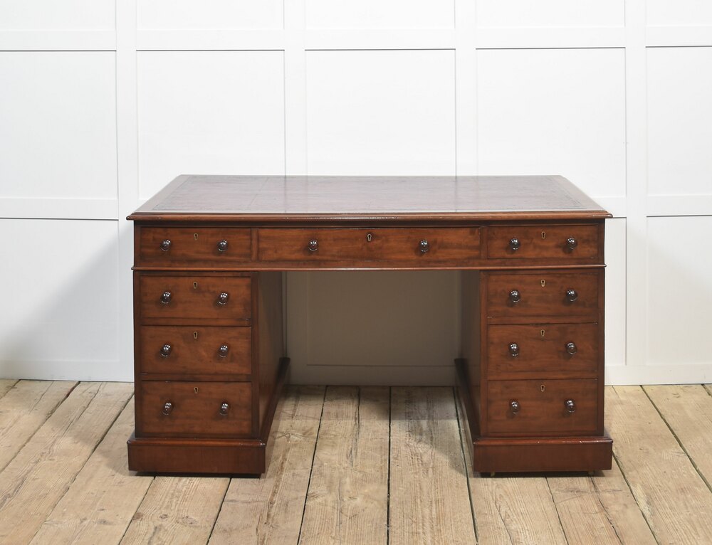 Mahogany twin pedestal desk, the moulded square edge top, inset with tooled hide, above one large and two short frieze drawers. The pedestals having an arrangement of graduated drawers. All fitted with knob handles raised on a plinth base.Dimensions