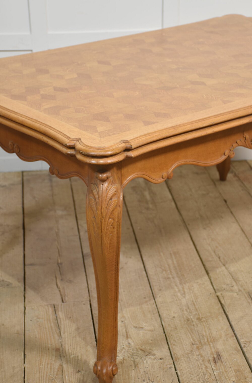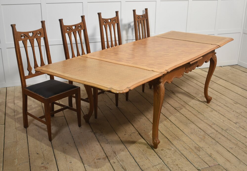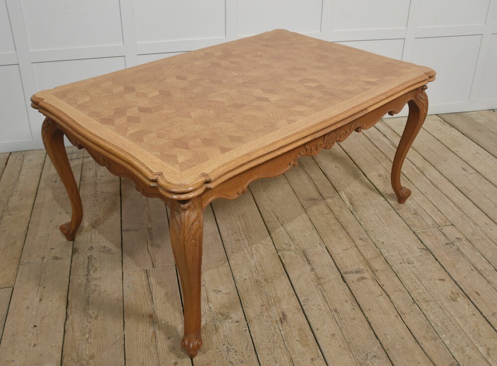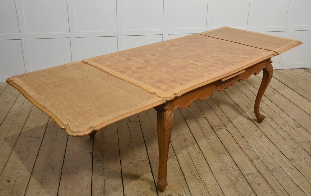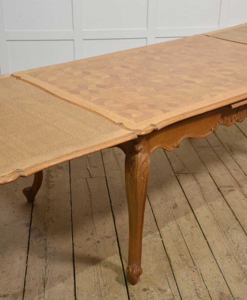 French Provincial style draw leaf dining table, the oak parquet top with two pull-out leaves above the shaped carved apron. All raised up on cabriole legs.Dimensions