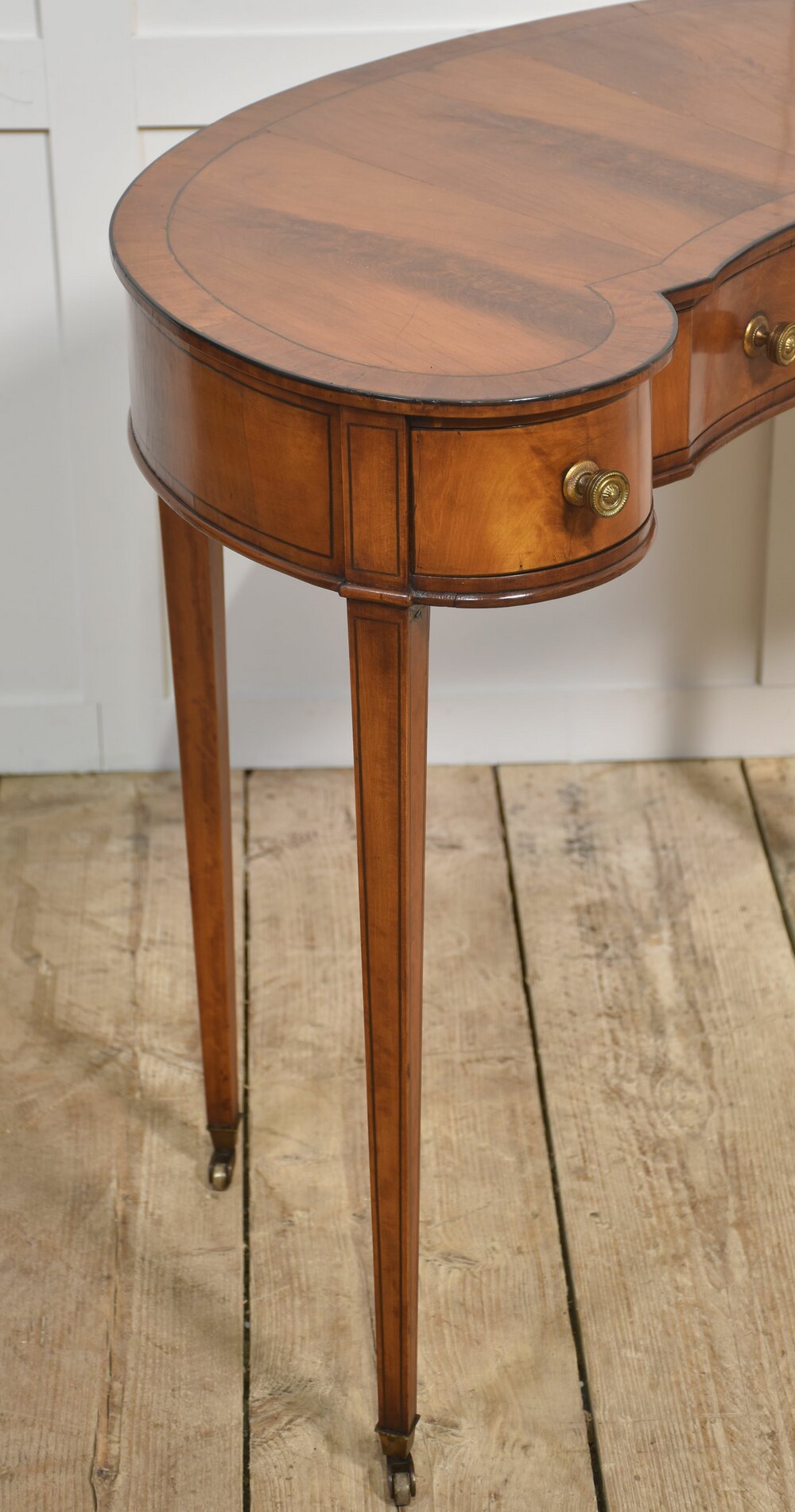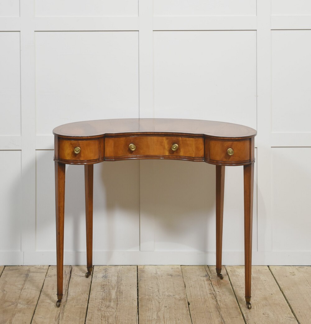 Mahogany lady’s dressing table, the kidney-shaped top, above three frieze drawers. Raised on square tappering supports terminating in brass castors.Dimensions