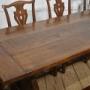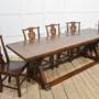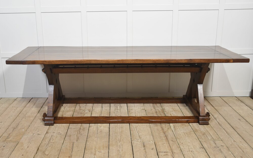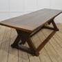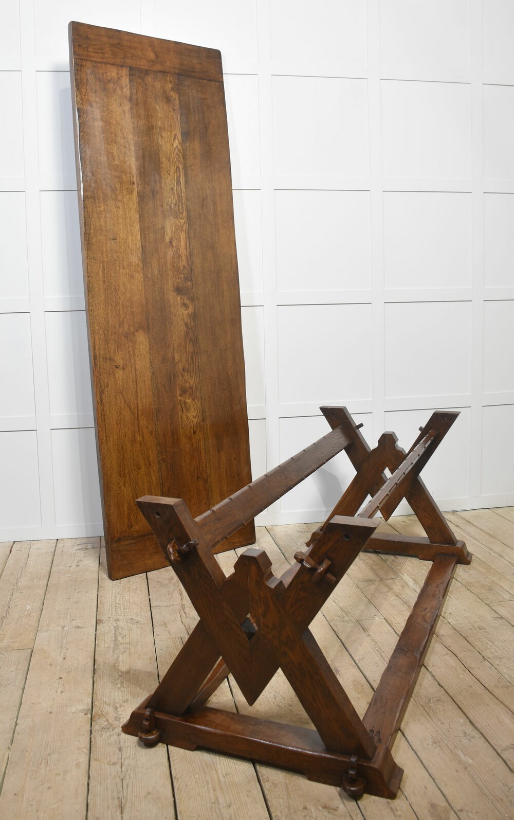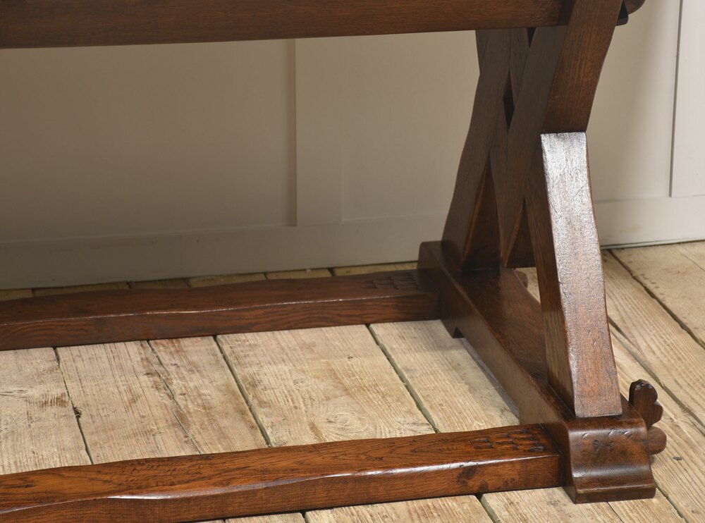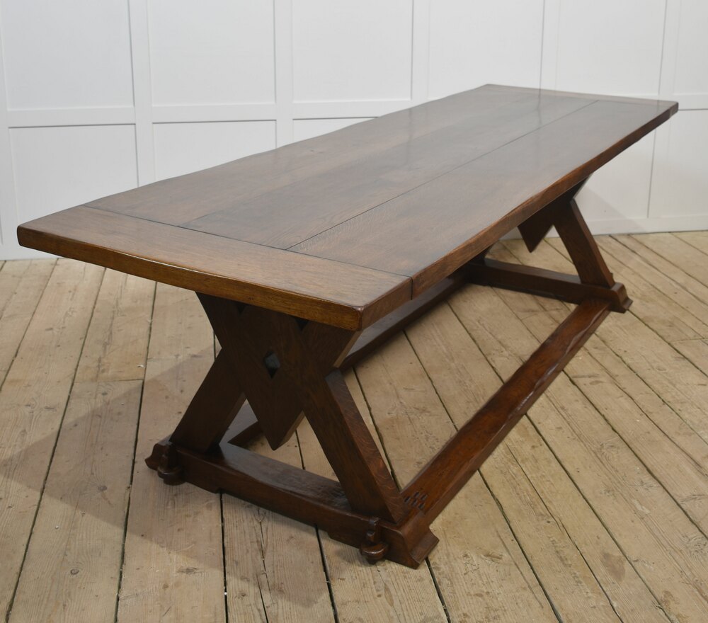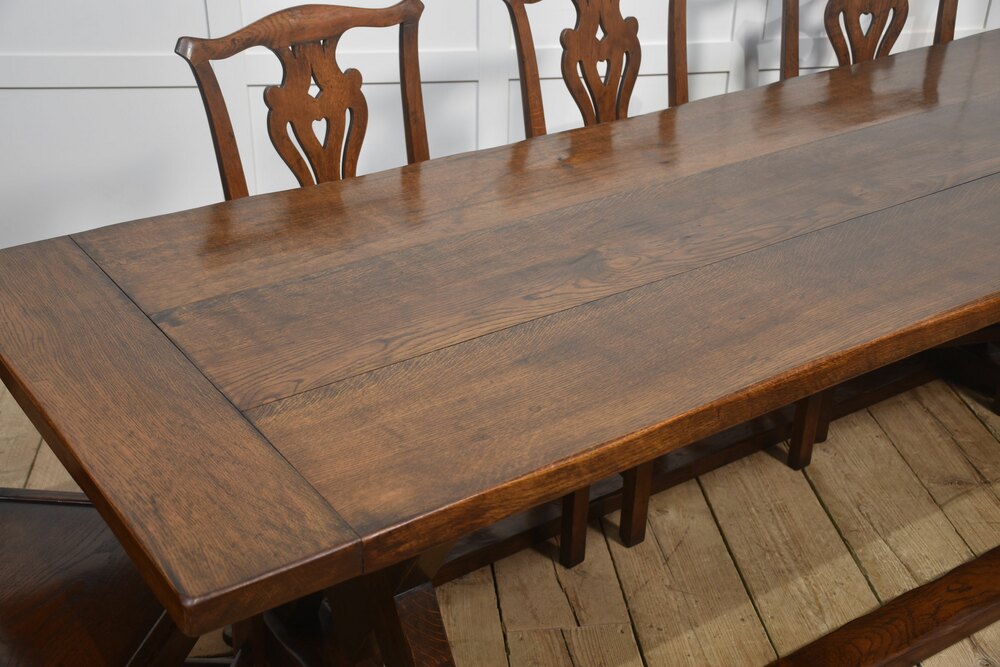 Large oak refectory table, the thick top with cleated ends raised up on square and compass slab ends united by stretchers.Dimensions